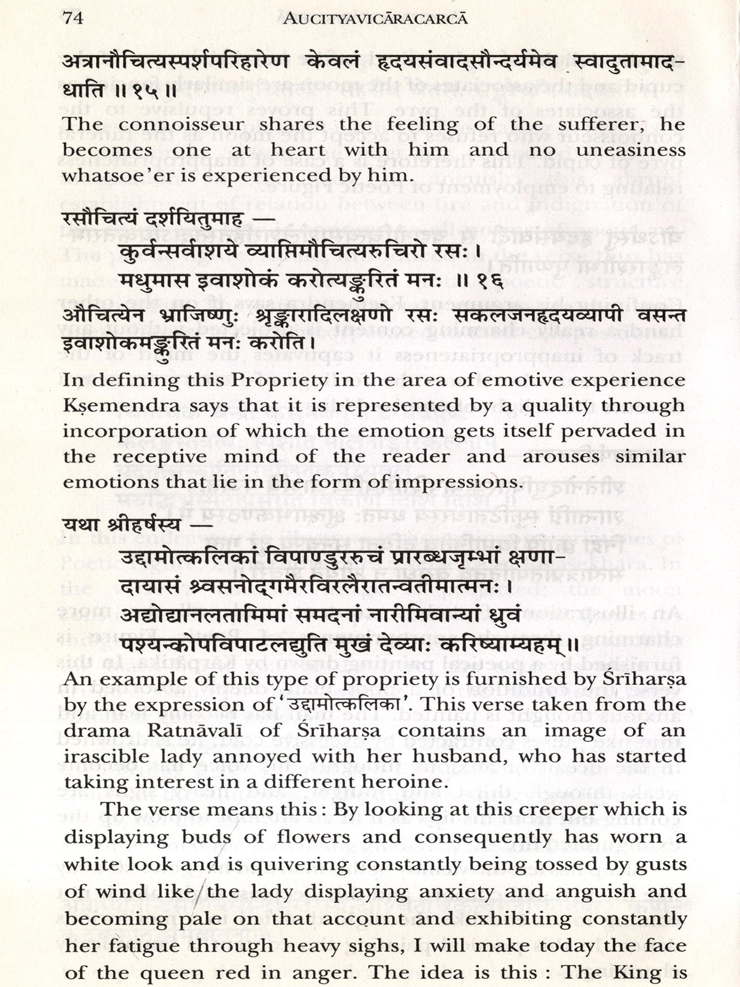 Sanskrit Poetics gets its start in the speculations of the seers of the Rigveda, who introduce for the first time the concept of 'Rasa', the corner-stone of Indian Aesthetics, and, at the same time, recognise the importance of the art of projecting the symbolic content, as also of demonstrating literary craftsmanship. The Vedic reference to the soul as enjoying the flavour and essence of 'Rasa' constitutes possibly the foundation of Indian Aesthetics: it reveals that the Vedic poets had a true appreciation of the internal character of Aesthetic Experience (Av. X.8.44). In one of its beautiful verses the Rig Veda casts a sarcastic fling at the person, who is satisfied only after seeing the external texture of poetry, but does not penetrate deep into that texture, so that the surprisingly beautiful inner content can be experienced; at the same time, this verse showers profuse praise on the person of aesthetic sensibility to whom alone the beauty of the implied meaning reveals itself. The implicit content, thus, is emphasised, but the Vedic seer takes care to see that the former also is given its due. It bursts forth with the exclamation: "when men of wisdom create verse after winnowing words, as barely grains are swifted by means of a winnowing basket, then men of equal sensibility recognise the meaning. In such verses blessed glory is enshrined (Rv.x.71.1-2)".