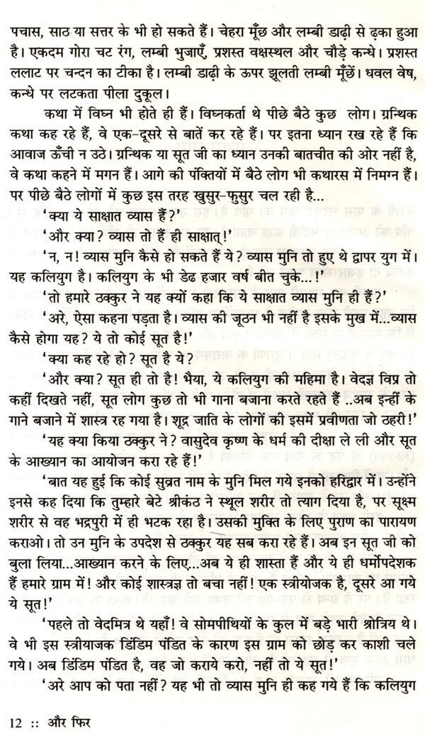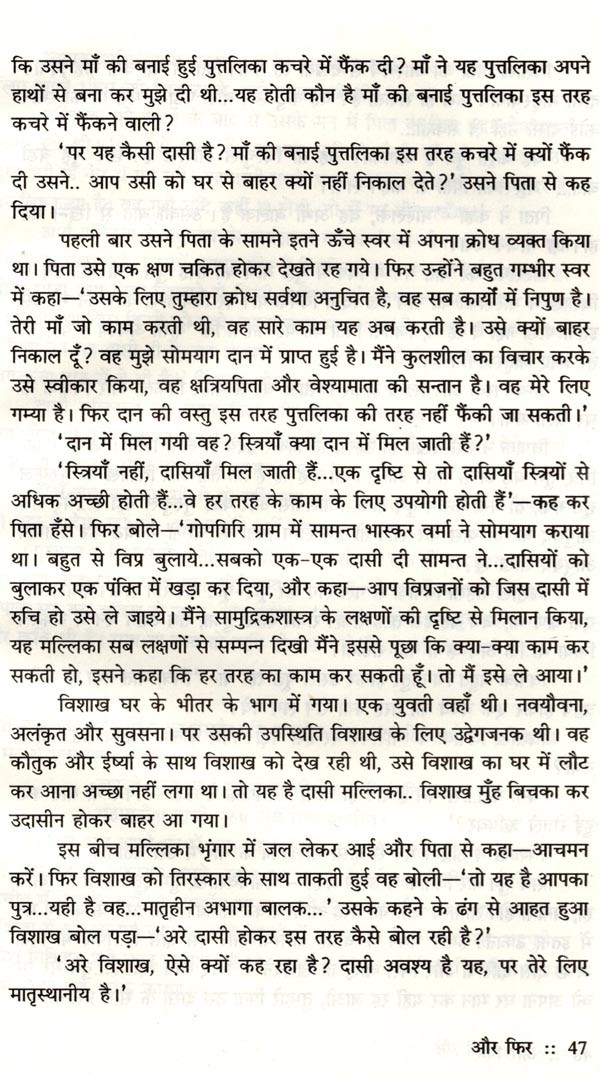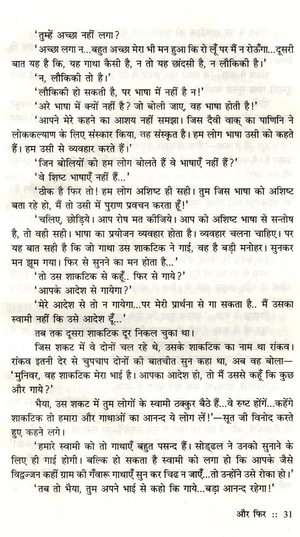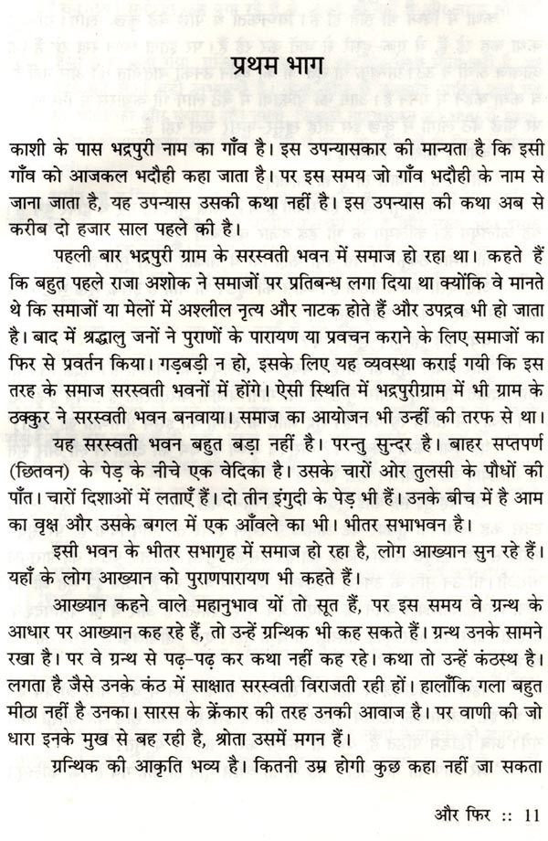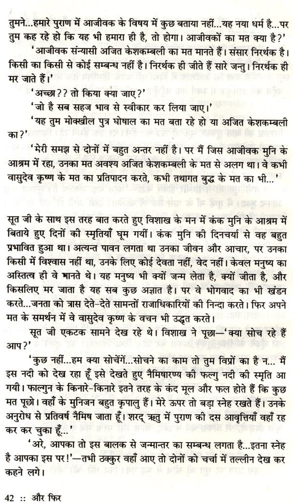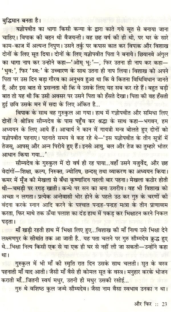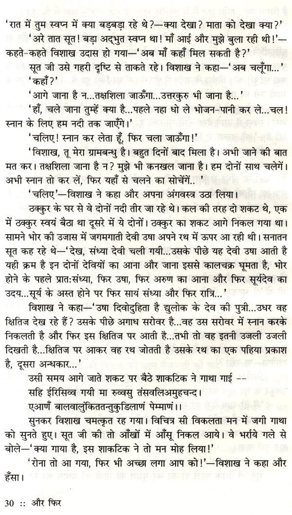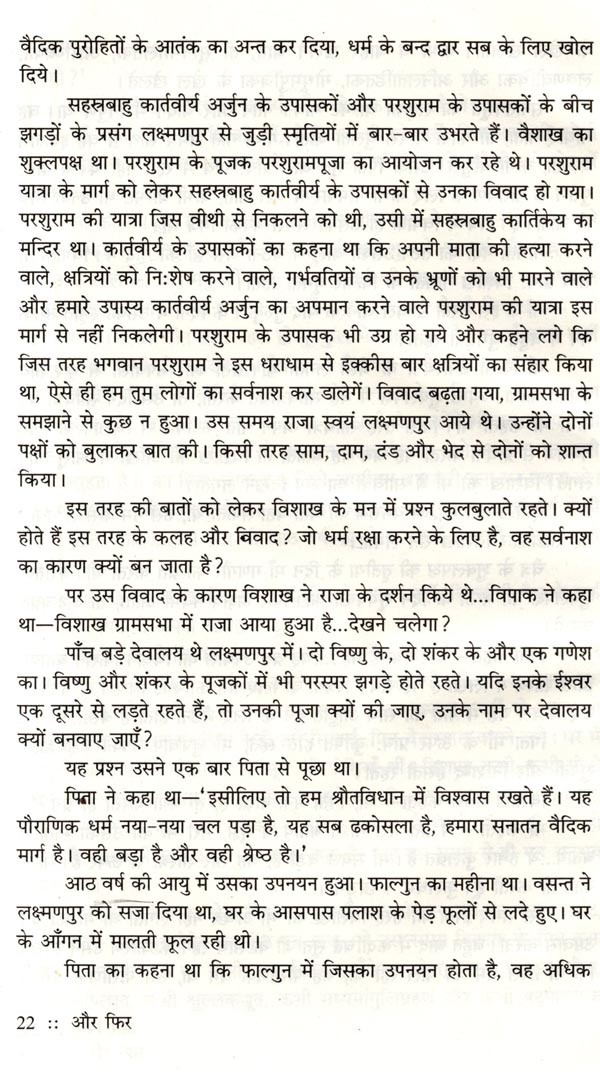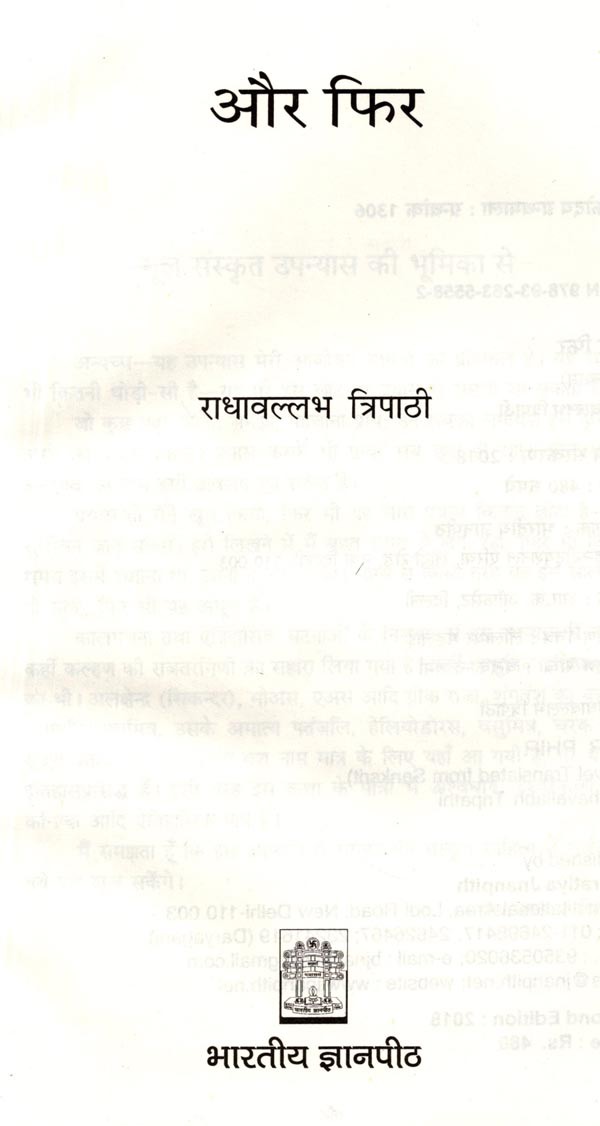 और फिर' राधावल्लभ त्रिपाठी के मूल संस्कृत में लिखे उपन्यास का हिन्दी रूपान्तर है। संस्कृत की श्रेष्ठ औपन्यासिक कृति के रूप में सम्मानित यह उपन्यास आज से दो हजार साल पहले के मध्यदेश और कश्मीर की सजीव झाँकी प्रस्तुत करता है। मातृत्वग्रन्थि से उत्प्रेरित नायक विशाख की उत्तरापथयात्रा उसके जीवन संघर्ष और अन्तः संसार को नालंदा और तक्षशिला के विद्यावैभव और सांस्कृतिक उन्मेष से जोड़ती हुई कश्मीर में पर्यवसित होती है। भारतीय जनमानस तथा लोकजीवन की अन्तरंग अनुभूतियों का संसार उजागर करने वाला यह उपन्यास चेतना के ऊर्ध्वारोहण तथा कला, साहित्य और संस्कृति की साधना का अनूठा नमूना है। संस्कृतसाहित्य के जाने माने अध्येता राधावल्लभत्रिपाठी अपनी औपन्यासिक कृतियों में काल के आवर्तन और विवर्तन का निरूपण करते हुए अतीतरस का नवसंधान करते हैं, तथा हजारीप्रसाद द्विवेदी की उस उपन्यास यात्रा में नये पड़ाव रचते हैं, जिसमें हास्य, व्यंग्य, विनोद की बहुवर्णी छटाएँ मानवीय अनुभूतियों के संसार को सम्पन्न बनाती हैं।