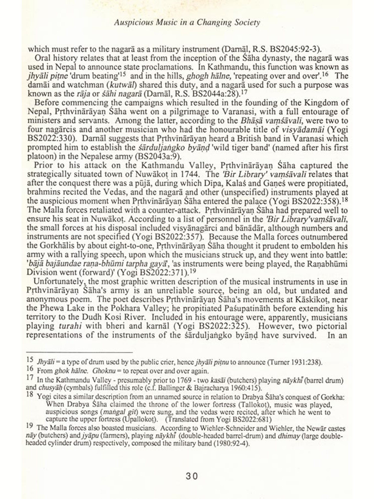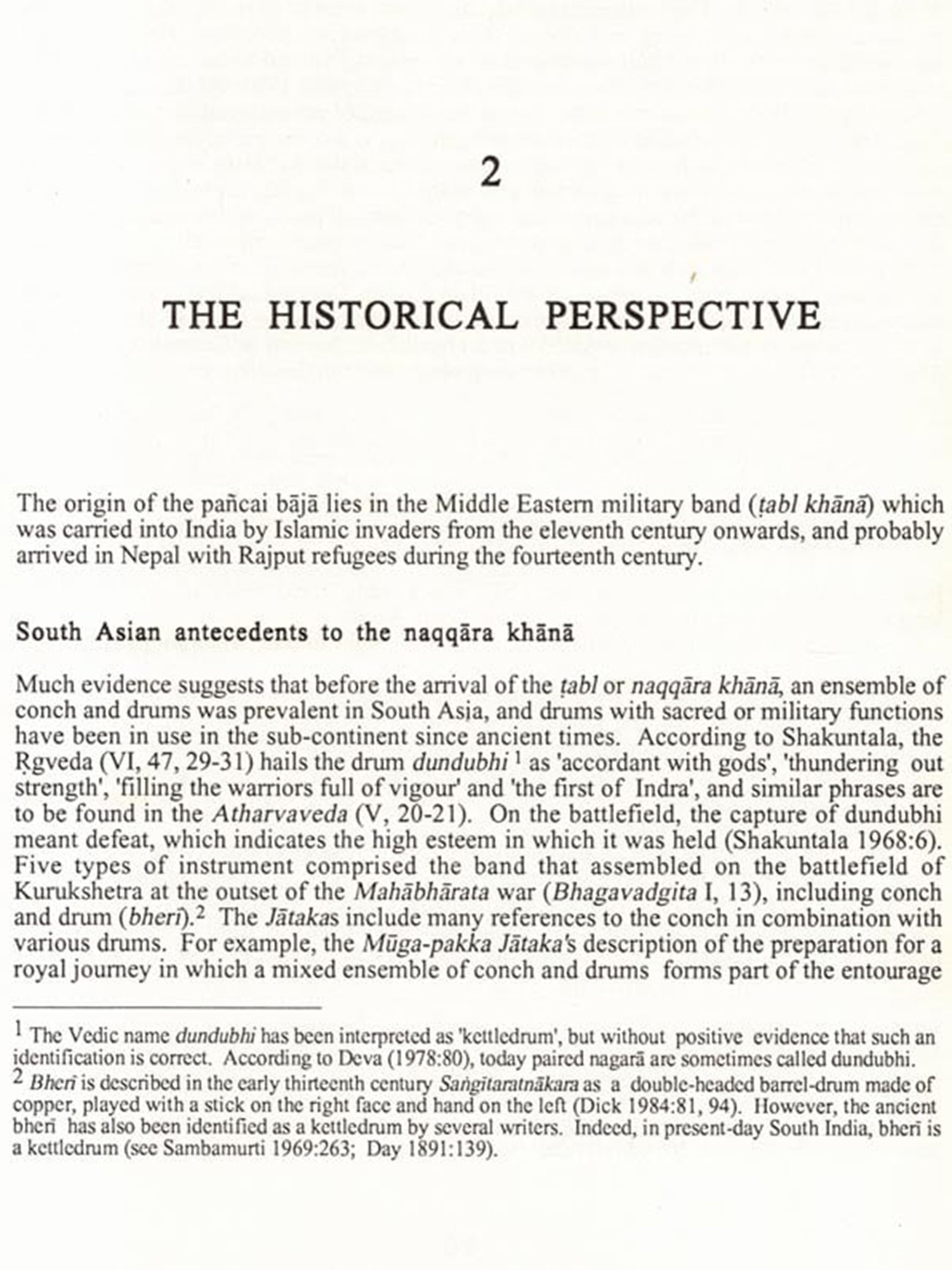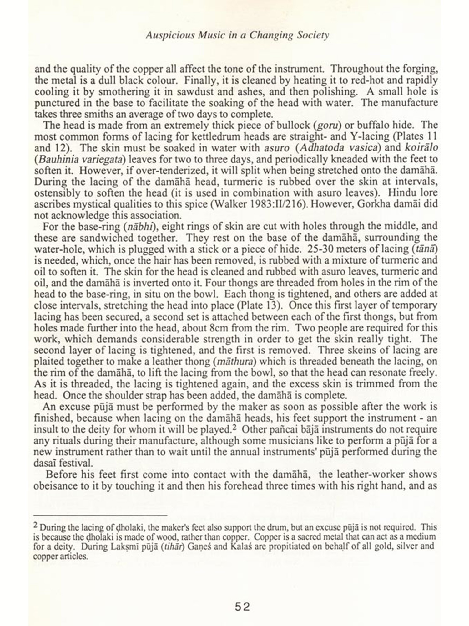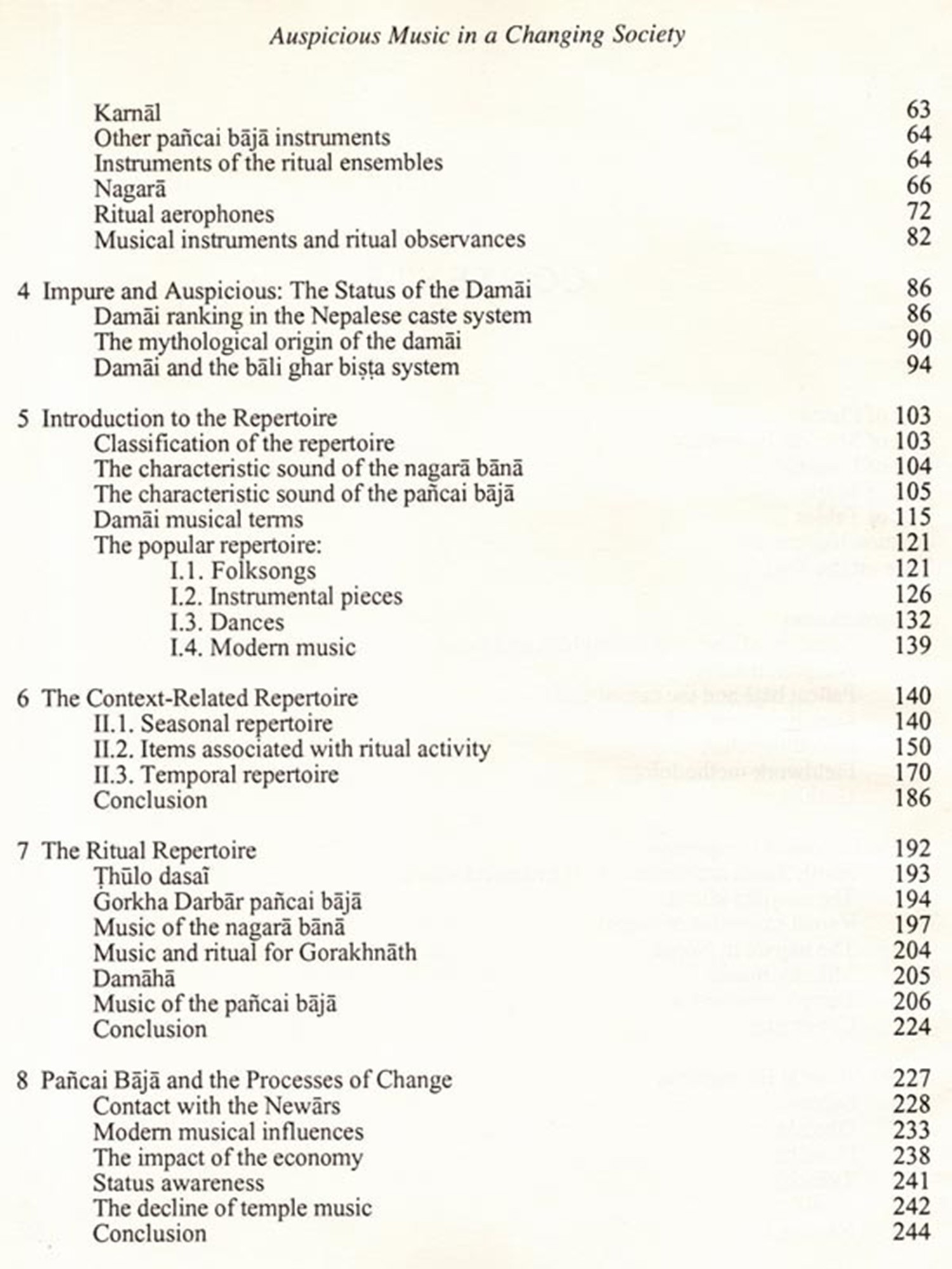thirty culturally and linguistically distinct ethnic groups. Within this immense cultural diversity, the paficai baja is a common feature of village life throughout much of the country and for a large proportion of Nepalese minority groups. It is a mixed ensemble of wind instruments (sahanai, narsinga, karnal), drums (damähä, dholaki, tyämko), and cymbals (jhyäli or jhyamța). The ensemble is found, with regional variation, across the country from east to west, and from the Terai in the south to the mid-altitude dwellers of the Himalayan foothills (pahad), wherever Indo-Nepalese castes have settled. Only amongst the high-altitude dwellers, such as the Sherpas and Tibetan peoples of the northern border is the ensemble not in use. The band was introduced to Nepal possibly as early as the fourteenth century, by Rajputs fleeing from Muslim domination, and other Hindu migrants from North India. The new settlers brought with them agricultural and technological innovations and all the rich traditions of their cultural heritage. The latter included the naubat or naqqara khänä, a raucous ensemble of shawms and kettledrums of Middle Eastern origin, which the Hindus had adopted from their Muslim compatriots, and which, once Nepalized, became the pañcai bājā Pañcai bājā is played exclusively by a caste of professional musicians - the damai - whose name is taken from the large kettledrum which characterizes the band, the damähä. Their supplementary caste occupation is tailoring. Together with other musician and occupational castes, e.g. kami (blacksmiths), särki (tanners and shoemakers), bädi (musicians, tanners and drum-makers), and gäine (itinerant minstrels), the damai have an extremely depressed social status, being the outcasts of society, from whom food and water may not be accepted, and contact with whom demands ritual purification. Despite their untouchability, the damãi are thought to be an auspicious caste (saguni jät), and as both tailors and musicians, they provide indispensable ritual services. In the Kathmandu Valley, the Newär kusle (or jugi) caste of tailor-musicians have some muste groups of a variety of other castes, and providing the main for wedding processions, on clarinet, tr trumpet, euphonium, and anare, tenor and bass drums in place of the old-fashioned traditional instruments. The uses of the palicai bäjä are diverse. It is a fundamental requirement for all Hindu rites of passage such as weddings and the sacred thread investiture ceremony for young high caste boy's, vratabandha It plays for the calendrical cycle of festivals, both agricultural teg hile jatra, bajaune ropal), and sacred (eg. caite and thülo dasais, Krana astami), und leads Civt procesions and festivities of all sorts leg. the birthdays of the royal family, the triumphal procession of the successful candidate in a local (paricayat) election). However. although a large proportion of its repertoire is purely secular entertainment music (eg. folk song tunes, film music), the contexts in which the pañcai bäjä plays are, virtually without exception, sacred or semi-sacred in character, and the ensemble maybe seen to be fulfilling a ritual The dimple commitments of the damai include providing music for the daily püjas (offerings), during blood sacrifices and for other ritual acts on behalf of the presiding deity, Ind fortual processions (jätra) of deities during festivals. The composition of ritual ensembles varies considerably, the minimum requirement being a single fagara (large kettledrum). In Central Nepal, a common nucleus ensemble consists of nagara, rasa (sahanai), and karnal, which may be expanded by the addition of bhenge of natural trumpets, such as dhop banā, bijuli bână (also known as näg-beli bäjä), bheri, sikhår, bang and kähal. This type of ritual music is for divine, rather than human consumption. The question of the function of the ensemble is a complex one. Certainly, in all contexts it appears to have an auspicious role, but it also acts as a signaller (eg. to announce the departure of the bride), and as a status symbol a family's economic standing may be determined by the number of musicians playing for their son's wedding. An aim of this musical ethnography is to define the nature of the auspiciousness of the paficai bäjä. Today, as Central Nepalese village society changes more rapidly than ever before, the pañcai baja is also 'modernizing - utilizing Western band instruments rather than the traditional locally-made ones, playing film and radio music rather than the old folk rägas, and demanding cash payment in remuneration. Traditionally, the auspicious nature of the band renders it a ritual necessity, but there are signs that its functions as an entertainer and a status symbol are becoming the dominant ones, eclipsing its value as a bestower of blessings and a consecrator of ritual space. Therefore, this is also a study in musical and functional change. The study focuses on the contemporary pañcai bājā, but also considers past practices as they exist in the memories of the last generation of musicians, in order to attempt an assessment of whether or not musical change is being accompanied by functional change, and whether the auspicious basis of the pañcai bäjä is being undermined.