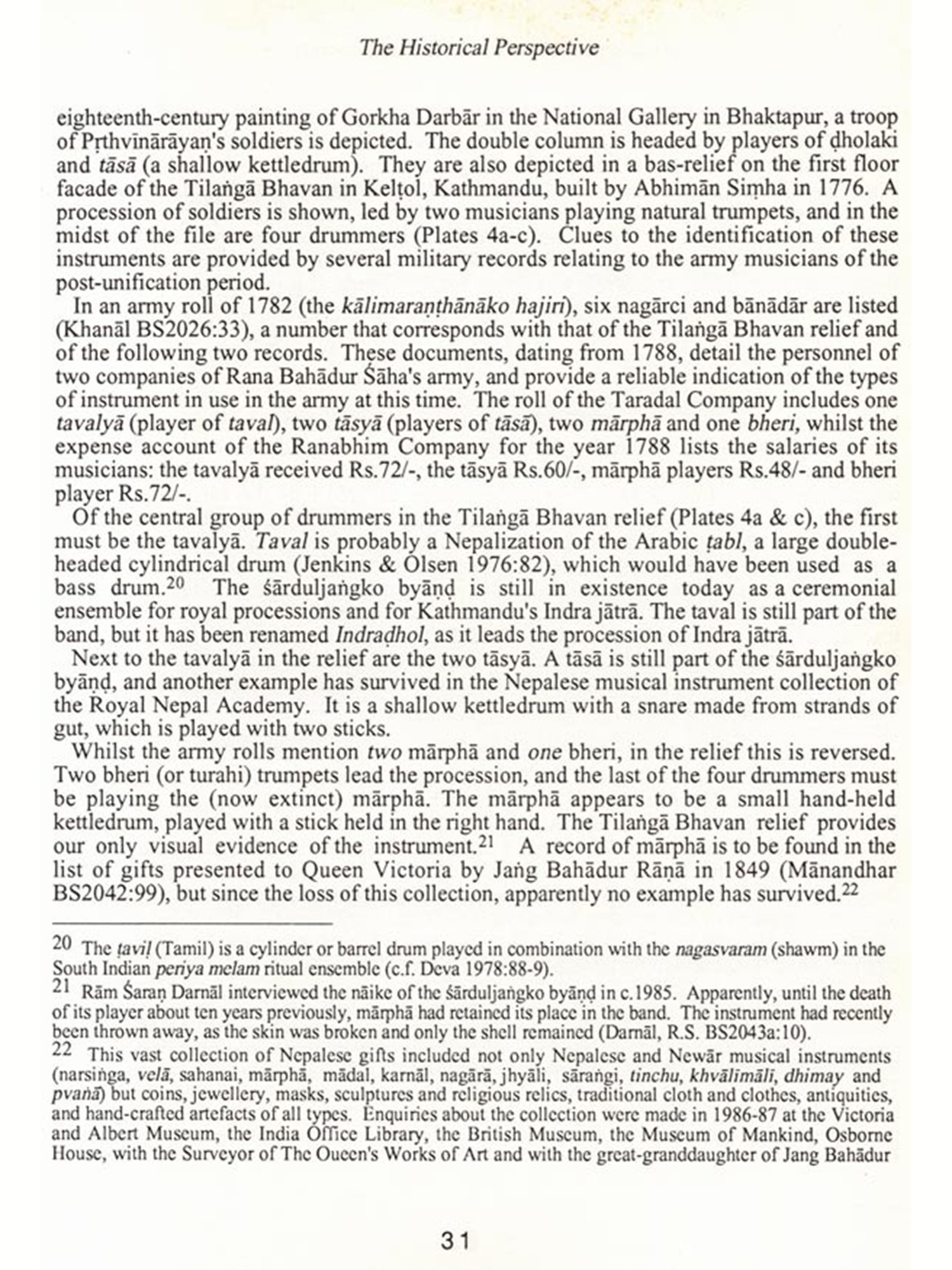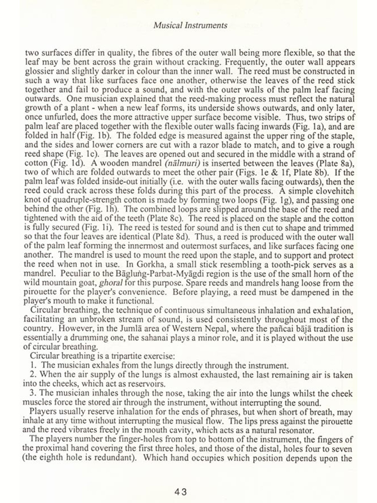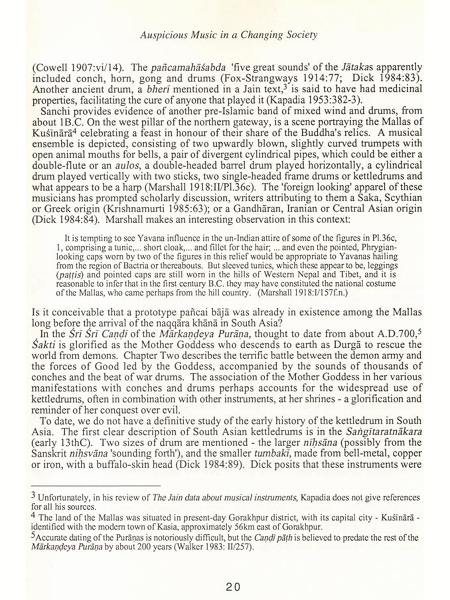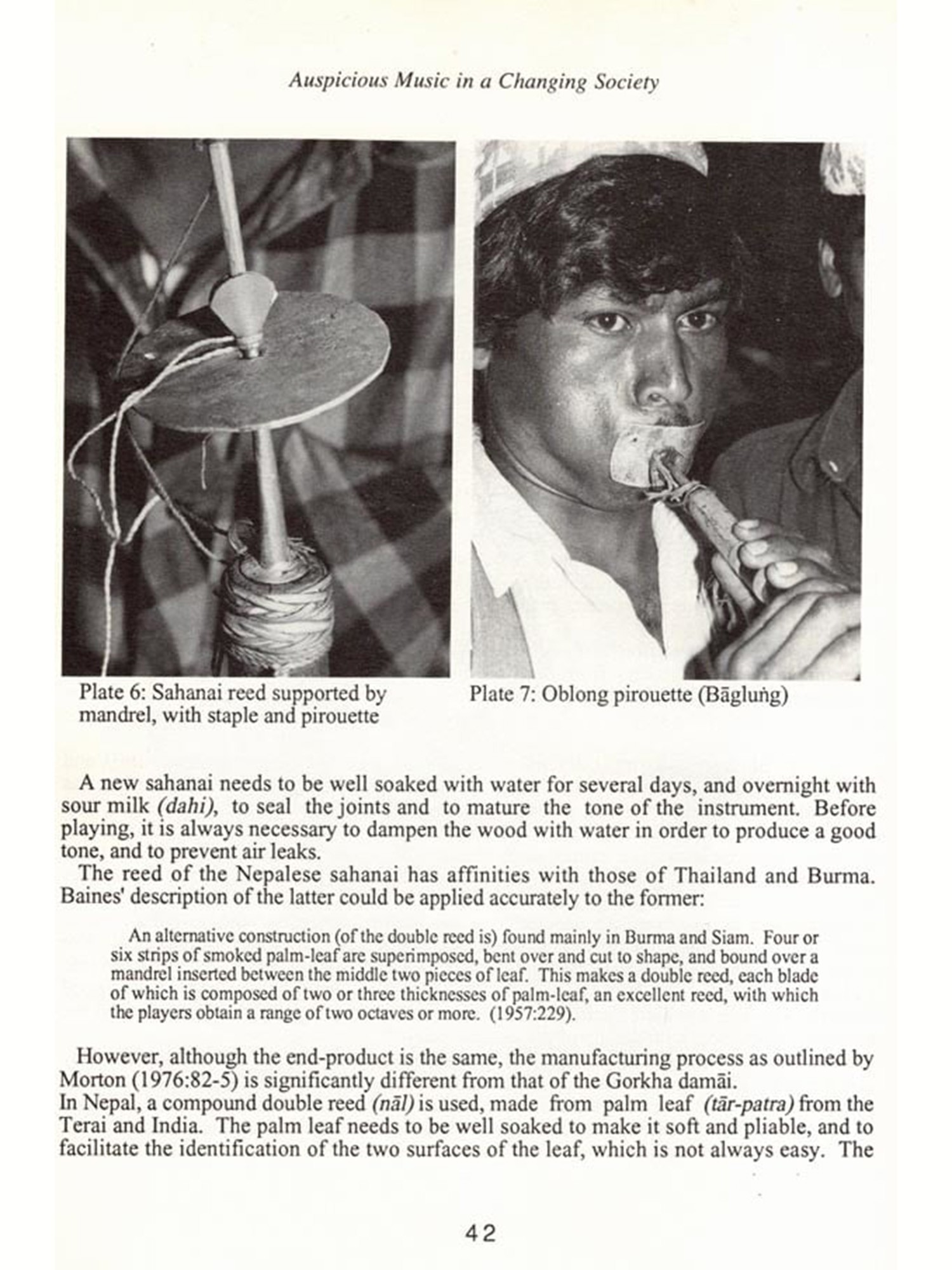 thirty culturally and linguistically distinct ethnic groups. Within this immense cultural diversity, the paficai baja is a common feature of village life throughout much of the country and for a large proportion of Nepalese minority groups. It is a mixed ensemble of wind instruments (sahanai, narsinga, karnal), drums (damähä, dholaki, tyämko), and cymbals (jhyäli or jhyamța). The ensemble is found, with regional variation, across the country from east to west, and from the Terai in the south to the mid-altitude dwellers of the Himalayan foothills (pahad), wherever Indo-Nepalese castes have settled. Only amongst the high-altitude dwellers, such as the Sherpas and Tibetan peoples of the northern border is the ensemble not in use. The band was introduced to Nepal possibly as early as the fourteenth century, by Rajputs fleeing from Muslim domination, and other Hindu migrants from North India. The new settlers brought with them agricultural and technological innovations and all the rich traditions of their cultural heritage. The latter included the naubat or naqqara khänä, a raucous ensemble of shawms and kettledrums of Middle Eastern origin, which the Hindus had adopted from their Muslim compatriots, and which, once Nepalized, became the pañcai bājā Pañcai bājā is played exclusively by a caste of professional musicians - the damai - whose name is taken from the large kettledrum which characterizes the band, the damähä. Their supplementary caste occupation is tailoring. Together with other musician and occupational castes, e.g. kami (blacksmiths), särki (tanners and shoemakers), bädi (musicians, tanners and drum-makers), and gäine (itinerant minstrels), the damai have an extremely depressed social status, being the outcasts of society, from whom food and water may not be accepted, and contact with whom demands ritual purification. Despite their untouchability, the damãi are thought to be an auspicious caste (saguni jät), and as both tailors and musicians, they provide indispensable ritual services. In the Kathmandu Valley, the Newär kusle (or jugi) caste of tailor-musicians have some muste groups of a variety of other castes, and providing the main for wedding processions, on clarinet, tr trumpet, euphonium, and anare, tenor and bass drums in place of the old-fashioned traditional instruments. The uses of the palicai bäjä are diverse. It is a fundamental requirement for all Hindu rites of passage such as weddings and the sacred thread investiture ceremony for young high caste boy's, vratabandha It plays for the calendrical cycle of festivals, both agricultural teg hile jatra, bajaune ropal), and sacred (eg. caite and thülo dasais, Krana astami), und leads Civt procesions and festivities of all sorts leg. the birthdays of the royal family, the triumphal procession of the successful candidate in a local (paricayat) election). However. although a large proportion of its repertoire is purely secular entertainment music (eg. folk song tunes, film music), the contexts in which the pañcai bäjä plays are, virtually without exception, sacred or semi-sacred in character, and the ensemble maybe seen to be fulfilling a ritual The dimple commitments of the damai include providing music for the daily püjas (offerings), during blood sacrifices and for other ritual acts on behalf of the presiding deity, Ind fortual processions (jätra) of deities during festivals. The composition of ritual ensembles varies considerably, the minimum requirement being a single fagara (large kettledrum). In Central Nepal, a common nucleus ensemble consists of nagara, rasa (sahanai), and karnal, which may be expanded by the addition of bhenge of natural trumpets, such as dhop banā, bijuli bână (also known as näg-beli bäjä), bheri, sikhår, bang and kähal. This type of ritual music is for divine, rather than human consumption. The question of the function of the ensemble is a complex one. Certainly, in all contexts it appears to have an auspicious role, but it also acts as a signaller (eg. to announce the departure of the bride), and as a status symbol a family's economic standing may be determined by the number of musicians playing for their son's wedding. An aim of this musical ethnography is to define the nature of the auspiciousness of the paficai bäjä. Today, as Central Nepalese village society changes more rapidly than ever before, the pañcai baja is also 'modernizing - utilizing Western band instruments rather than the traditional locally-made ones, playing film and radio music rather than the old folk rägas, and demanding cash payment in remuneration. Traditionally, the auspicious nature of the band renders it a ritual necessity, but there are signs that its functions as an entertainer and a status symbol are becoming the dominant ones, eclipsing its value as a bestower of blessings and a consecrator of ritual space. Therefore, this is also a study in musical and functional change. The study focuses on the contemporary pañcai bājā, but also considers past practices as they exist in the memories of the last generation of musicians, in order to attempt an assessment of whether or not musical change is being accompanied by functional change, and whether the auspicious basis of the pañcai bäjä is being undermined.