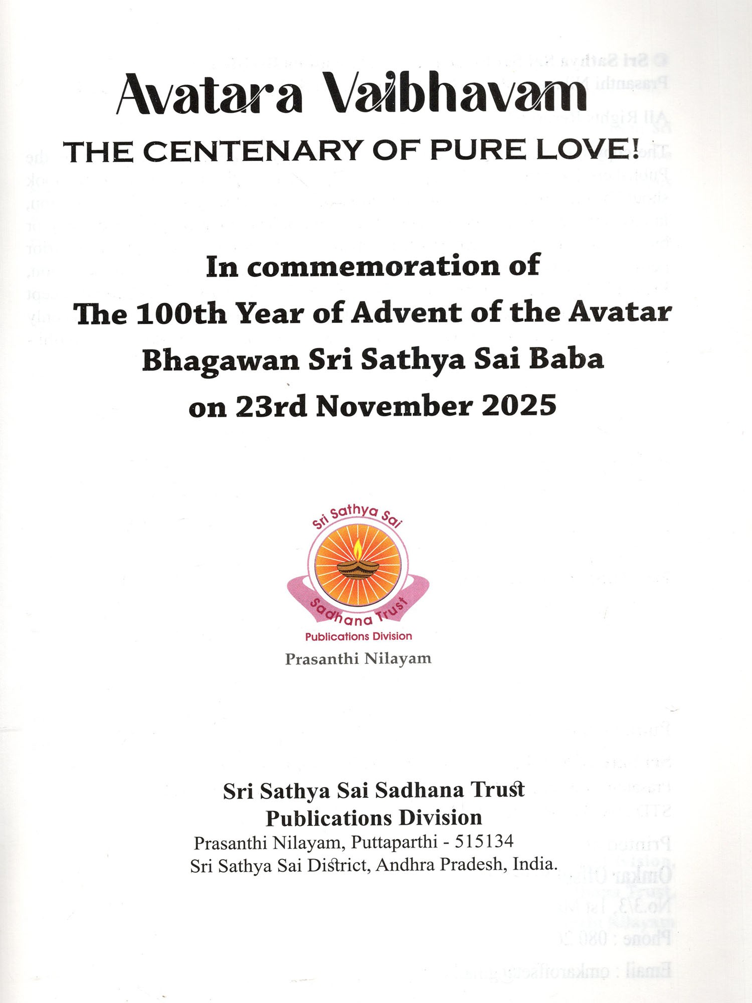 Compiled by the Sri Sathya Sai Sadhana Trust, Division, this Publications Centenary Souvenir offers a glimpse into the Divinity of the Avatar and His global mission.