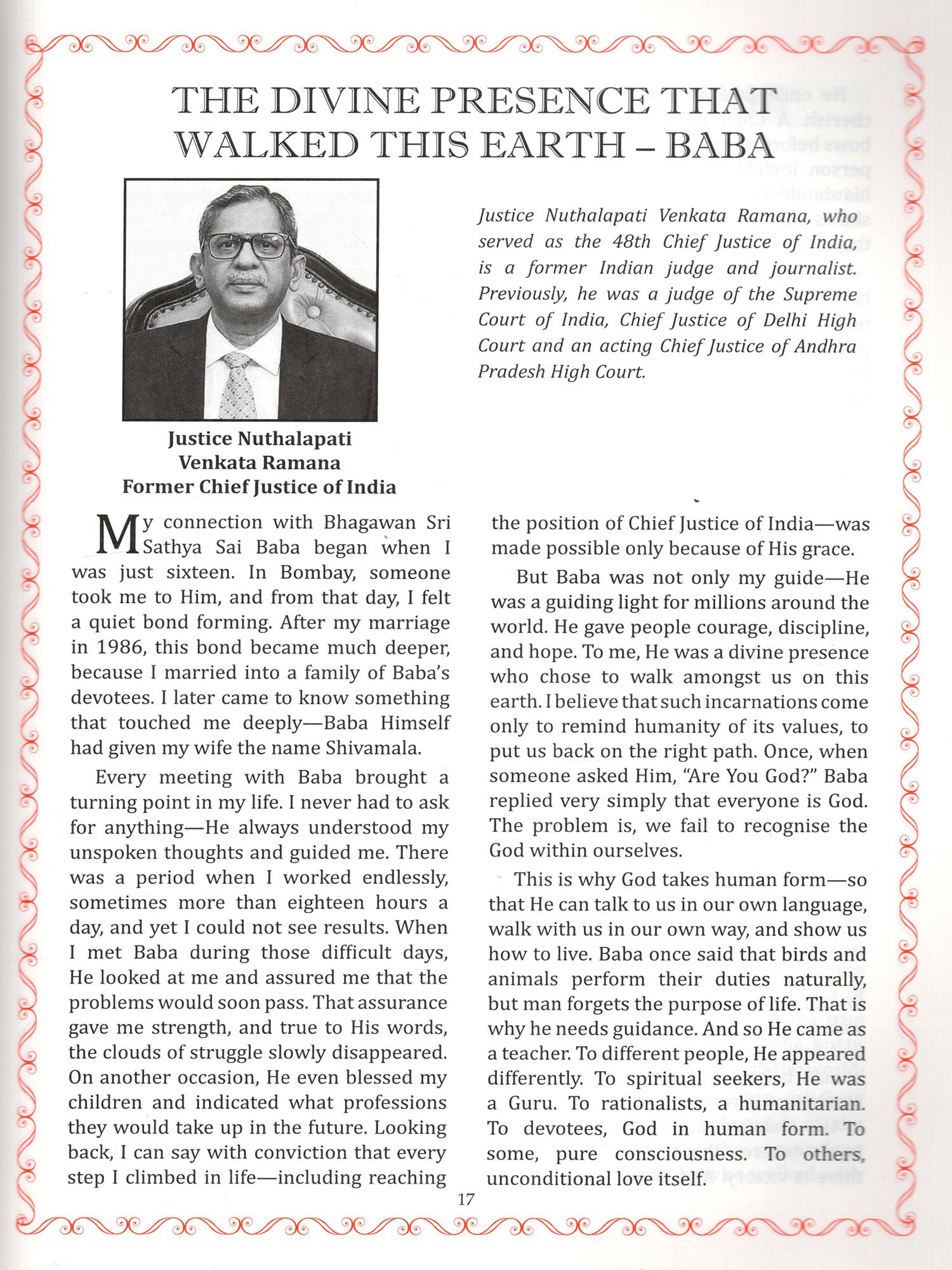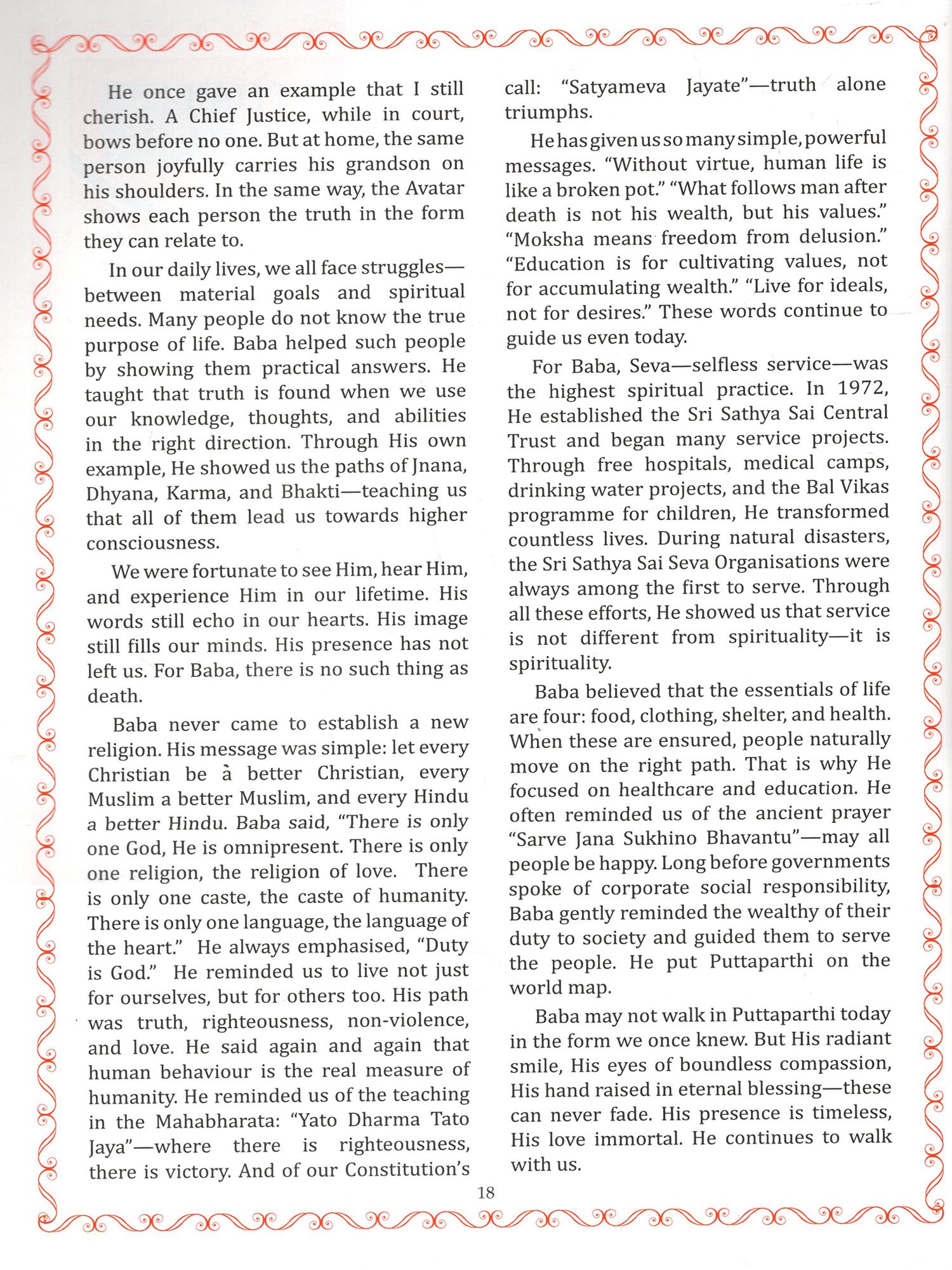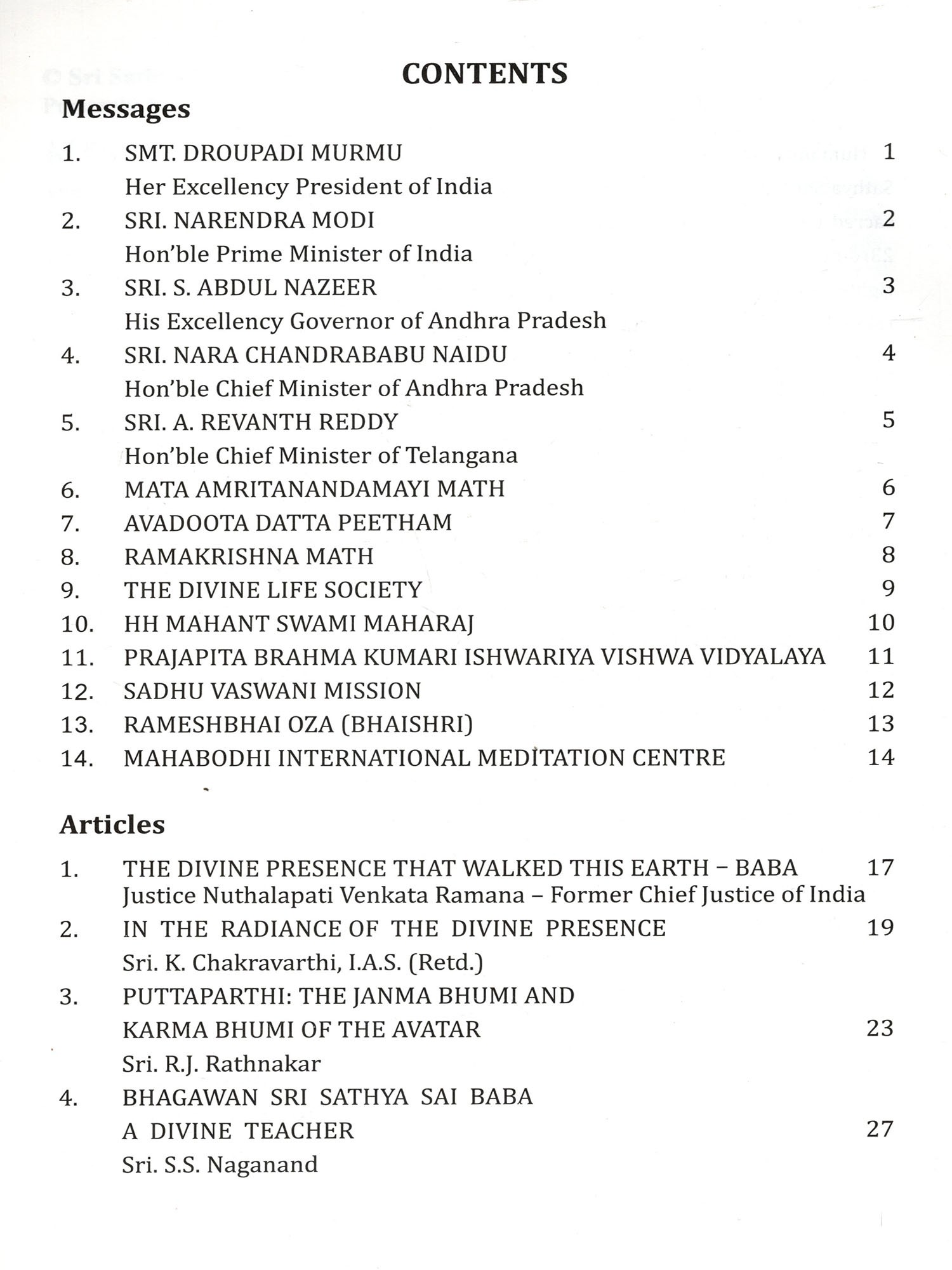 Global Testimonials: Featuring powerful messages from Her Excellency The President of India Smt. Droupadi Murmu, Honourable Prime Minister Sri. Narendra Modi, His Excellency The Governor of Andhra Pradesh Sri. S. Abdul Nazeer, Honourable Chief Minister of Andhra Pradesh, Sri. N. Chandrababu Naidu, Honourable Chief Minister of Telangana Sri. A. Revanth Reddy, and esteemed Religious Heads, alongside articles from former Chief Justice of India, Trustees, veteran politicians, cultural icons and others all sharing the transformative guidance they received directly from Bhagawan.