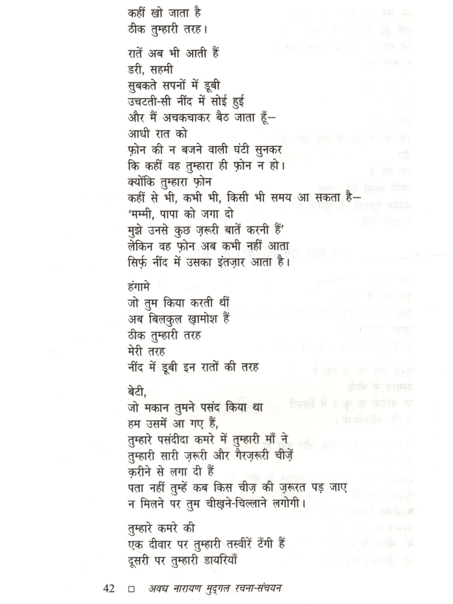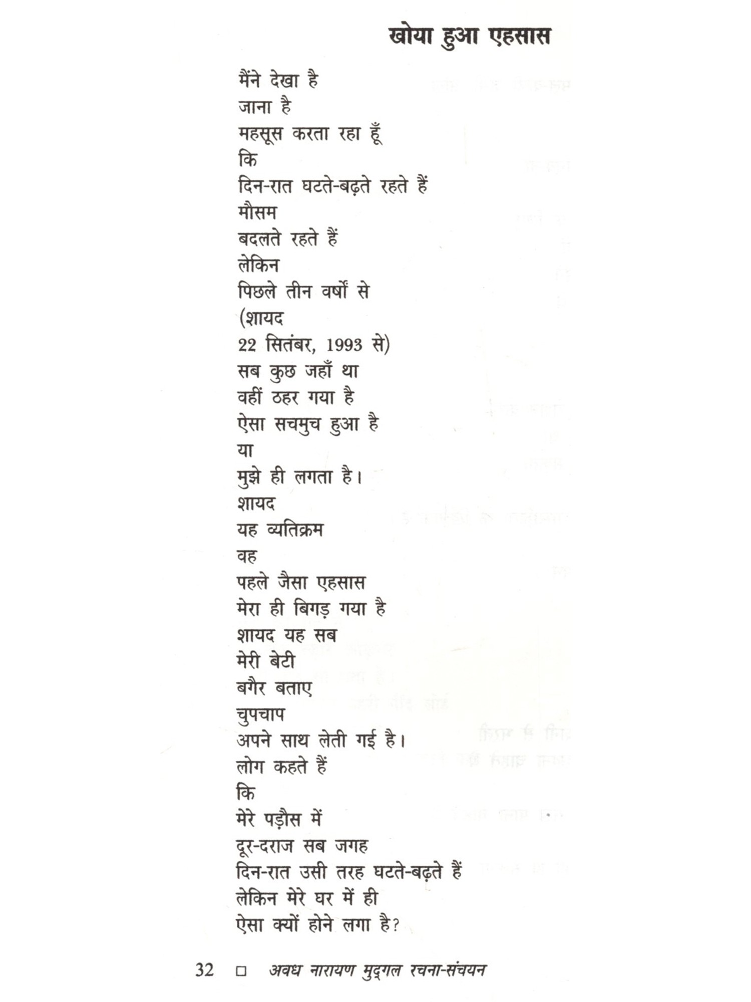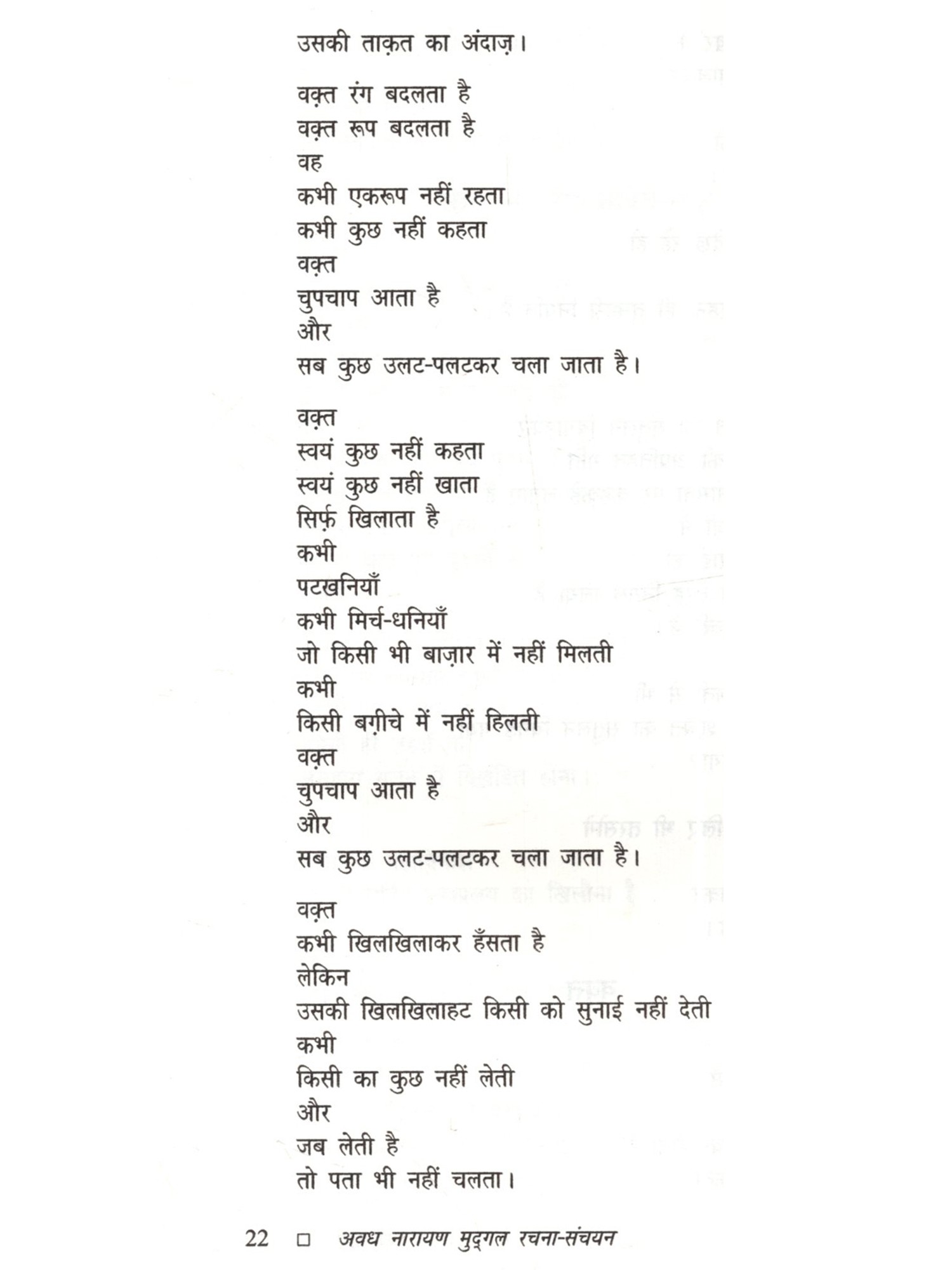 अवध नारायण मुद्गल (1936-2015) प्रख्यात कवि, कथाकार एवं संपादक। पत्रकारिता, यात्रावृत्त संस्मरण, रिपोर्ताज लेखन के साथ ही अनुवाद कार्य भी। वे दस वर्षों तक कथा पत्रिका सारिका के संपादक रहे। उन्होंने वामा एवं पतंग पत्रिका का भी संपादन किया। उनकी लेखकीय यात्रा कविता से आरंभ हुई थी लेकिन अस्सी के दशक की शुरुआत में उन्होंने 'संपाती', 'चक्रवात' एवं 'कबंध' जैसी उत्कृष्ट कहानियाँ लिखीं जो मध्यम वर्ग या निम्न मध्यम वर्ग की जीवन स्थितियों और चरित्रों पर आधारित हैं। कविता, कहानी, अनुवाद साक्षात्कार आदि के अलावा अवध जी ने छोटे आकार के सफरनामे लिखे हैं, जो एक फलांग का सफरनामा में संकलित हैं। उनकी अन्य प्रमुख पुस्तकें हैं मेरी कथा यात्रा (कहानी-संकलन), बंबई की डायरी (डायरी), इप्तदा फिर उसी कहानी की (साक्षात्कार) आदि। उन्हें उत्तर प्रदेश के हिंदी संस्थान के 'साहित्य भूषण', हिंदी अकादमी दिल्ली के साहित्यकार सम्मान एवं राजभाषा विभाग, बिहार के सम्मान से सम्मानित किया गया था।
