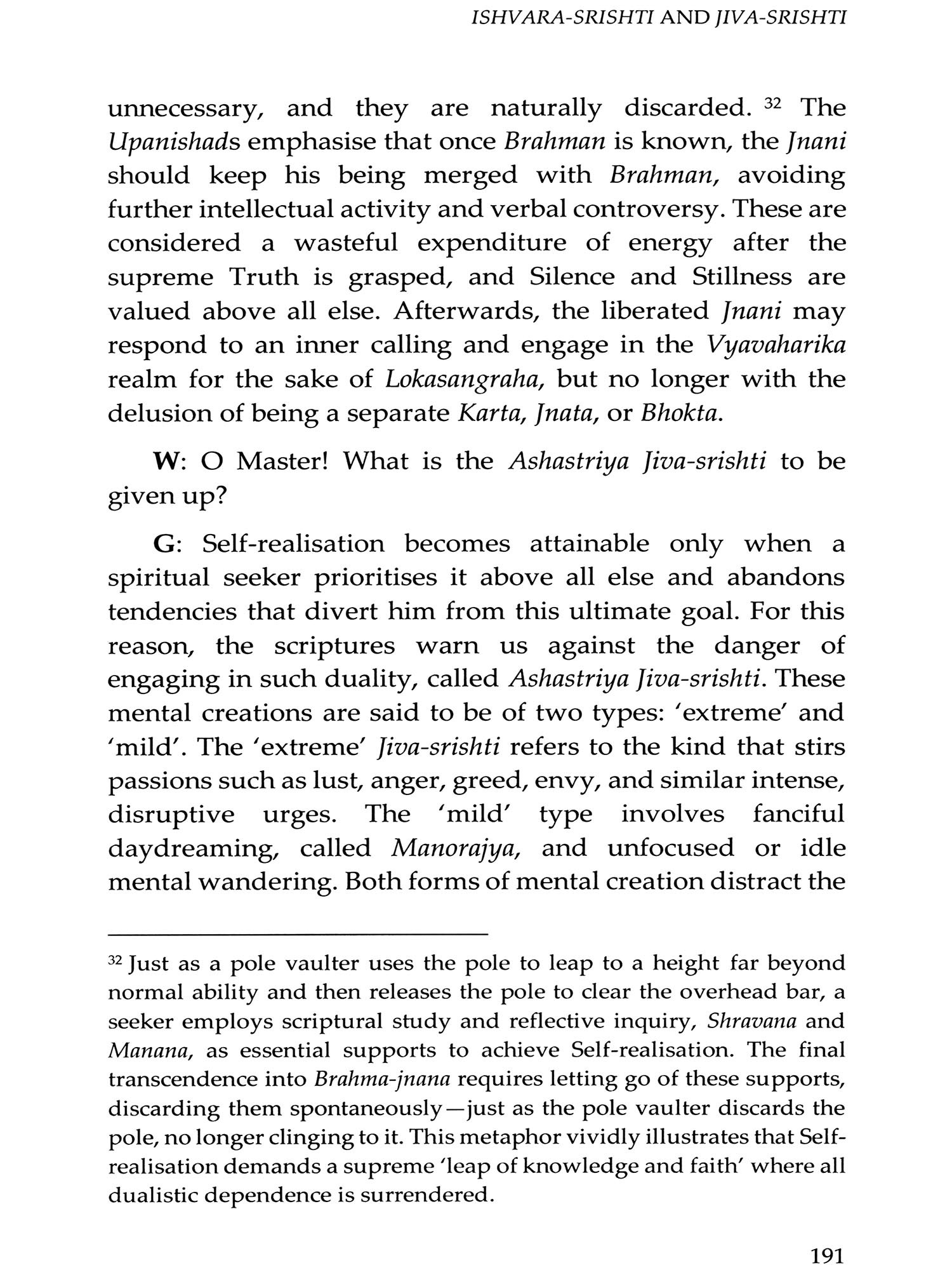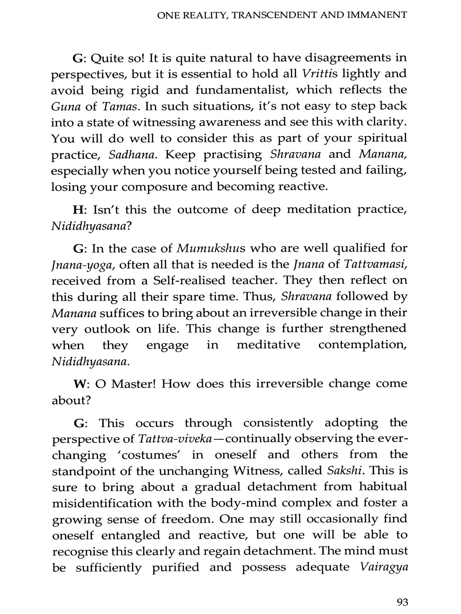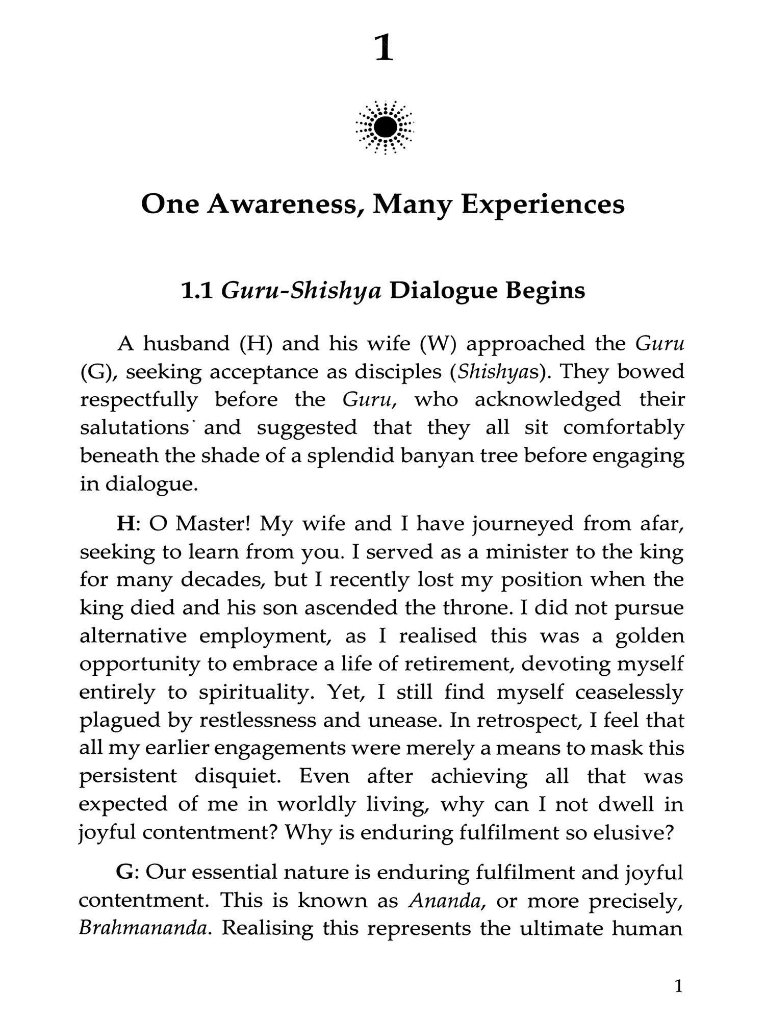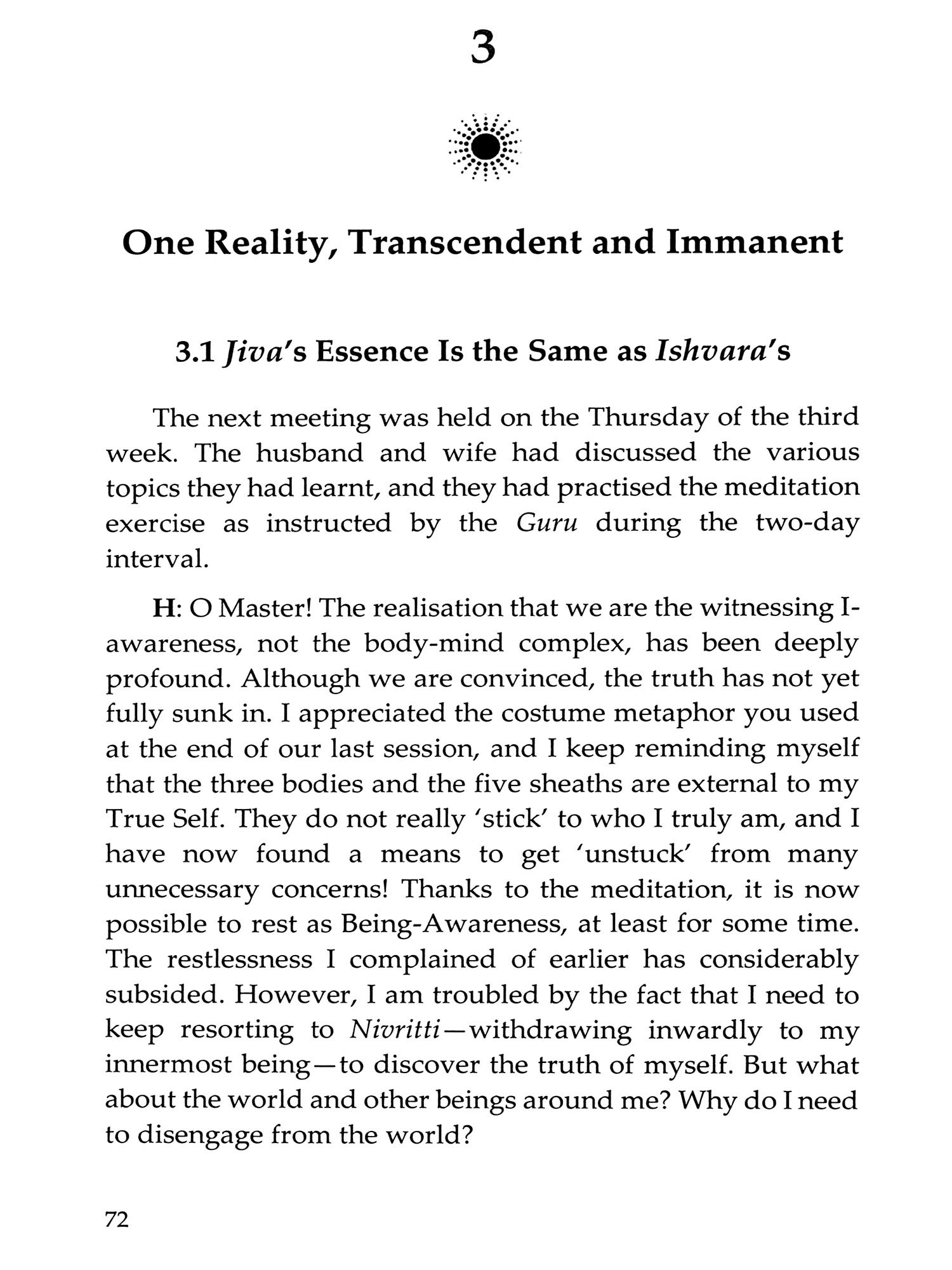 We mostly see ourselves as unique individuals, each confined within a separate physical body. This book stresses that confusing this 'apparent self with the 'True Self is a fundamental mistake that results in suffering and prevents us from recognising and experiencing our true nature: the infinite, formless Pure Existence-Consciousness-Bliss. Merely understanding this truth in theory, as taught in the Upanishads and the Bhagavad Gita, is not enough to dispel this deep ignorance. It is essential to reflect deeply on one's true nature to gain genuine experience. This involves listening to or studying the teachings of a Self-realised Master (such as Vidyaranya), clarifying doubts, and persistently practising self-enquiry and meditation, turning one's attention inward.
