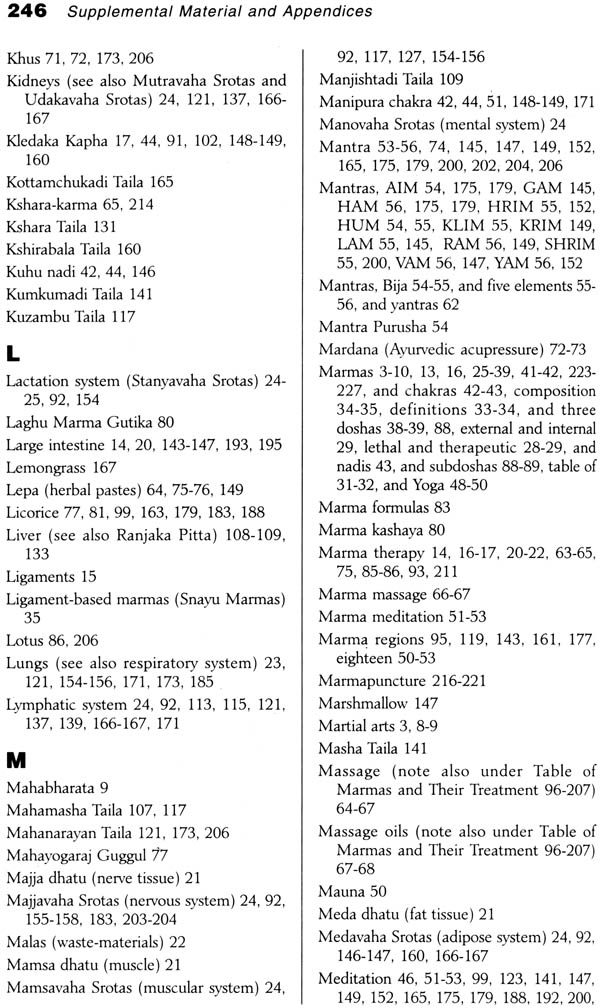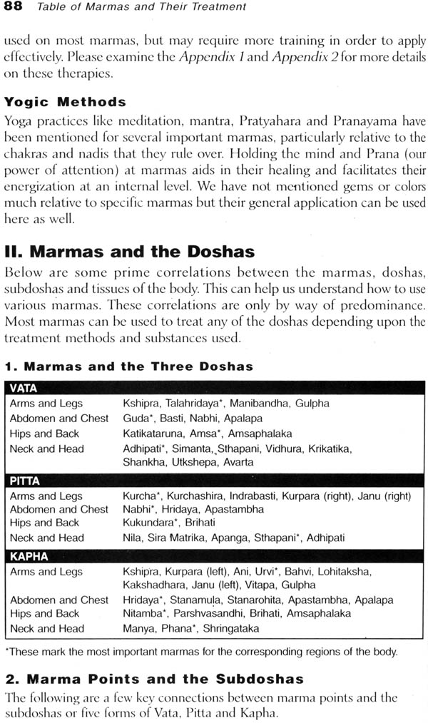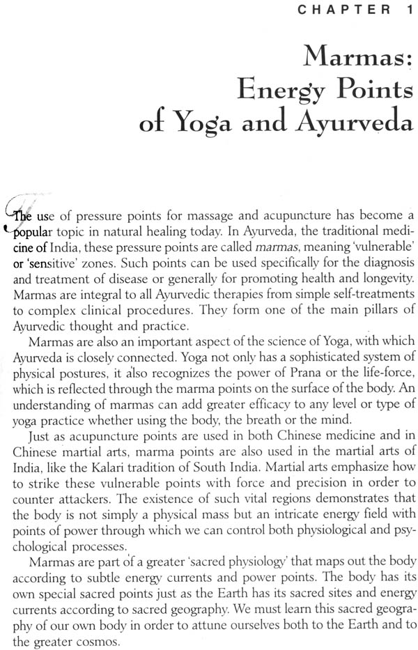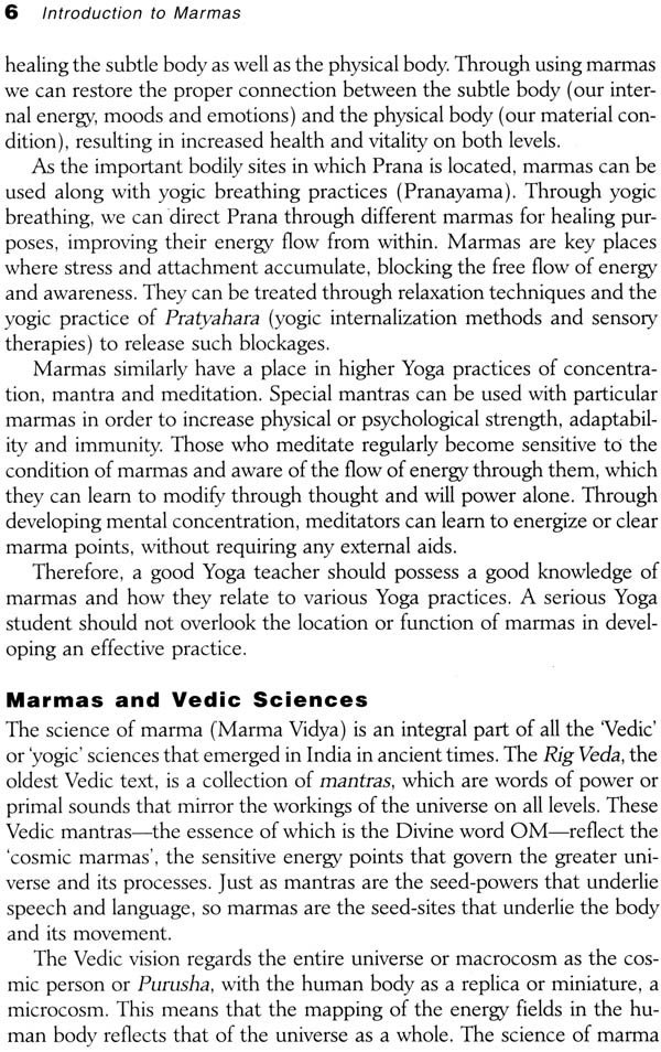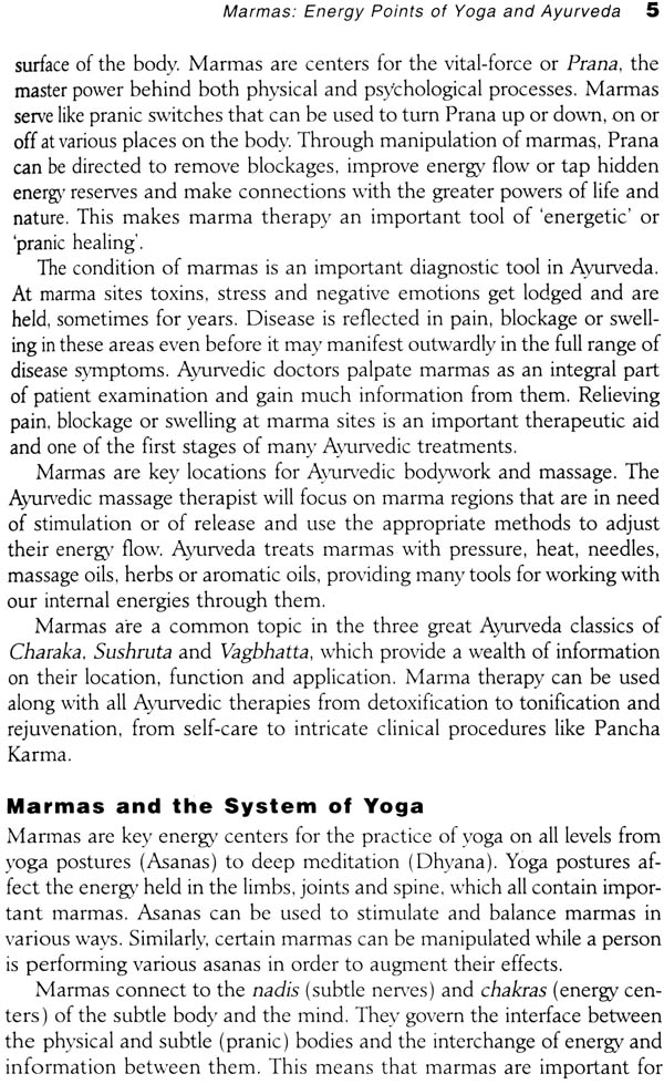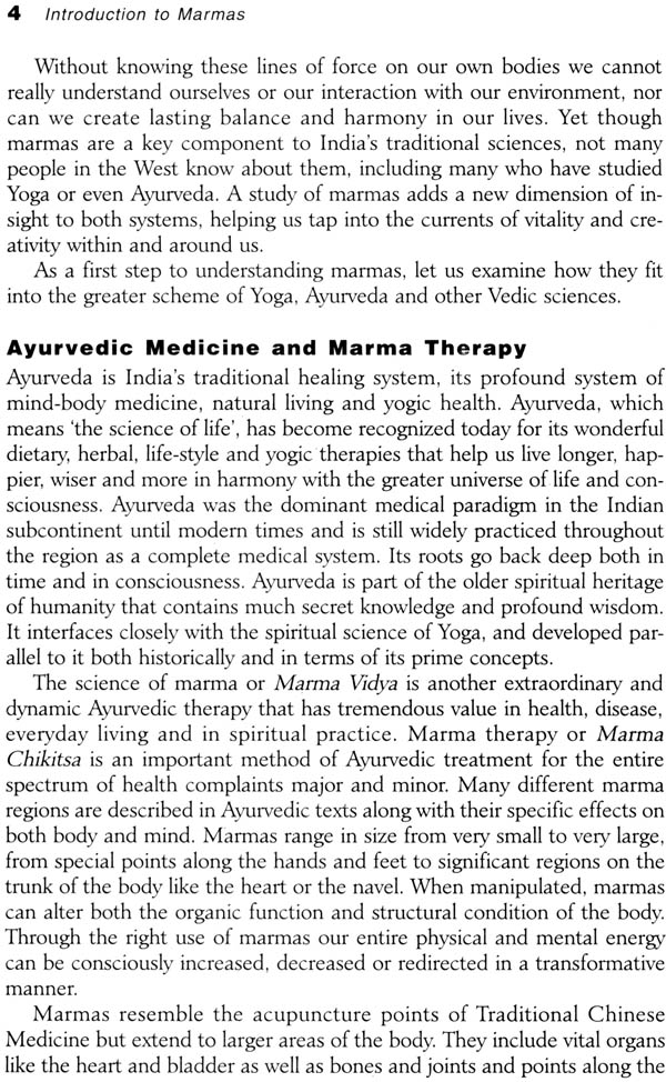 The use of pressure points, called marmas in Sanskrit, is an important part of this Yoga/Ayurveda interface. Marmas are a common topic in classical Ayurvedic texts and are referred to in modem books as well. They are also frequently mentioned in yogic teachings. But up to this present volume- Ayurveda and Marma Therapy -there is no single book that at- tempts to make this subject easily accessible and readable in the West. This book is meant to help fill in that gap.