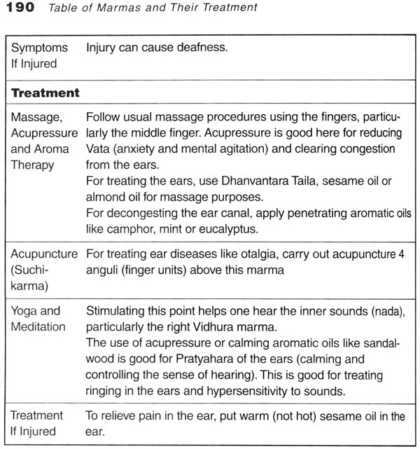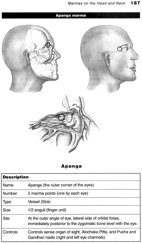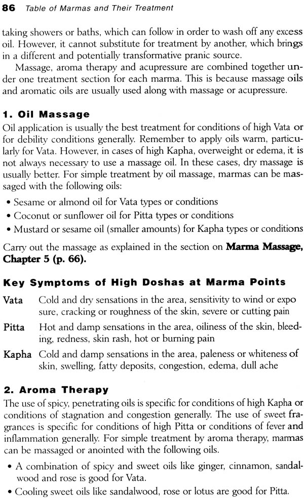 The main confusion regarding Marma therapy in the West is die concept of 107 fixed points on the physical anatomy. In reality the Ayurvedic vision of marma points is flexible and adapted to the individual, as are all Ayurvedic therapies. The marma points can differ from one individual to another and require a certain sensitivity on the part of the therapist to find the area of pranic congestion: In practice we find a variety of differences manifesting according to the prakriti (constitution) and vikriti (temporary state) of the person. Applying the information in this book too rigidly would be a disservice and would ignore the main vision of Ayurveda as an individualized medicine.