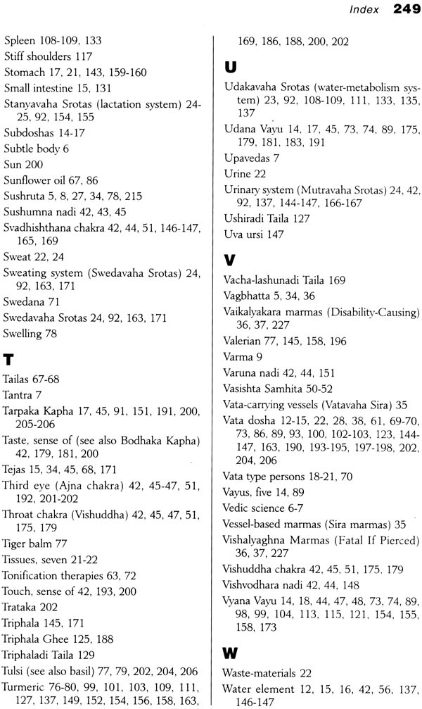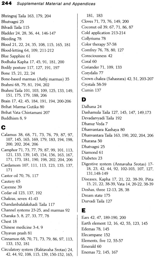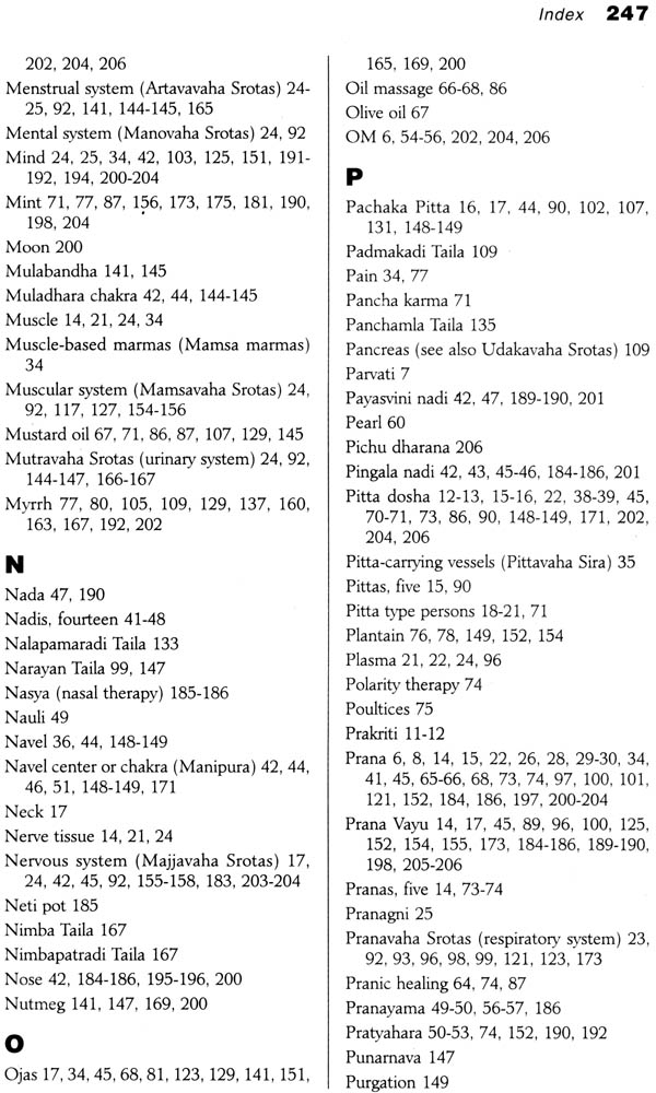 We would like to emphasize that this book is not meant to present the last word on the number of marmas, their location or their manner of treatment. The book emphasizes the main classical Ayurvedic marmas, which are 107 in number, but many other such sensitive points can also be used. While it introduces various methods of treating marmas, particularly oil massage and aroma therapy, such methods can be delineated in greater detail and adapted relative to various treatment strategies and a comprehensive Ayurvedic therapy. The book is a good place to start working with marmas, but still only an introduction to this profound topic. It should be supplemented by a further study of Ayurveda for its full application and integration with the entire range of Ayurvedic modalities.