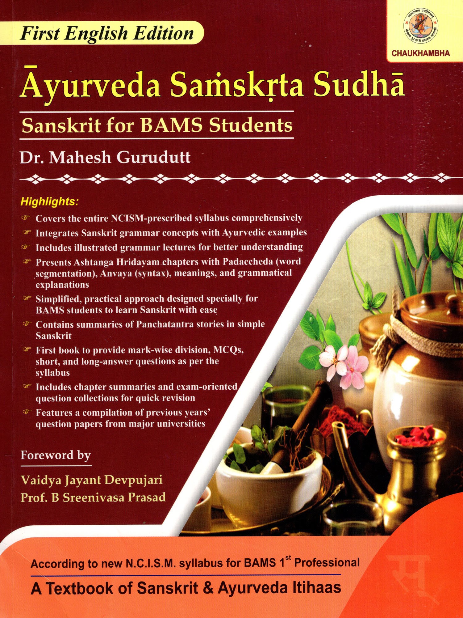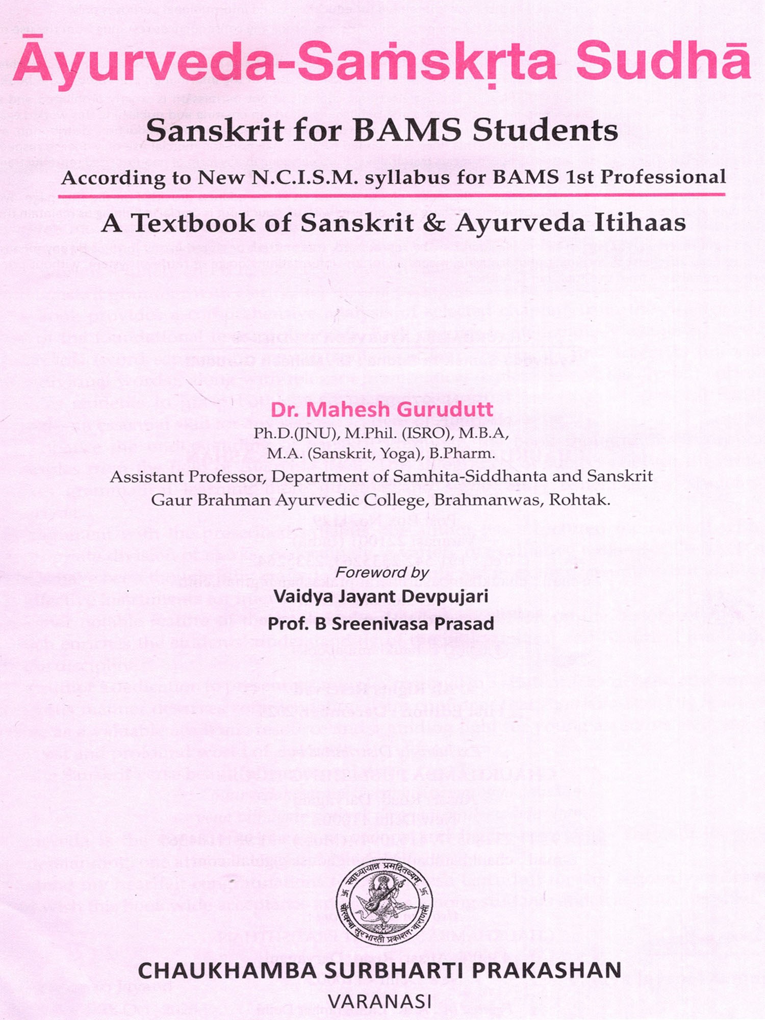 It gives me immense pleasure to write the preface for the book "Ayurveda-Samskyta Sudha authored by Dr. Mahesh Gurudutt, intended for students of the B.A.M.S. First Year curriculum. This work is a timely and scholarly contribution that bridges classical Ayurvedic knowledge and Sanskrit grammar with clarity, depth, and pedagogical effectiveness.