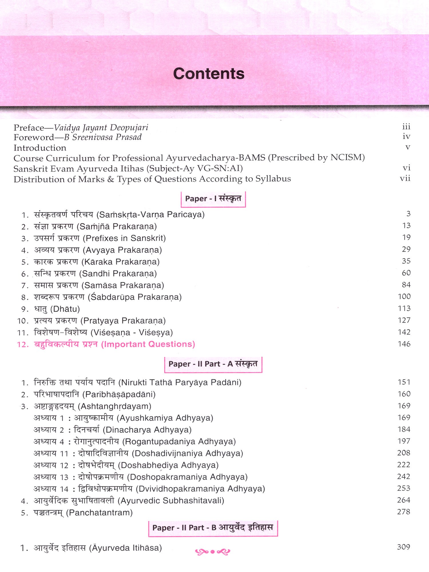 To make classical texts more accessible, this edition presents key portions of Astanga Hrdayam through word segmentation (padaccheda), syntactic breakdown (anvaya), meanings, and concise grammatical explanations. Difficult concepts are simplified with illustrated grammar lectures wherever necessary. Students are further supported through chapter-wise summaries, exam-oriented question sets, MCQs, short-answer and long-answer questions, along with a compilation of previous years' university question papers. Additionally, simple Sanskrit summaries of Pancatantra stories enrich the learner's vocabulary and comprehension in an enjoyable manner.