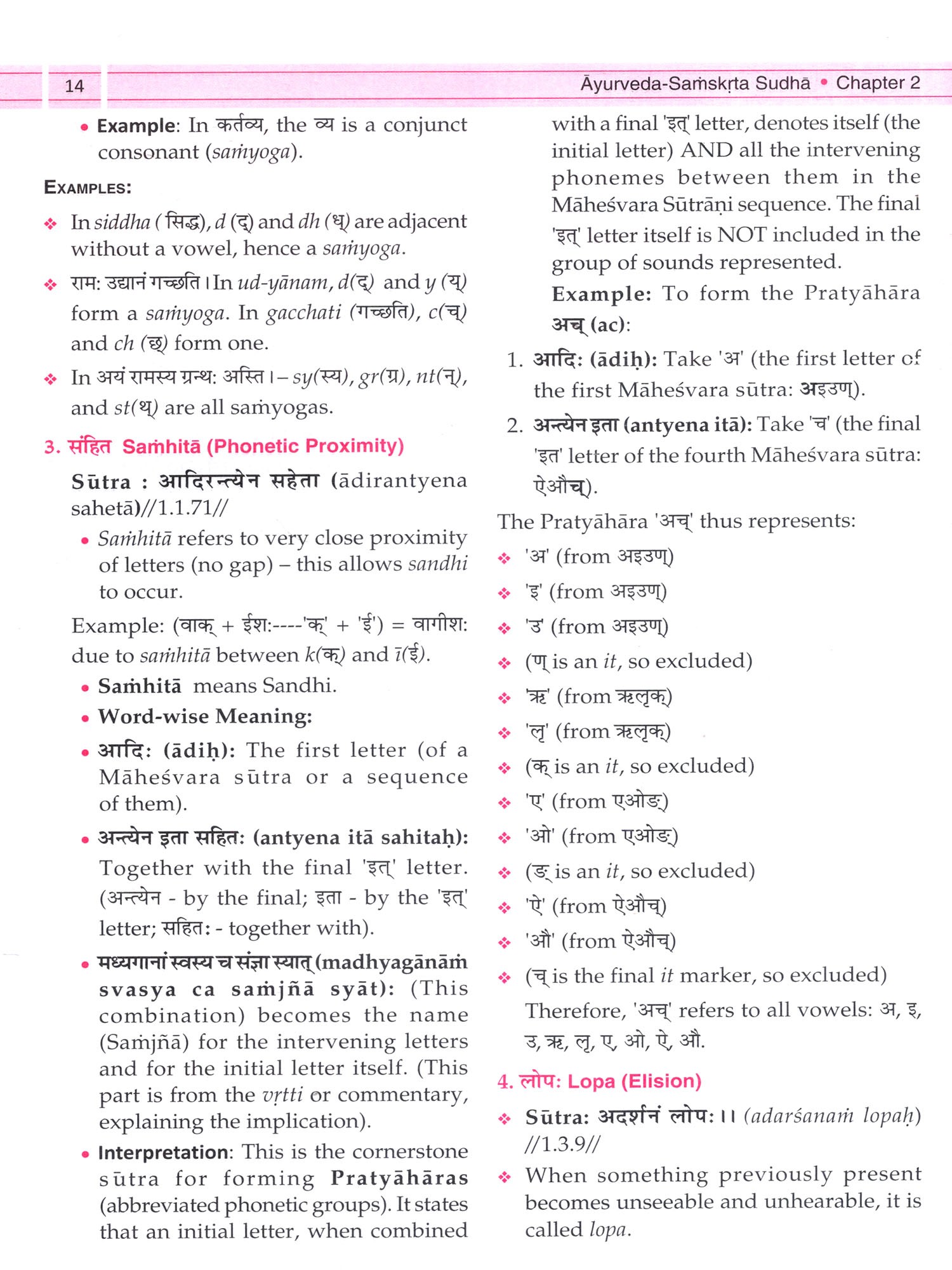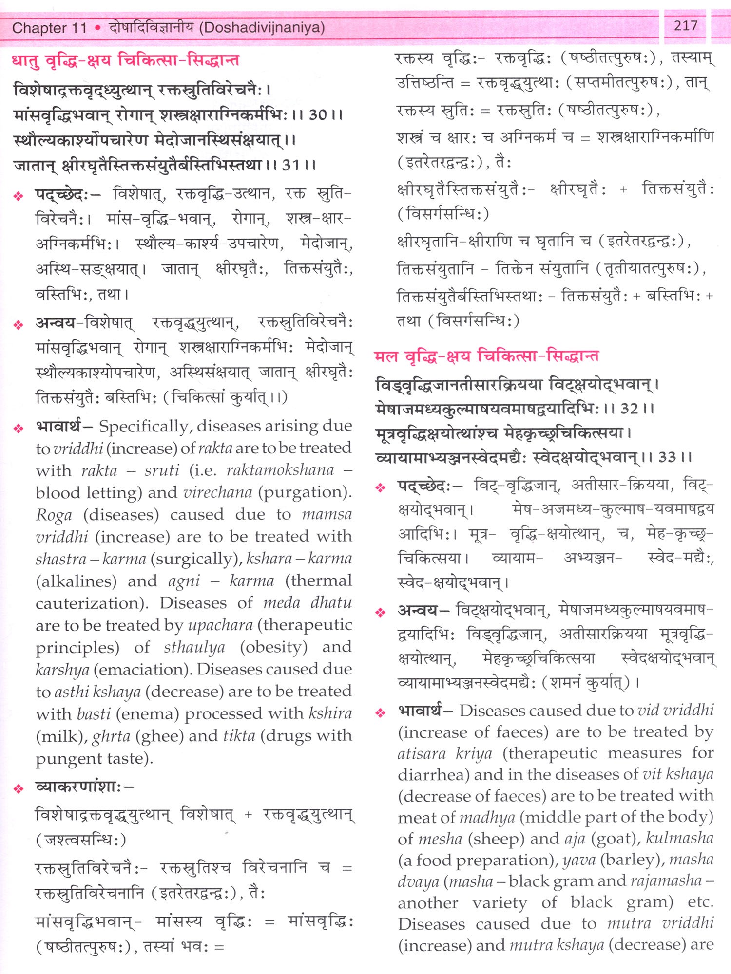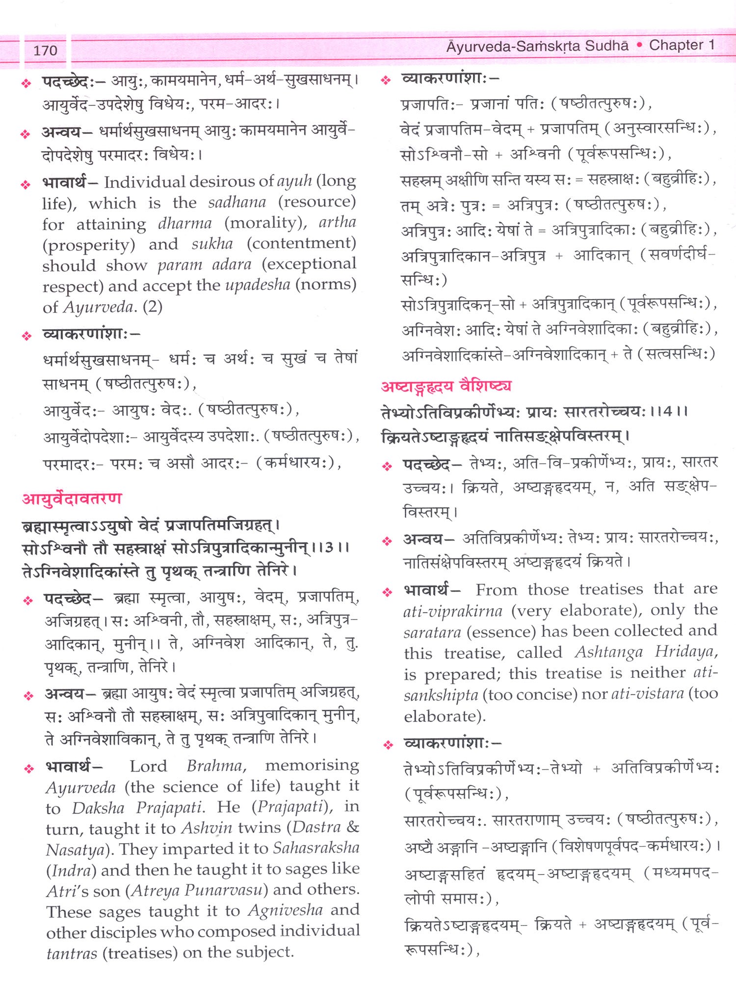 The inclusion of Sanskrit grammar topics illustrated through Ayurvedic examples is a distinctive feature, offering immediate applicability to the study of classical Ayurvedic texts. The use of illustrated grammar lectures wherever necessary further enriches comprehension. The application of Sanskrit grammatical concepts through such as word segmentation (Padaccheda), syntax (Anvaya), meanings, and grammatical explanations through chapters of Astangaga Hridayam provide valuable insight into classical Ayurvedic literature.