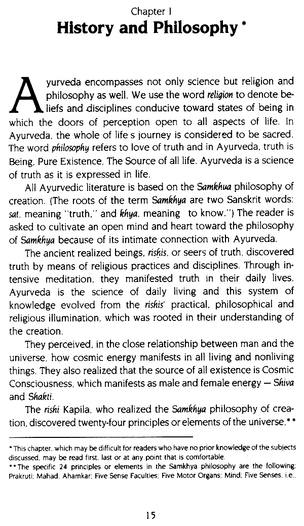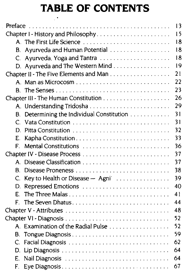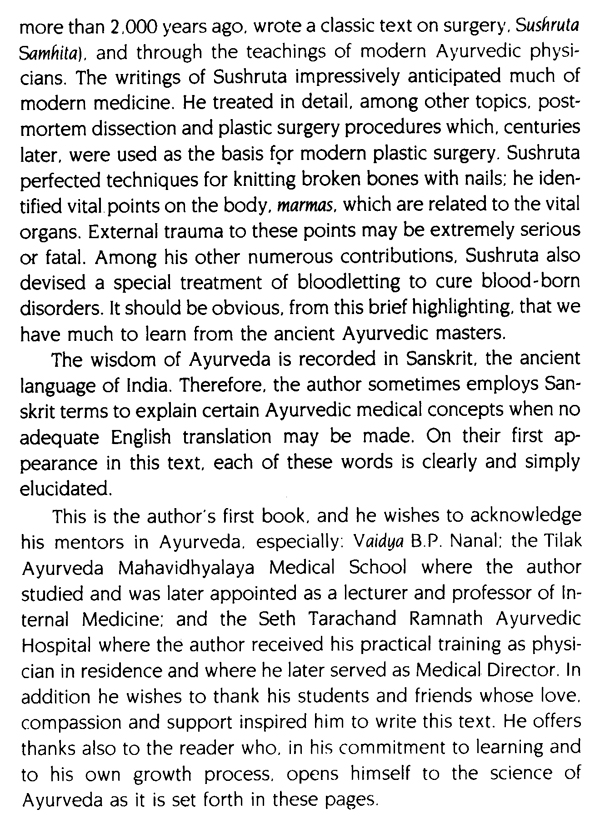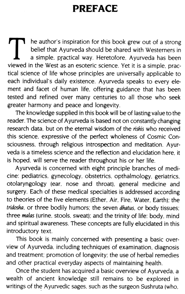 Ayurveda is a simple, practical science of life whose principles are universally applicable to each individual's daily existence. Ayurveda speaks to every element and facet of human life, offering guidance that has been tested and refined over many centuries to all those who seek greater harmony, peace and longevity. The knowledge supplied in this book will be of lasting value to the reader. This book is mainly concerned with presenting a basic over-view of Ayurveda, including techniques of examination, diagnosis and treatment; promotion of longevity; the use of herbal remedies and other practical everyday aspects of maintaining health.