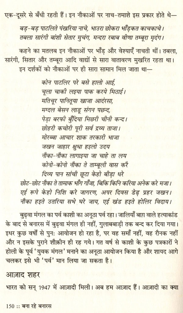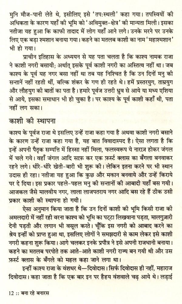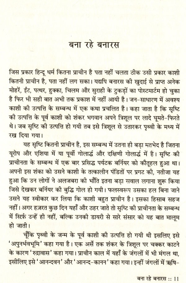 'तीन लोक से न्यारी' और मिथकीय विश्वास के अनुसार त्रिपुरारि के त्रिशूल पर बसी काशी नगरी का नाम चाहे जिस कारण से बनारस पड़ा हो, किन्तु इतना सुनिश्चित है कि यहाँ का जीवन-रस अद्वितीय है। काल और कालातीत के साक्षी बनारस के जीवन सर्वस्व को विश्वनाथ मुखर्जी ने बना रहे बनारस में जीवन्त किया है। बनारस के विषय में कही-सुनी जानेवाली उक्तियों में एक यह भी है, 'विश्वनाथ गंगा बटी, गान खान औ पान/संन्यासी सीढ़ी वृषभ काशी की पहचान।' इस पहचान को लेखक ने कुछ ऐसे शब्दबद्ध किया है कि 'बतरस' में बनारस का आस्वाद उतर आया है। एक बूँद सहसा उछली में यशस्वी साहित्यकार अज्ञेय ने ठीक ही लिखा है-'हर एक बतर का अपना एक स्वाद होता है।' बना रहे बनारस एक नगर को केन्द्र बनाकर लिखा गया संस्कृति-विमर्श है। भारतीय ज्ञानपीठ से इस पुस्तक का प्रथम संस्करण 1958 में प्रकाशित हुआ था। तत्कालीन बनारस और वर्तमान बनारस के बीच जाने कितना जल गंगा में प्रवाहित हो गया, किन्तु तत्त्वतः बनारस वही है जिसका अवलोकन लेखक विश्वनाथ मुखर्जी ने किया था। यही कारण है कि इतिहास, समाजशास्त्र और जीवनचर्या की ललित अभिव्यक्ति आज भी सहृदय को प्रभावित करती है। 'वनारस दर्शन से भारत दर्शन हो जाएगा' -पुस्तक का यह वाक्य अनेक अर्थों में स्वतः सिद्ध है। कहा जा सकता है कि यह शब्दयात्रा अन्ततः तीर्थयात्रा की अनुभूति में सम्पन्न होती है। प्रस्तुत है अत्यन्त पठनीय व प्रभावी पुस्तक का यह नये कलेवर में नयी साज-सज्जा के साथ 'पुनर्नवा' संस्करण ।