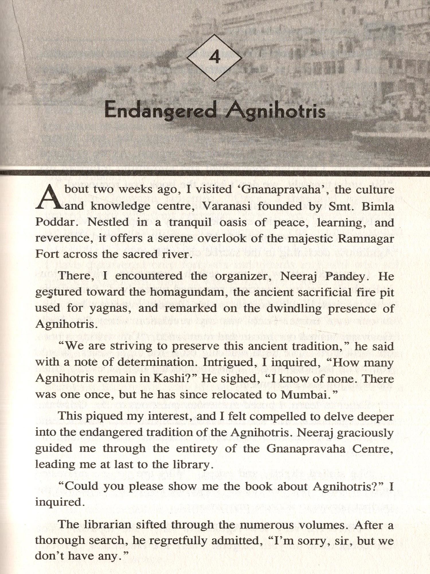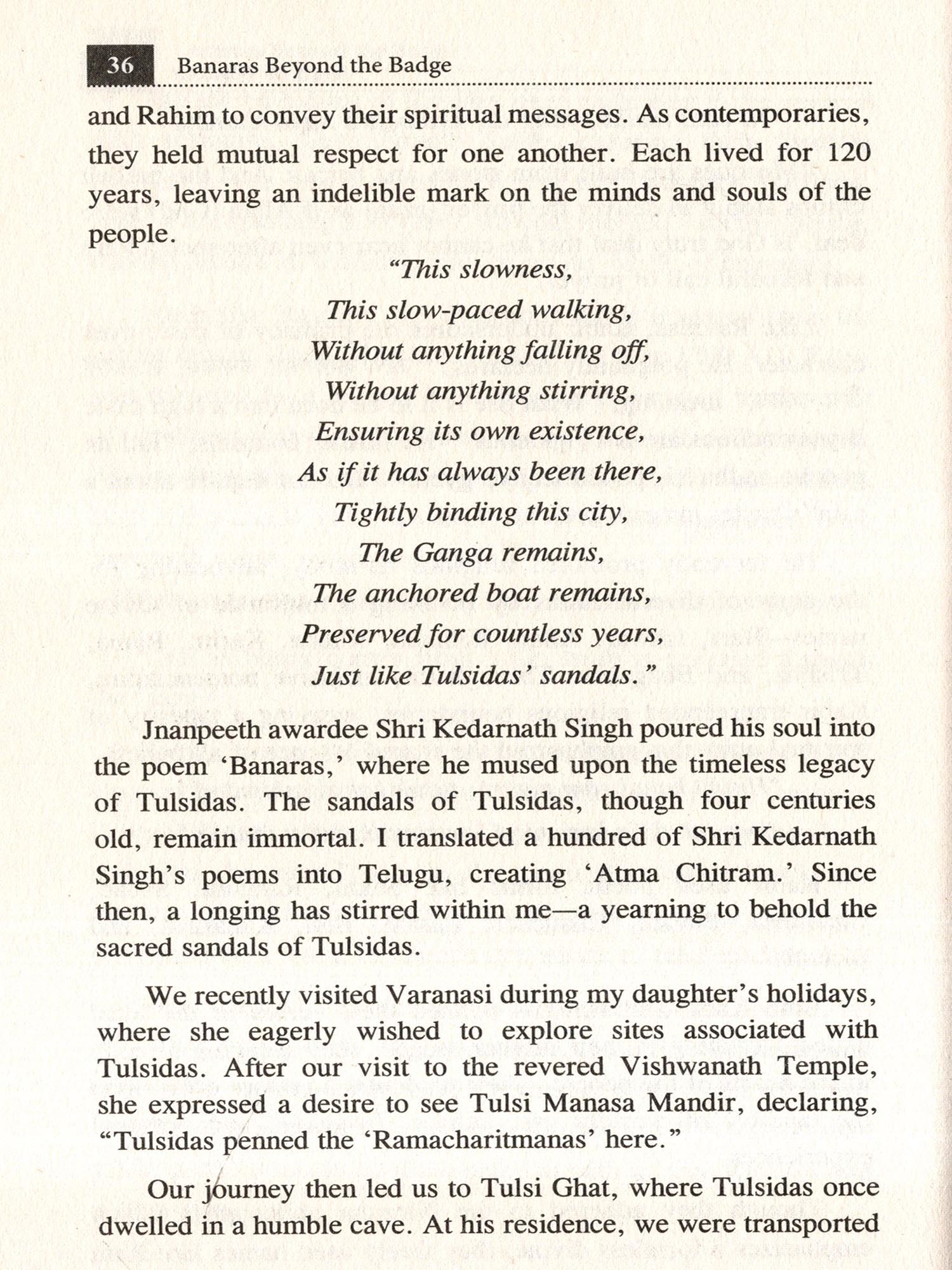 Thus, anyone who immerses in Kashi inevitably becomes Kashi-like. And one who becomes Kashi-like belongs to Kashi, and Kashi belongs to them. They are a luminous presence in the courtyard of the Avimukta (the never-forsaken). The author of this book, Killada Satyanarayana, is a living example of this truth.