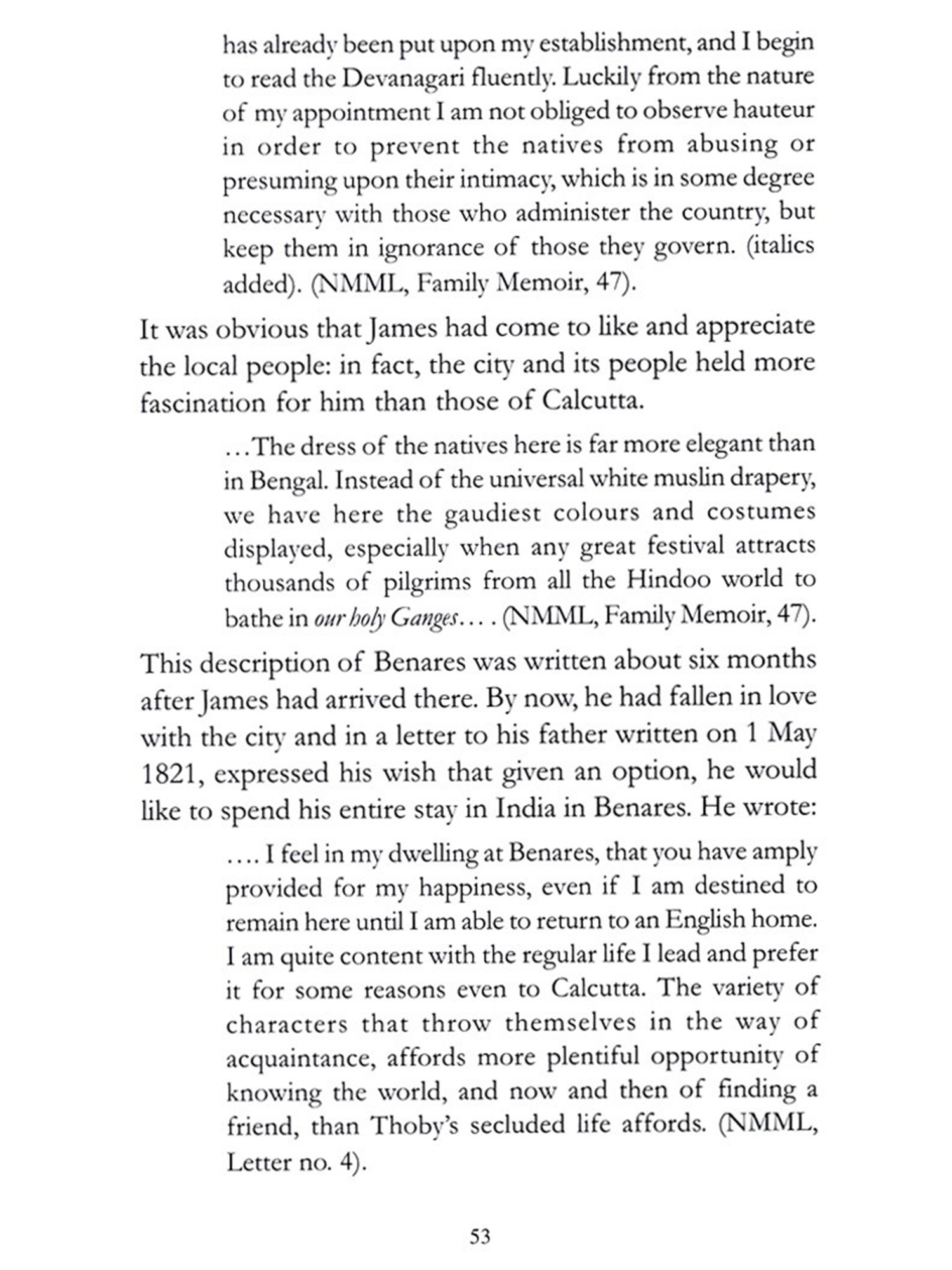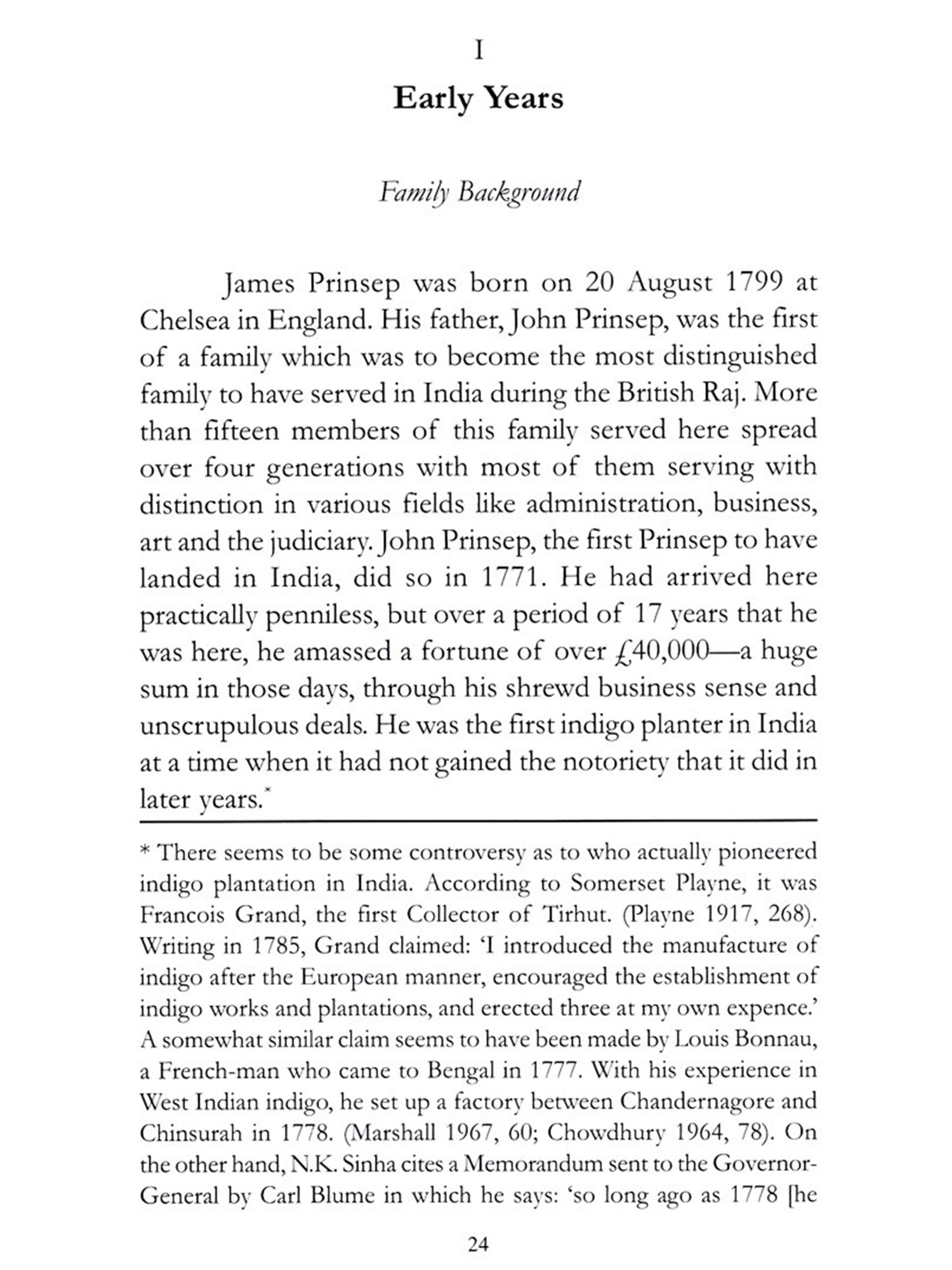 In a departure from the usual practice of academic works which lay down their 'Conclusions' at the end, I propose to begin this study of the life and work of James Prinsep by setting down two conclusions which I have reached after having mentally stayed with him for about twenty years now. Readers may find these conclusions controversial and even unbelievable, yet I state these without much fear of contradiction and with the conviction that by the time one has gone through the book or even a substantial part of it, one will tend to agree with me. These conclusions are one, that if a graph were to be drawn of human genius, James would find a place somewhere near the top with the likes of Leonardo da Vinci; and two, that no individual has contributed more to the development of the ancient and holy city of Banaras and in so many diverse ways as James Prinsep.