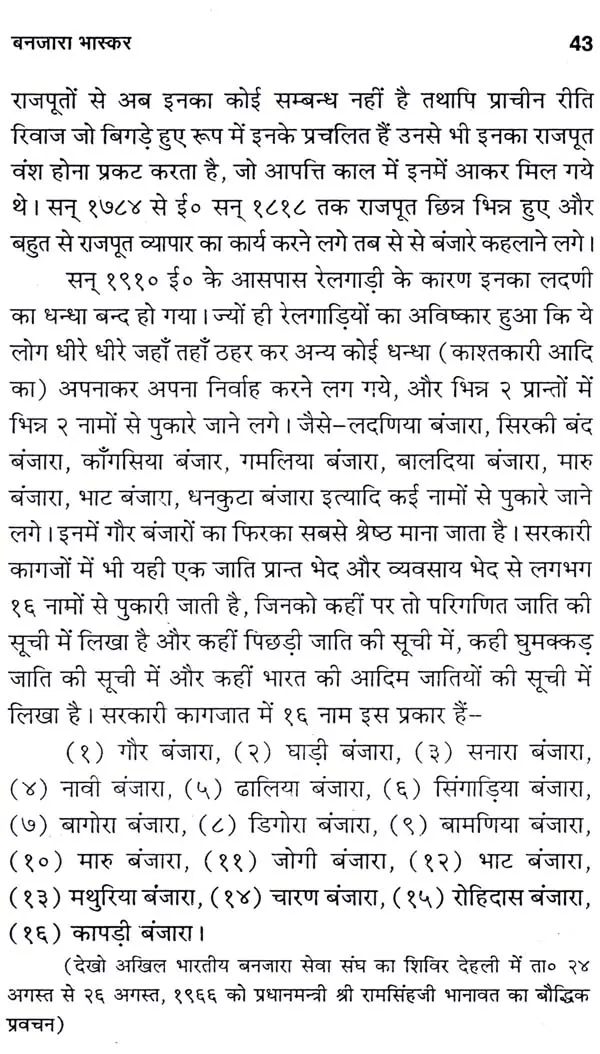 मुझे विश्वास है कि इस पुस्तक को पढ़कर बनजारा जाति के हमारे भाई-बहन अपने प्राचीन गौरव को स्मरण कर आज भारत के इस नवोत्थान मेंअपना अच्छा योगदान करेंगे और समाज के दूसरे नेता और आम लोग इस जाति के उत्थान में योग देकर अपना कर्त्तव्य निभायेंगे। मैं स्वामीजी को उनके इस शुभ संकलन और सेवादासजी को इसके प्रकाशन के लिए बधाई देता हूँ।
