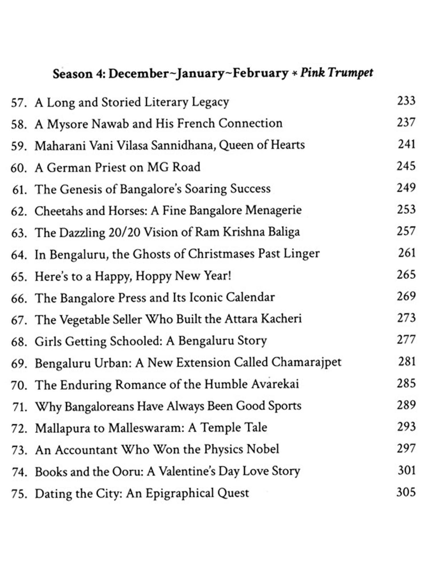 In this collection of evocative essays, she trawls the city's history to tease out bits of the Bangalore jigsaw - a scientist's quest for excellence, a maharani's foresight, an entrepreneur's vision, a chief minister's ambition, a writer's pride in his language, and more - in an effort to trace the genesis of the liberal soul of the metropolis and its ability to offer inclusive, creative, laid-back spaces amid its frenetic growth. What emerges is a fascinating mosaic that reveals how a little sixteenth-century settlement on a hill became India's most charismatic city.