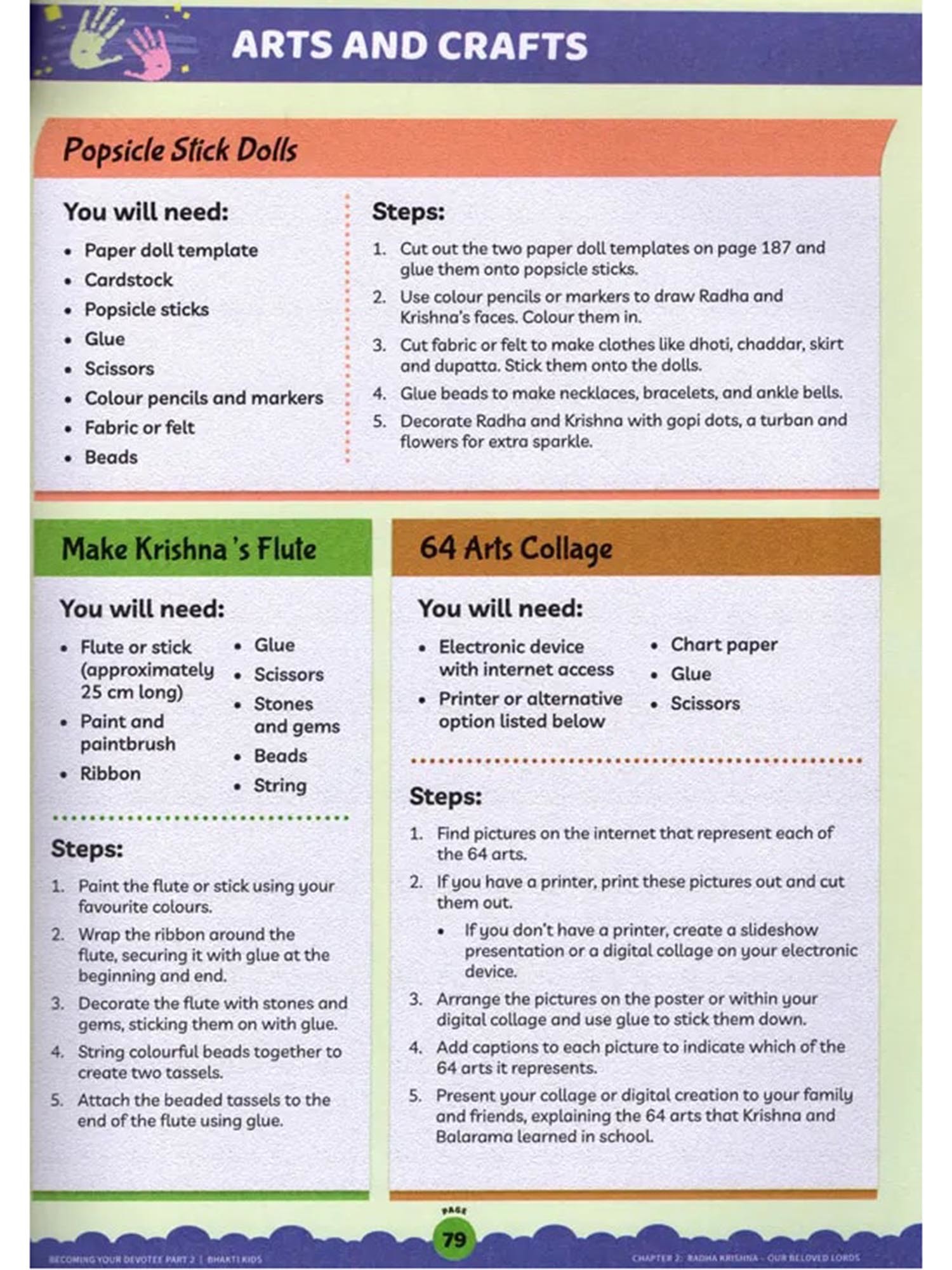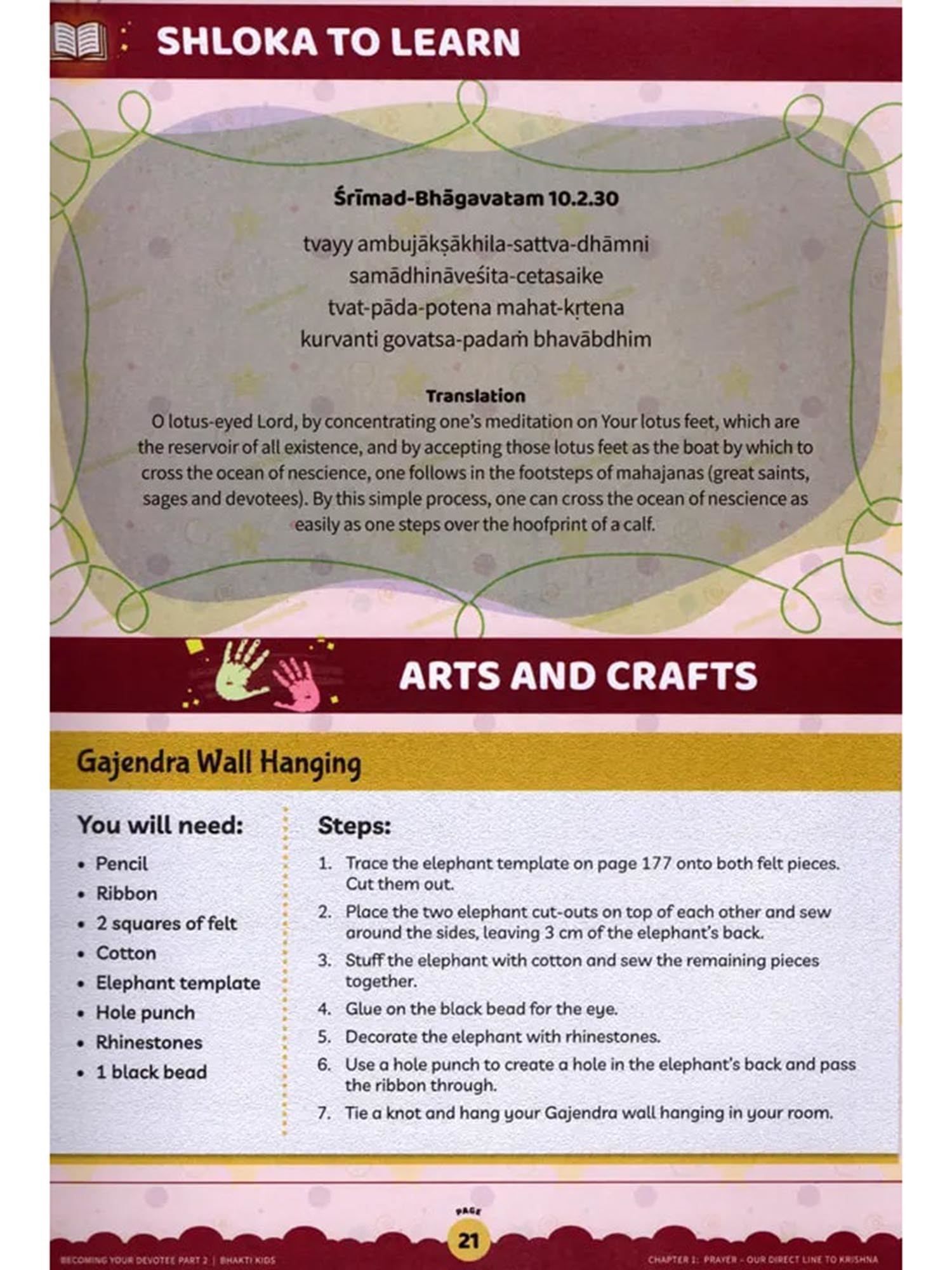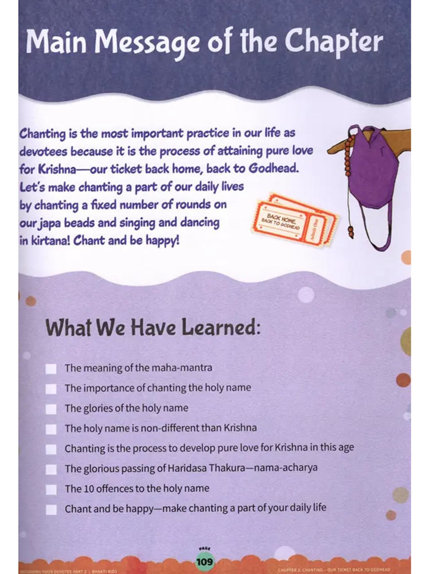 Becoming Your Devotee explores, in depth, eight interesting topics of Krsna consciousness such as putting on tilaka, the nine processes of devotional service, following Ekadagi, Lord Caitanya and Lord Nityananda and even how to offer bhoga and a rati! Every chapter starts with a lesson explaining the topic with a story and fun facts and ends with a checklist to tick what you have learned. The special thing about this book is that every lesson contains many exciting activities such as crafts, dramas, cooking, games and so much more! This book is especially for you!