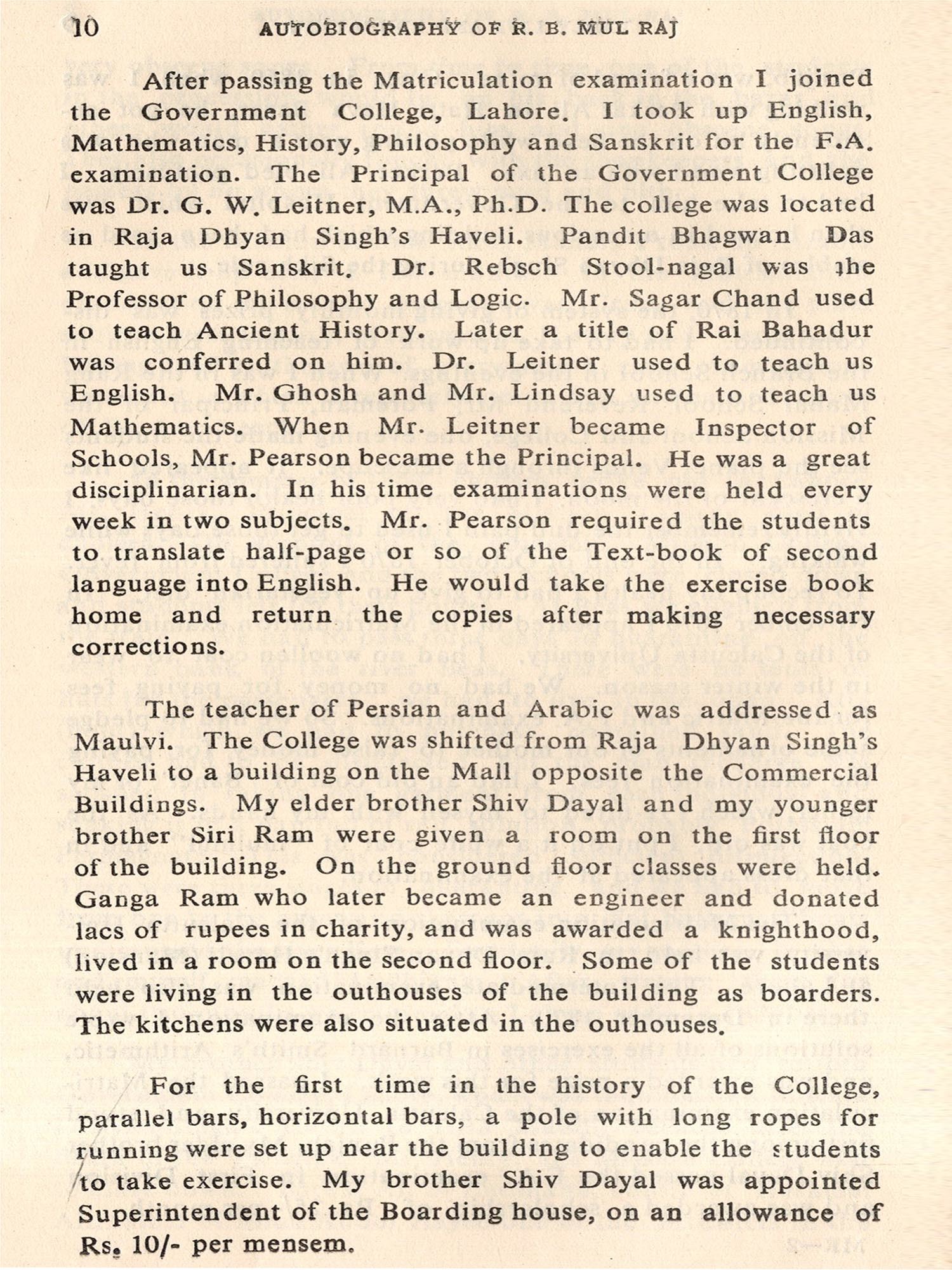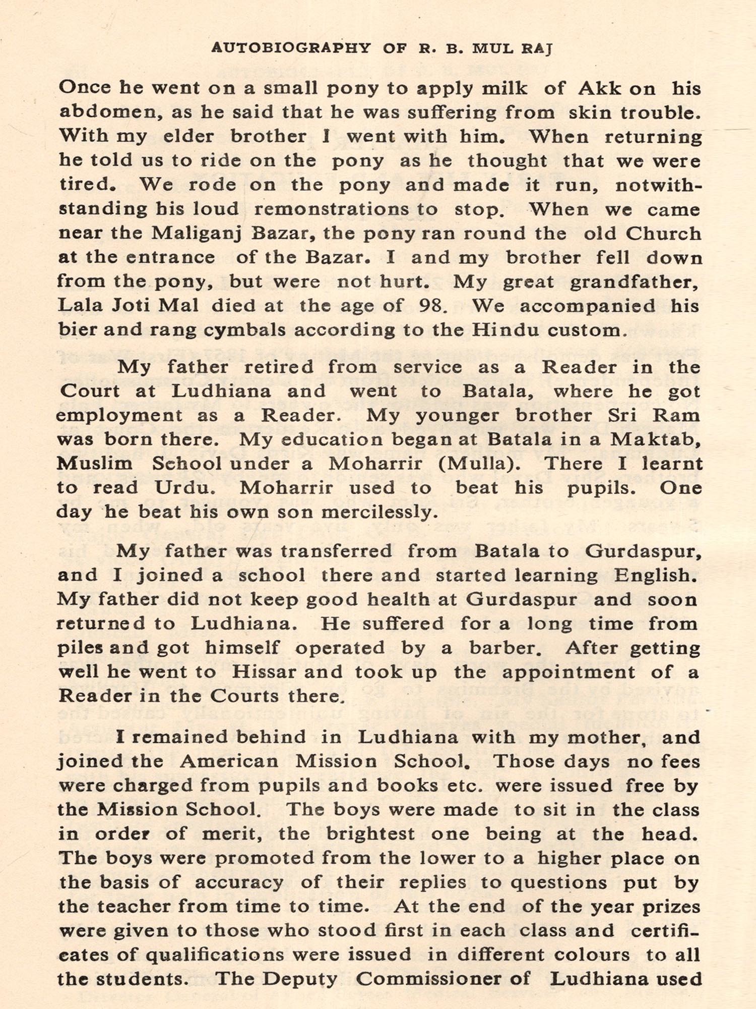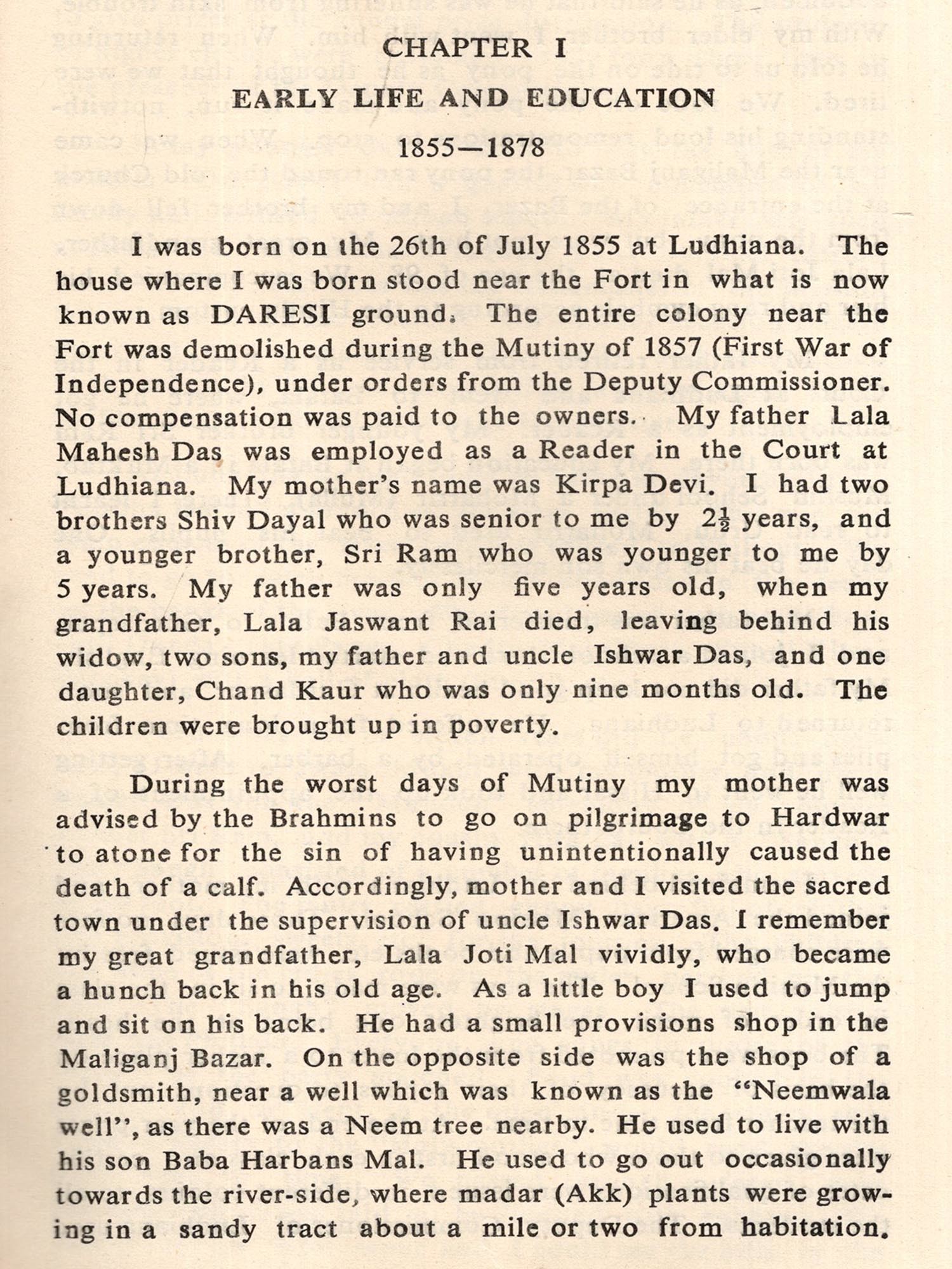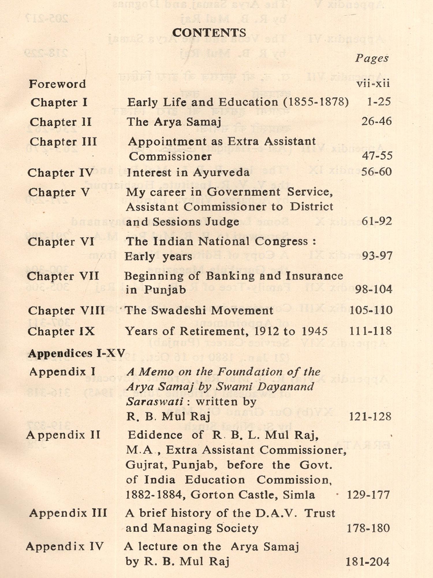 This autobiography in the form of reminiscences was dictated by the author to his grandson, Upendar Nath (now Dr. Upendar Nath, M.B.B.S., L.D.S., R.C.S., Hyderabad-A.P.) in the nineteen-thirties. The manuscript was completed at Lahore about 1942. The author, Rai Bahadur Mul Raj died at Lahore (West Pakistan) on 2nd June, 1945. Soon after his death, the law and order situation in the Punjab began to deteriorate. The holocaust which preceded and followed the Partition of the country ruined and disrupted many Punjabi homes and families, and therefore, it took many years before the manuscript could receive due attention.