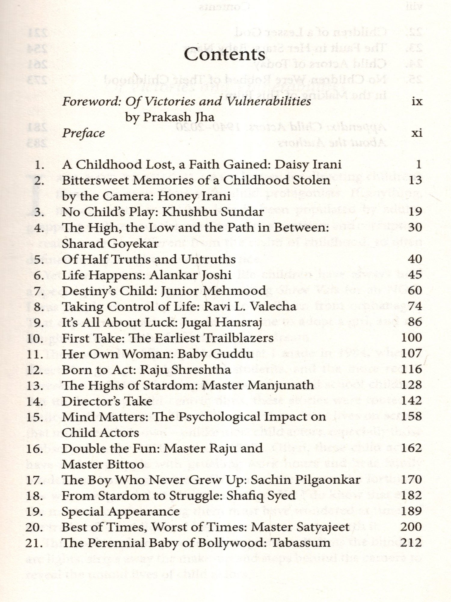From Daisy Irani and Baby Naaz's heartbreaking stories of exploitation to how the film industry turned out to be Junior Mehmood's true calling in life; from the crushing weight of early fame on the child actors of Slumdog Millionaire to Jugal Hansraj, Ravi Valecha and Alankar Joshi's struggles to rebuild their lives once adolescence arrived and work opportunities vanished - this book offers startling insights into lives you had probably given little thought to.