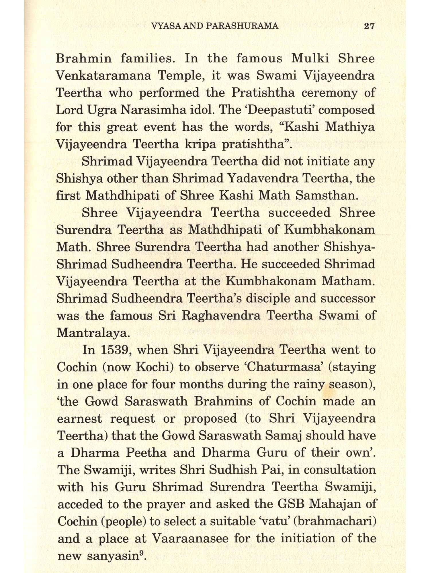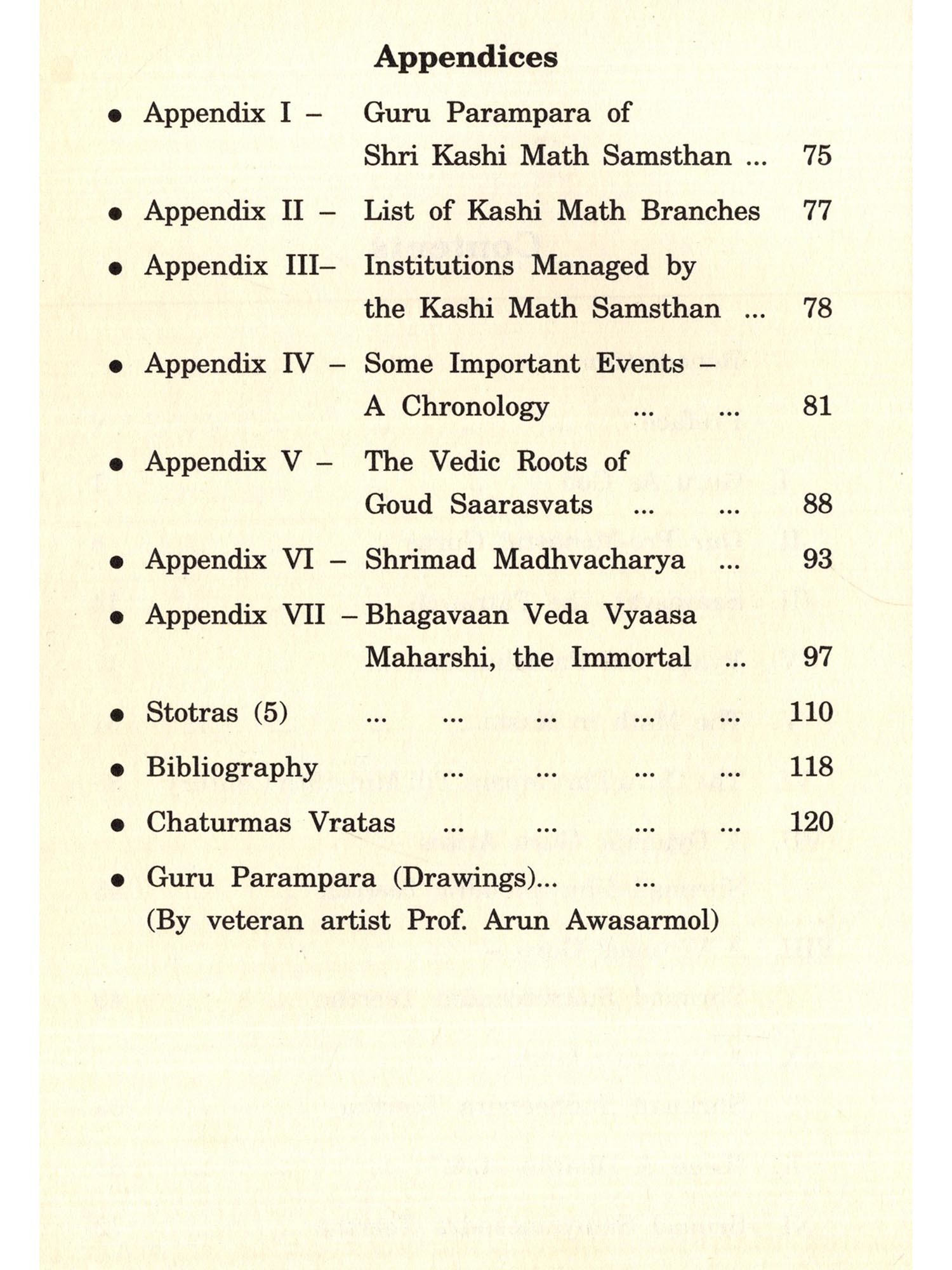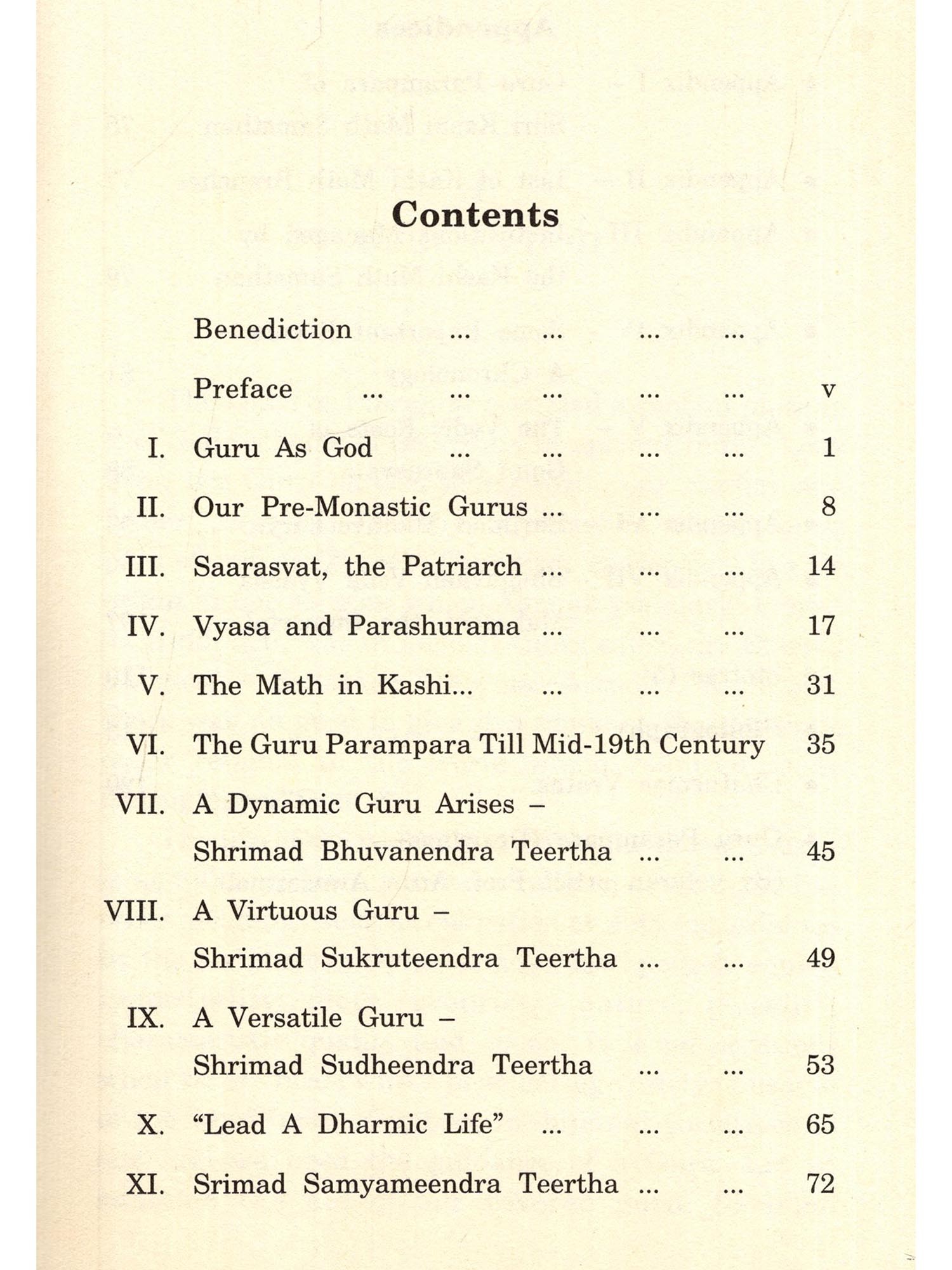 Besides recounting the life and work of these Gurus, albeit briefly in some cases for lack of information, I have dealt with the lives of our ancient sages, notably Shree Veda Vyasa and Bhagavan Parashurama as well as the founder of the Dvaita system of philosophy, Shrimad Madhvacharya.