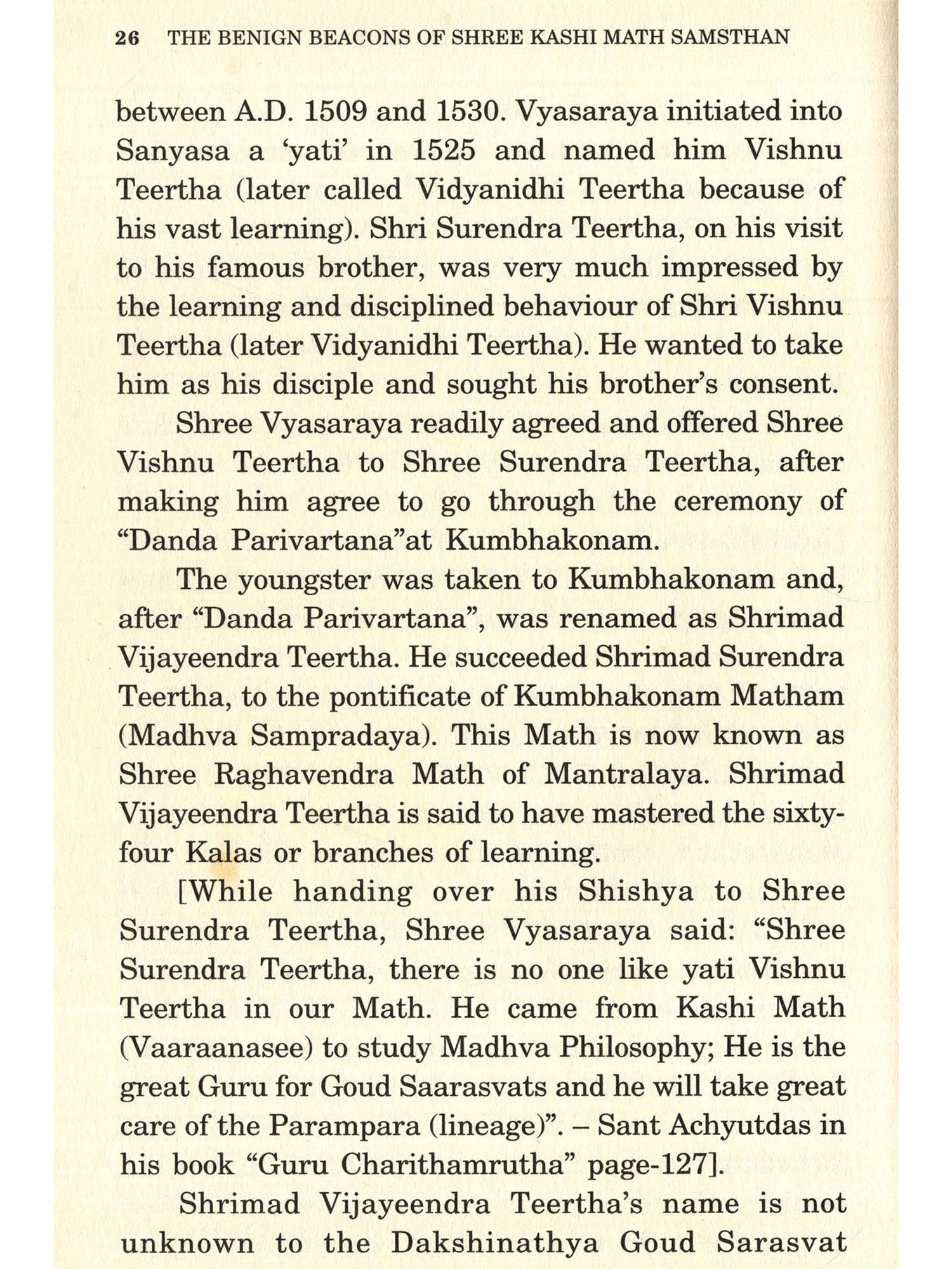 As the GSB community has its roots in the Vedas, I have thought it worthwhile to include in this book sketches of sage Saarasvat and sage Vishvamitra. One notable addition I have made is that of Bhishma who is the father-figure of the Mahabharata the epic whose author was sage Vyasa we worship at the Math. A great heroic character, firm in his resolve to renounce power and pleasure, noble in thought, dauntless in fight and, above all, a devotee of Sri Krishna non pareil, was Bhishmacharya. Did he not give us the Vishnu Sahasranama? For this alone, he is entitled to our constant remembrance.
