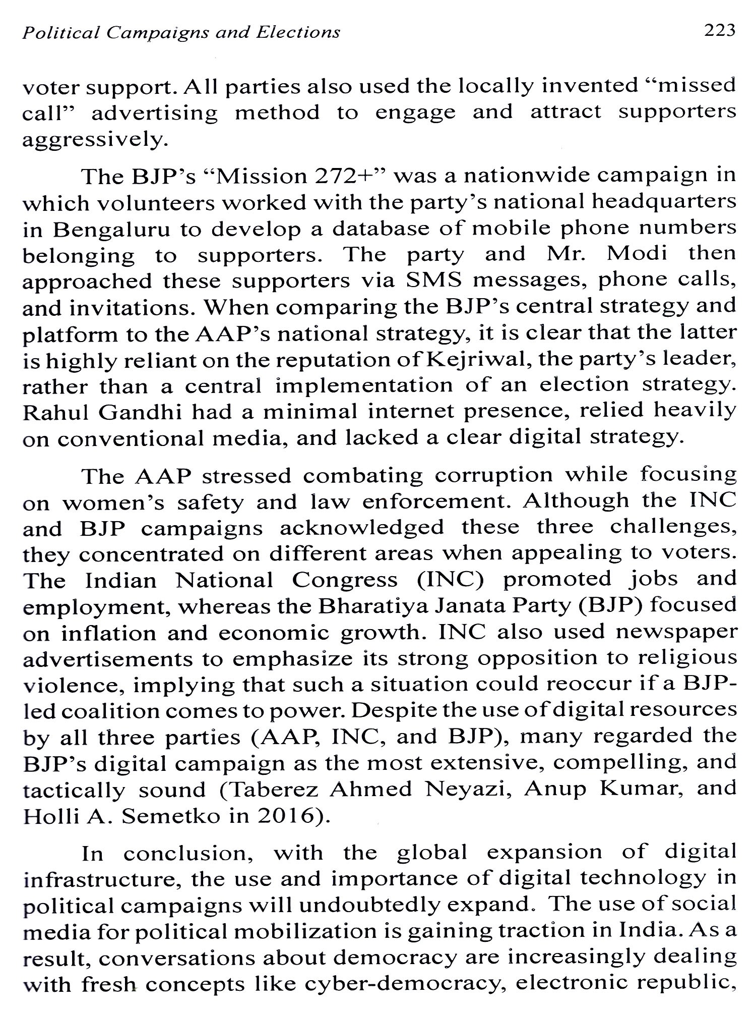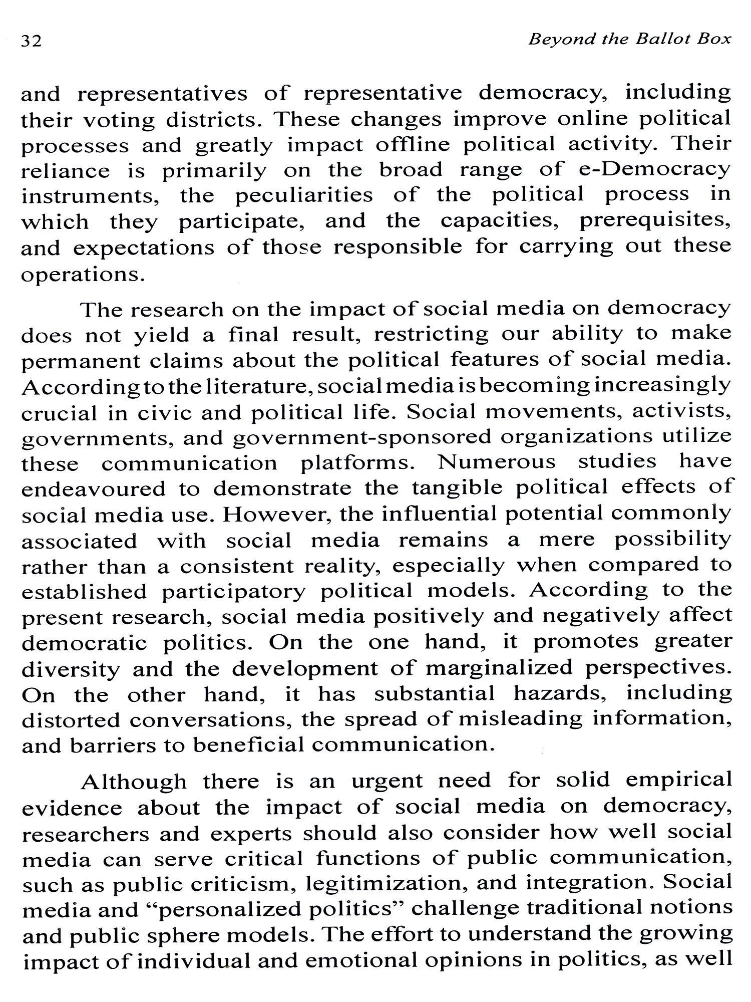 The chapters explore various themes, including grassroots mobilization, regulatory frameworks, ethical considerations, and the future of political communication. The chapters highlight the role of social media in amplifying voices, mobilizing movements, and shaping public opinion. At the same time, the darker aspects, such as the digital divide, misinformation, and the ethical dilemmas posed by emerging technologies, are discussed.