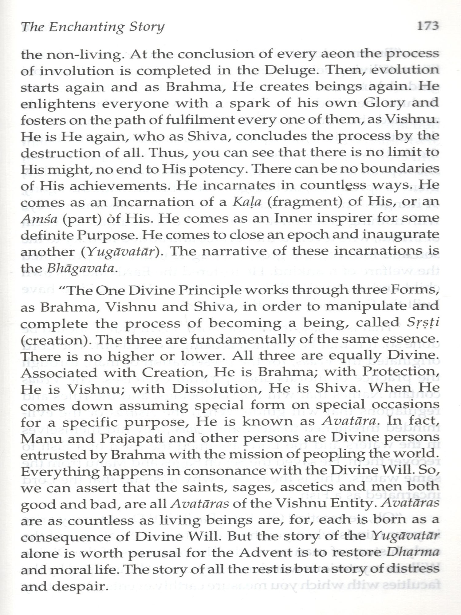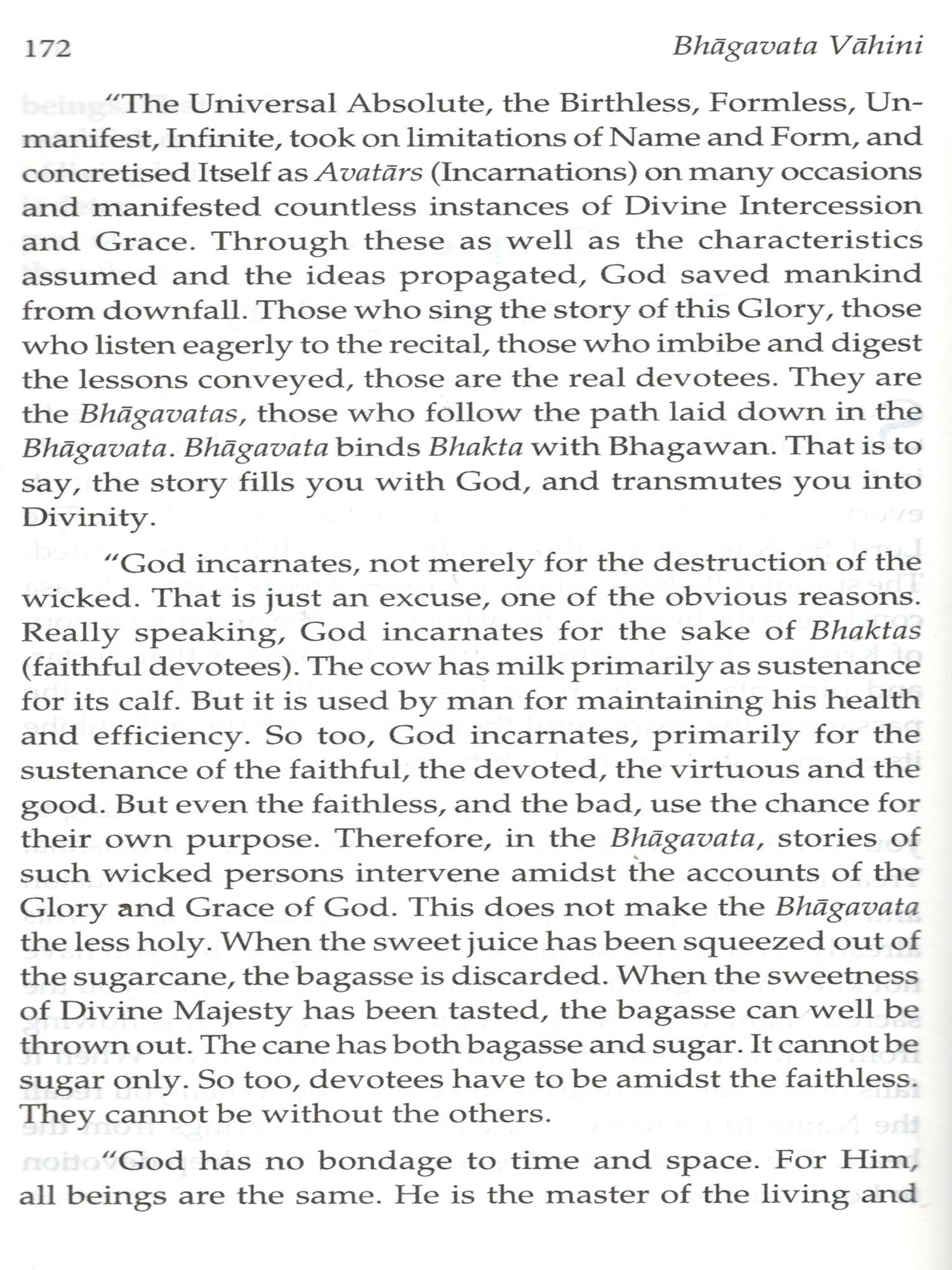 The Bhagavatha is a dialogue between King Parikshit under the sentence of death and the great Sage Suka, who prepares him to meet it. Sringi, the son of Sage Sameeka pronounces a curse on King Parikshit for the king’s wanton act of throwing a dead snake on his father when he was in deep meditation that King Parikshit will die on the seventh day bitten by a snake. The king decides to make amends for the wrong act and sanctifies his limited available time by listening to the glories of the Lord. It is for this reason that the second chapter of this book is appropriately titled "The Birth Of A Bhagavatha’ since it is to King Parikshit that the Story of the Glory of God is narrated by Sage Suka. The name Bhagavatha can be applied to every account of the experiences of those who have contacted God and the godly (Bhagawan and Bhaktha). The Bhagavatha is saturated with the sweetness of nectar: it shines with the splendour of God. Through the process of listening to the glory of the Lord a dull and drooping heart will be transformed into a clean, illumined abode of peace shining with genuine light. The listening will cleanse the heart through the prompting it gives for good work. Just as King Parikshit found solace and had sanctified his time by listening to the glorious Story of the Lord, every reader will derive benefit by reading and ruminating over the contents of this book written by Bhagawan Sri Sathya Sai Baba Himself.