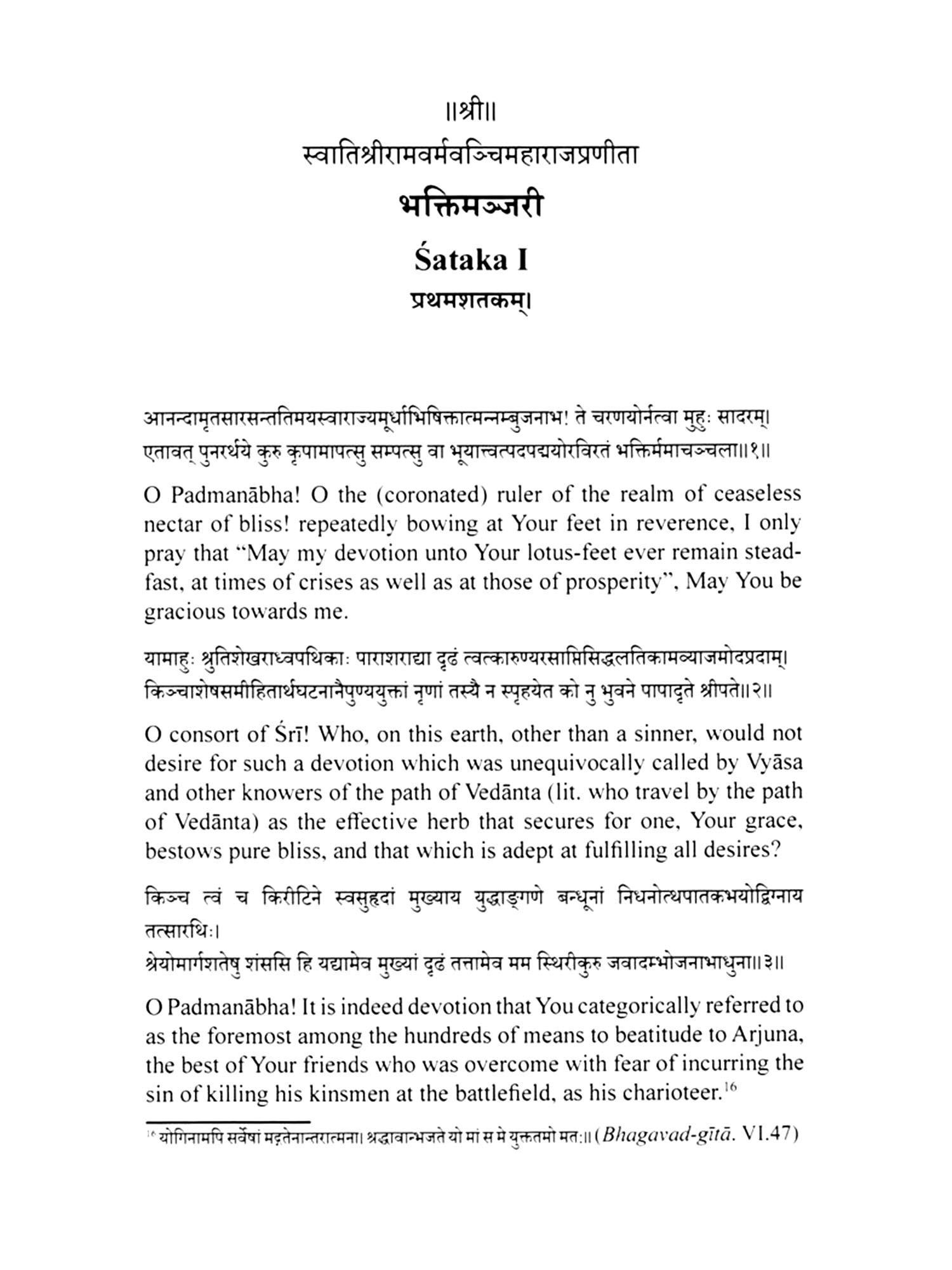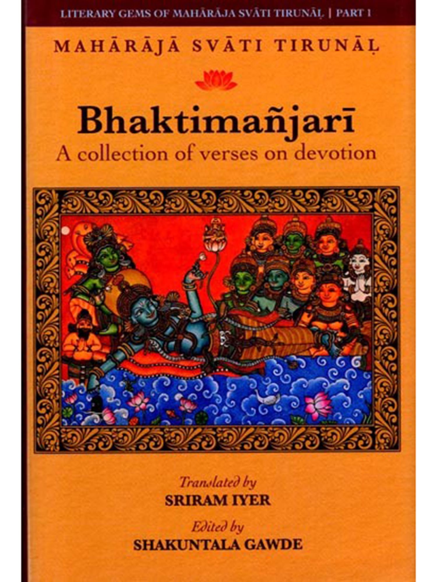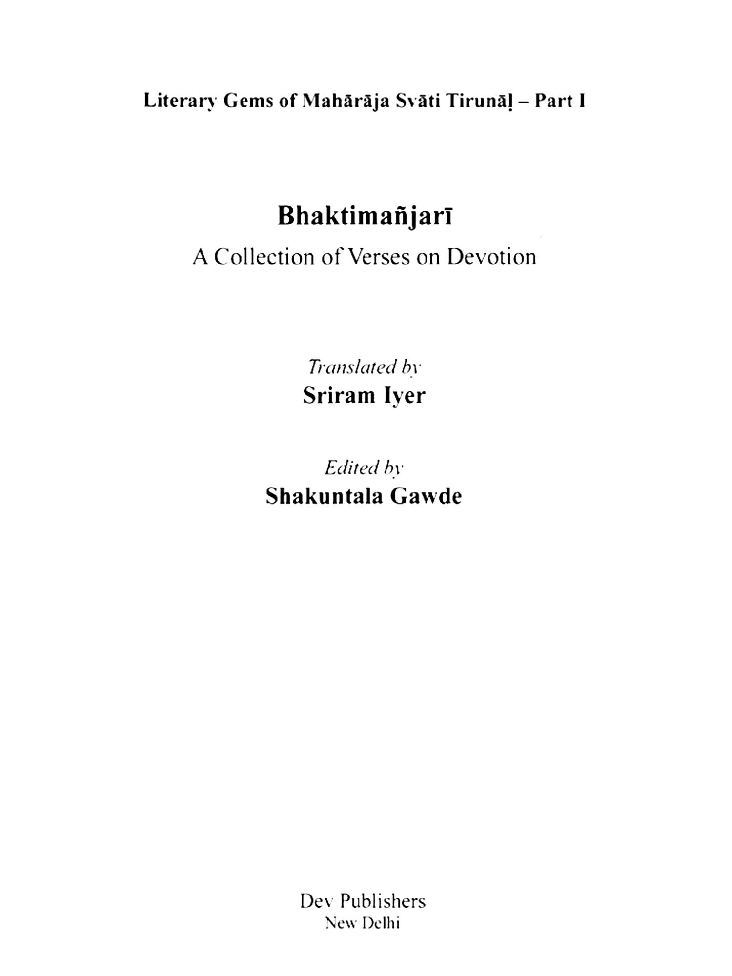 Bhakti-Manjarī is a unique poem composed by Maharaja Svati Tirunal (1813-1846) with bhakti as its central theme. With the Srimad Bhagavata Purana as its basis, Bhakti-Mañjarī expounds the philosophy of bhakti through its one thousand poetic verses divided over ten fatakas set to various metres. The supremacy of bhakti over all spiritual paths, the various classes of devotees, the selfless and spontaneous compassion of the Lord, the futility of human birth devoid of bhakti, etc. are some of the topics discussed in the work. A major portion of the work is dedicated to an elaborate delineation of the nine forms of devotion viz. śravana, kīrtana, smarana, pada-sevana, arcana, vandana, dasya, sakhya and atma-nivedana. Episodes from the Śrīmad-Bhagavata Purana such as the life of Prahlada, the redemption of Gajendra, the redemption of Ajamila, the self-surrender of Bali, etc, are briefly represented in the course of describing the various forms of devotion. The creation of the universe, its geographical divisions, duties of the four classes and stages of life, the procedure of reciting the Srimad-Bhagavata Purana, the rules of japa, consecration of sacred images, the greatness of Ganga and Tulasi are some of the other highlights of this great work. The brief representation of the pristine philosophy of bhakti through verses embellished with figures of sound and sense makes the work a cherished treasure of scholars and devotees, alike.