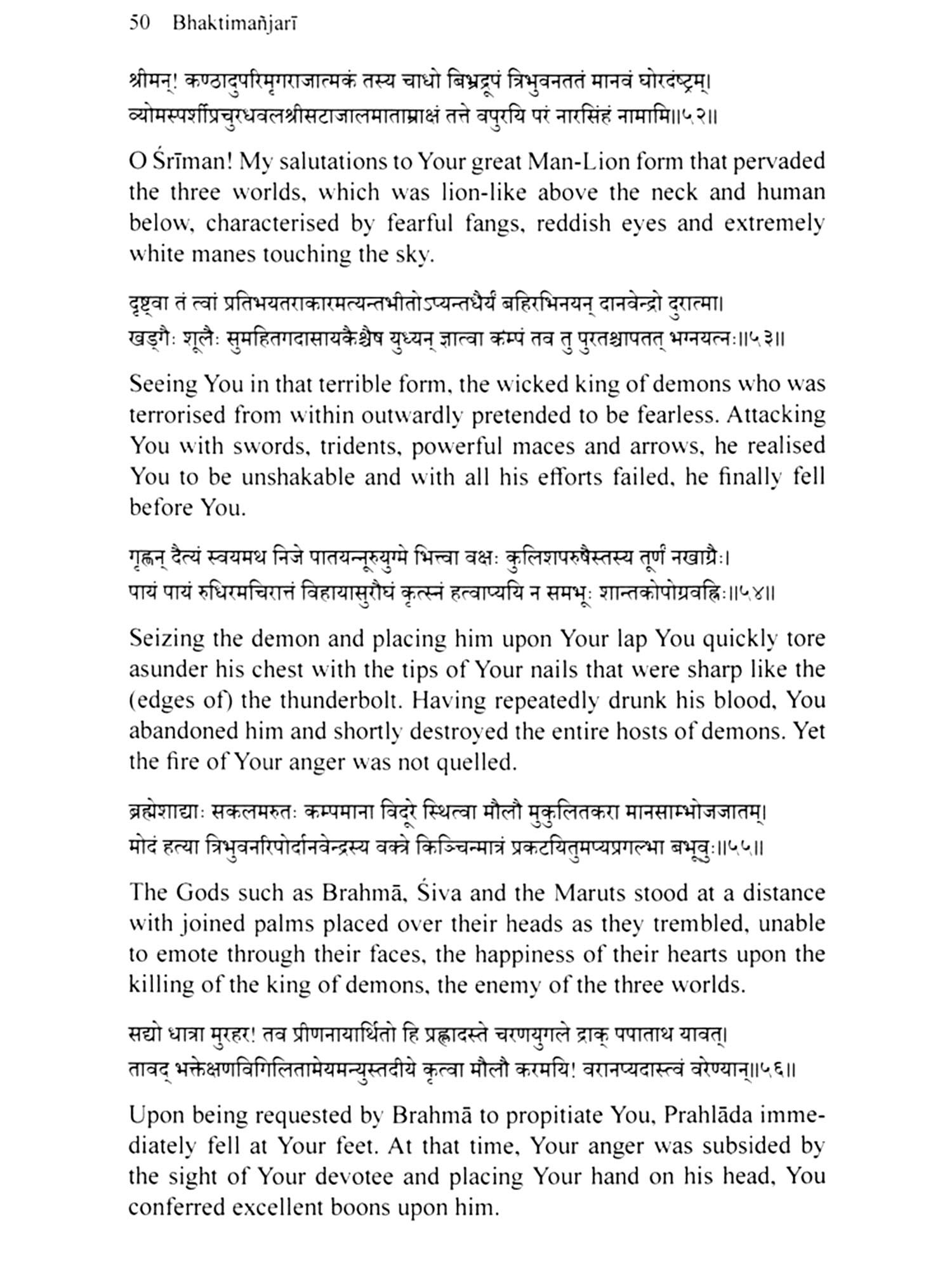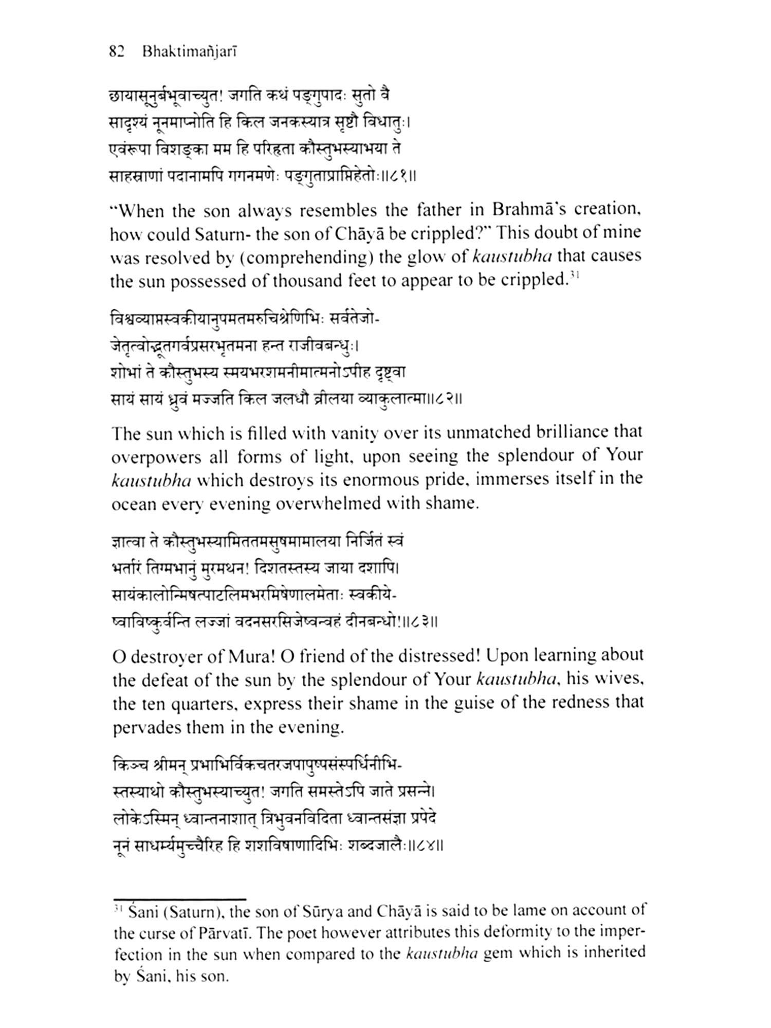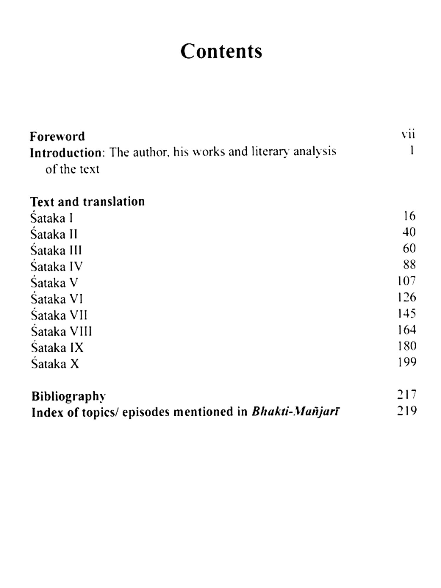Bhakti-Manjarī is a unique poem composed by Maharaja Svati Tirunal (1813-1846) with bhakti as its central theme. With the Srimad Bhagavata Purana as its basis, Bhakti-Mañjarī expounds the philosophy of bhakti through its one thousand poetic verses divided over ten fatakas set to various metres. The supremacy of bhakti over all spiritual paths, the various classes of devotees, the selfless and spontaneous compassion of the Lord, the futility of human birth devoid of bhakti, etc. are some of the topics discussed in the work. A major portion of the work is dedicated to an elaborate delineation of the nine forms of devotion viz. śravana, kīrtana, smarana, pada-sevana, arcana, vandana, dasya, sakhya and atma-nivedana. Episodes from the Śrīmad-Bhagavata Purana such as the life of Prahlada, the redemption of Gajendra, the redemption of Ajamila, the self-surrender of Bali, etc, are briefly represented in the course of describing the various forms of devotion. The creation of the universe, its geographical divisions, duties of the four classes and stages of life, the procedure of reciting the Srimad-Bhagavata Purana, the rules of japa, consecration of sacred images, the greatness of Ganga and Tulasi are some of the other highlights of this great work. The brief representation of the pristine philosophy of bhakti through verses embellished with figures of sound and sense makes the work a cherished treasure of scholars and devotees, alike.
