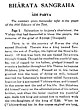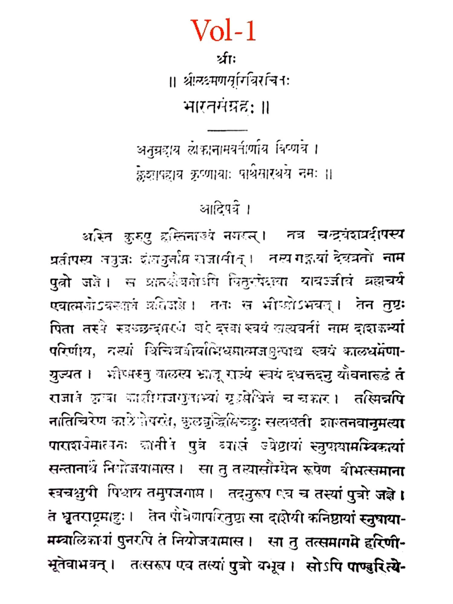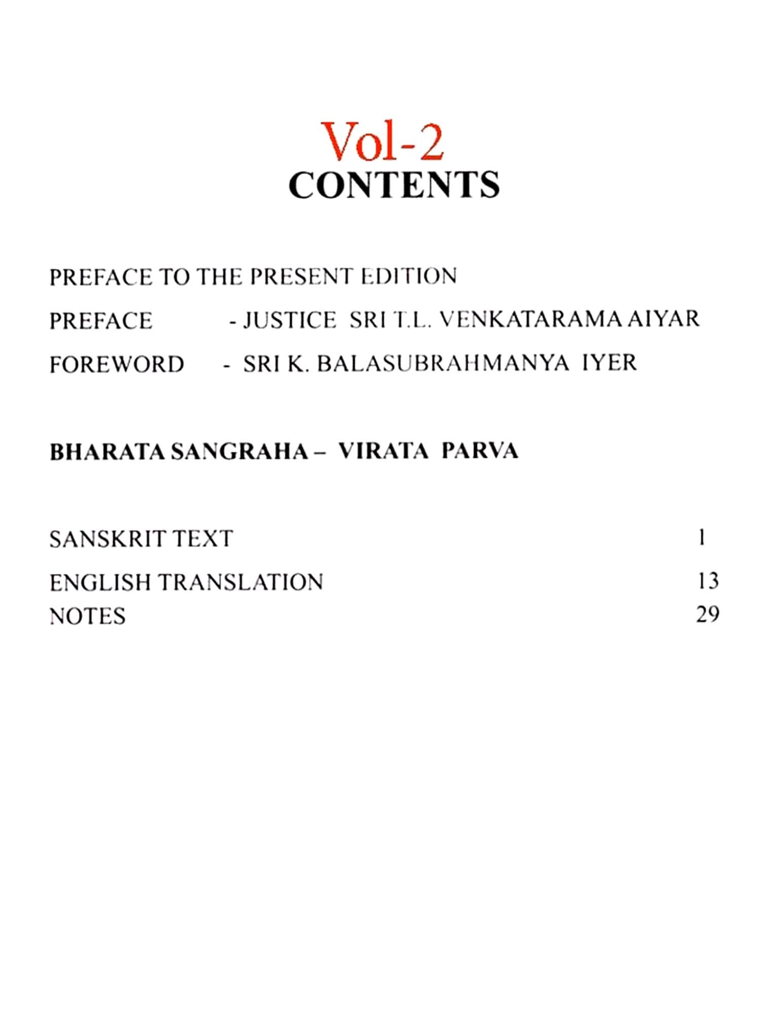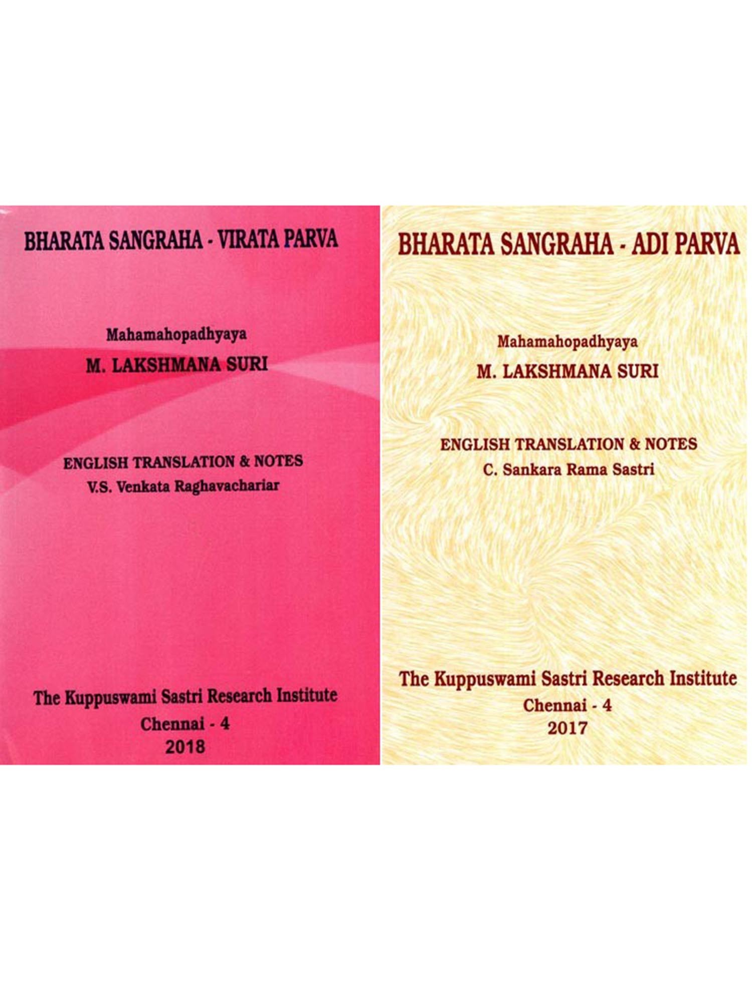 The author of the Bharata sangraha, Mahamahopadh-yaya Pandit M. Lakshmana Suri, was a renowned scholar and writer. He was born. in August 1859 in the village of Punalveli, near Srivilliputhur, Tirunelveli Dt. He belonged to a very respectable family. His father Muthusubba Kavi was also a great scholar and poet. Pandit Lakshmana Suri made an intensive study of Vyakarana and Vedanta and had deep erudition in both these sastras. He was a pupil of Subba Dikshitar of Kadayam, a well-known scholar. He was appointed as a Sanskrit Pandit in the year 1896 in the St. Peter's College, Tanjore, and continued there till the year 1907, when its college department was closed. During this period the late Mahamahopadhyaya Kuppuswami Sastrigal was a student under him. After 1907 he was employed as a Pandit in the Pachayappa's High School and continued there till 1920, when he retired. After retirement, he delivered discourses on Bhagavad Gita, Bhagavata and Vedanta Sutras in many places in South India. He passed away peacefully much to the regret of many of his pupils and friends on the 17th May, 1928. He left behind him three sons, the second son being Sri T. L. Venkatarama Iyer, now Judge, Supreme Court. It was during his stay at Tanjore that his career as a writer began. He wrote at first commentaries on the two dramas of Bhavabhuti, Uttararamacharitam and Mahaviracharitam, Anargharaghavam of Murari, Bala-Ramayanam of Rajasekhara and Venisamharam of Bhatta Narayana. He also wrote karikas on the major upanishads based on the Bhashya of Sri Sankaracharya. At the Vidvat Sadas held in the year 1903 on the occasion of the visit of Sir K. Seshadri Iyer, Dewan of Mysore, to Tanjore, the karikas were read and in recognition of their merit the Dewan of Mysore was pleased to confer the title of SURI on him. Ever since, he was known to the scholar-world as Lakshmana Suri. The Government of India conferred on him the title of Mahamahopadhyaya.
