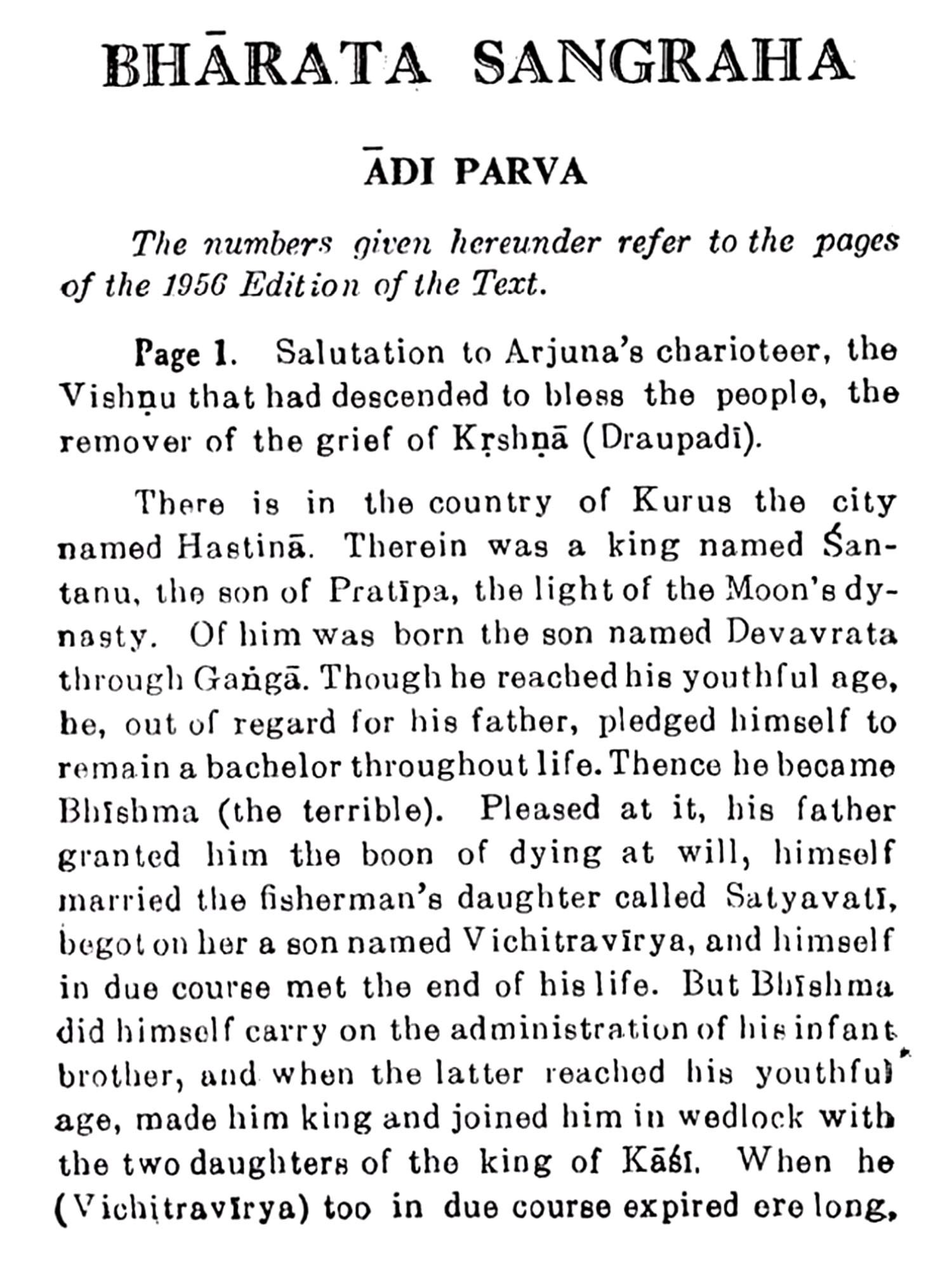 It is hardly necessary for me to write anything about the important place which my father's works occupy in modern Sanskrit literature, a place which has obtained international recognition. Sri K. Balasubramania Iyer, who has written a Foreword to this publication, was one of his beloved and devoted Sisyas, and he can speak about him with a knowledge and authority which few persons possess. To students of Sanskrit, the commentaries of my father on the Sanskrit dramas which earned for him the title of "a worthy successor to Mallinatha" and the prose works Bharata Sangraha, Ramayana Sangraha, Nalo-pakhyana Sangraha and Bhisma Vijaya-which are practically the first and the best of their kind-are bound to be invaluable. It is accordingly proposed to start with the publication of these prose works. Then, there are the Karikas on the ten Upanisads, which still await publication, and they have also a special claim on our attention. Last but not least will be the poems, dramas and other miscellaneous works. This Bharata Sangraha then will be the first of a series, which will comprise all the works of my father.