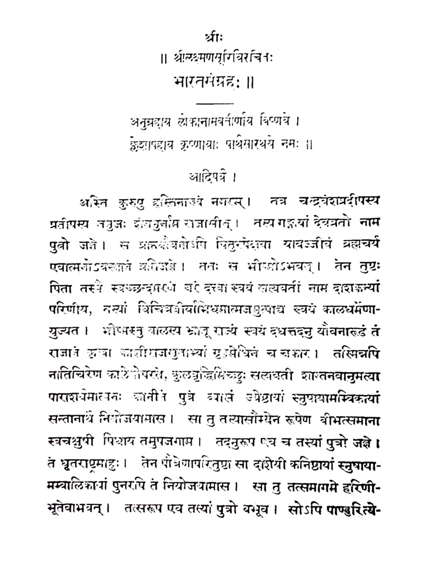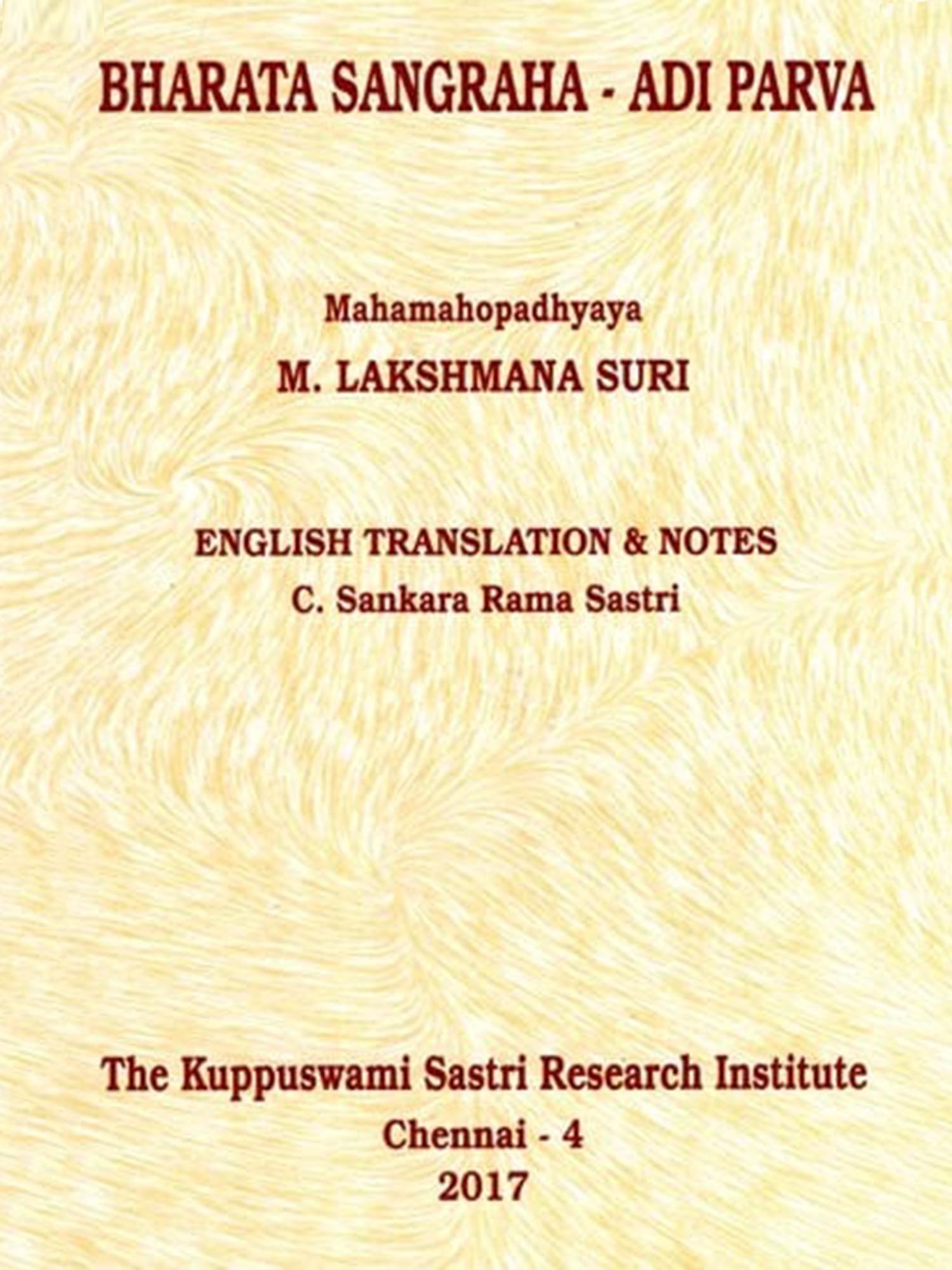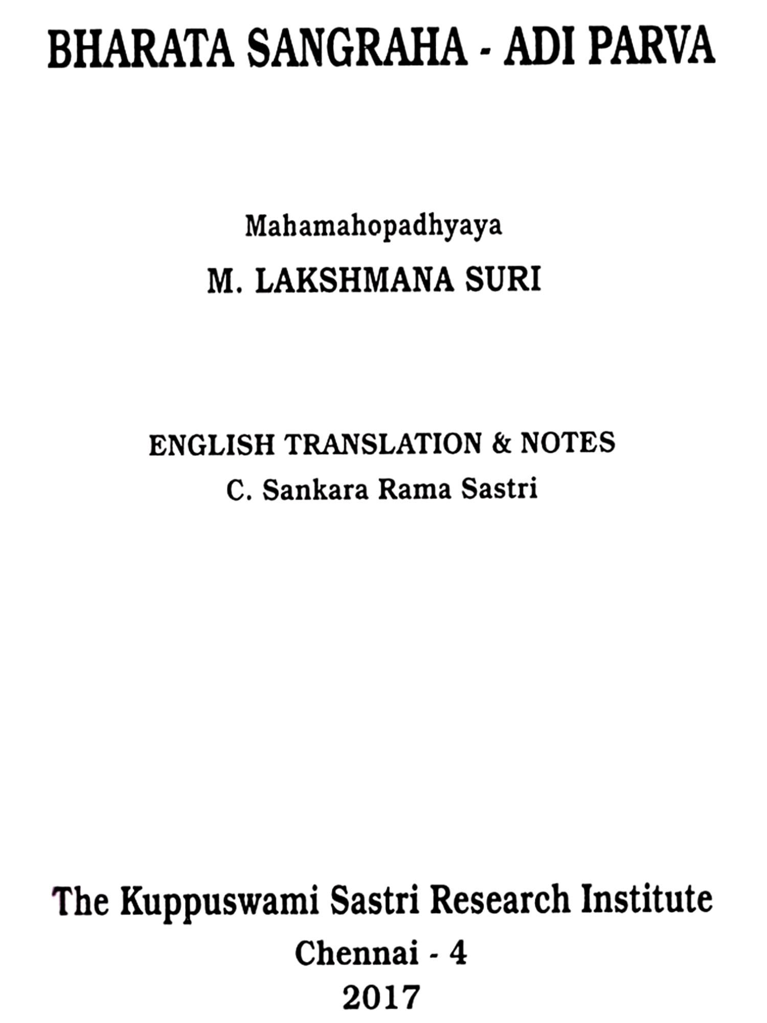 The author of the Bharata sangraha, Mahamahopadh-yaya Pandit M. Lakshmana Suri, was a renowned scholar and writer. He was born. in August 1859 in the village of Punalveli, near Srivilliputhur, Tirunelveli Dt. He belonged to a very respectable family. His father Muthusubba Kavi was also a great scholar and poet. Pandit Lakshmana Suri made an intensive study of Vyakarana and Vedanta and had deep erudition in both these sastras. He was a pupil of Subba Dikshitar of Kadayam, a well-known scholar. He was appointed as a Sanskrit Pandit in the year 1896 in the St. Peter's College, Tanjore, and continued there till the year 1907, when its college department was closed. During this period the late Mahamahopadhyaya Kuppuswami Sastrigal was a student under him. After 1907 he was employed as a Pandit in the Pachayappa's High School and continued there till 1920, when he retired. After retirement, he delivered discourses on Bhagavad Gita, Bhagavata and Vedanta Sutras in many places in South India. He passed away peacefully much to the regret of many of his pupils and friends on the 17th May, 1928. He left behind him three sons, the second son being Sri T. L. Venkatarama Iyer, now Judge, Supreme Court. It was during his stay at Tanjore that his career as a writer began. He wrote at first commentaries on the two dramas of Bhavabhuti, Uttararamacharitam and Mahaviracharitam, Anargharaghavam of Murari, Bala-Ramayanam of Rajasekhara and Venisamharam of Bhatta Narayana. He also wrote karikas on the major upanishads based on the Bhashya of Sri Sankaracharya. At the Vidvat Sadas held in the year 1903 on the occasion of the visit of Sir K. Seshadri Iyer, Dewan of Mysore, to Tanjore, the karikas were read and in recognition of their merit the Dewan of Mysore was pleased to confer the title of SURI on him. Ever since, he was known to the scholar-world as Lakshmana Suri. The Government of India conferred on him the title of Mahamahopadhyaya.