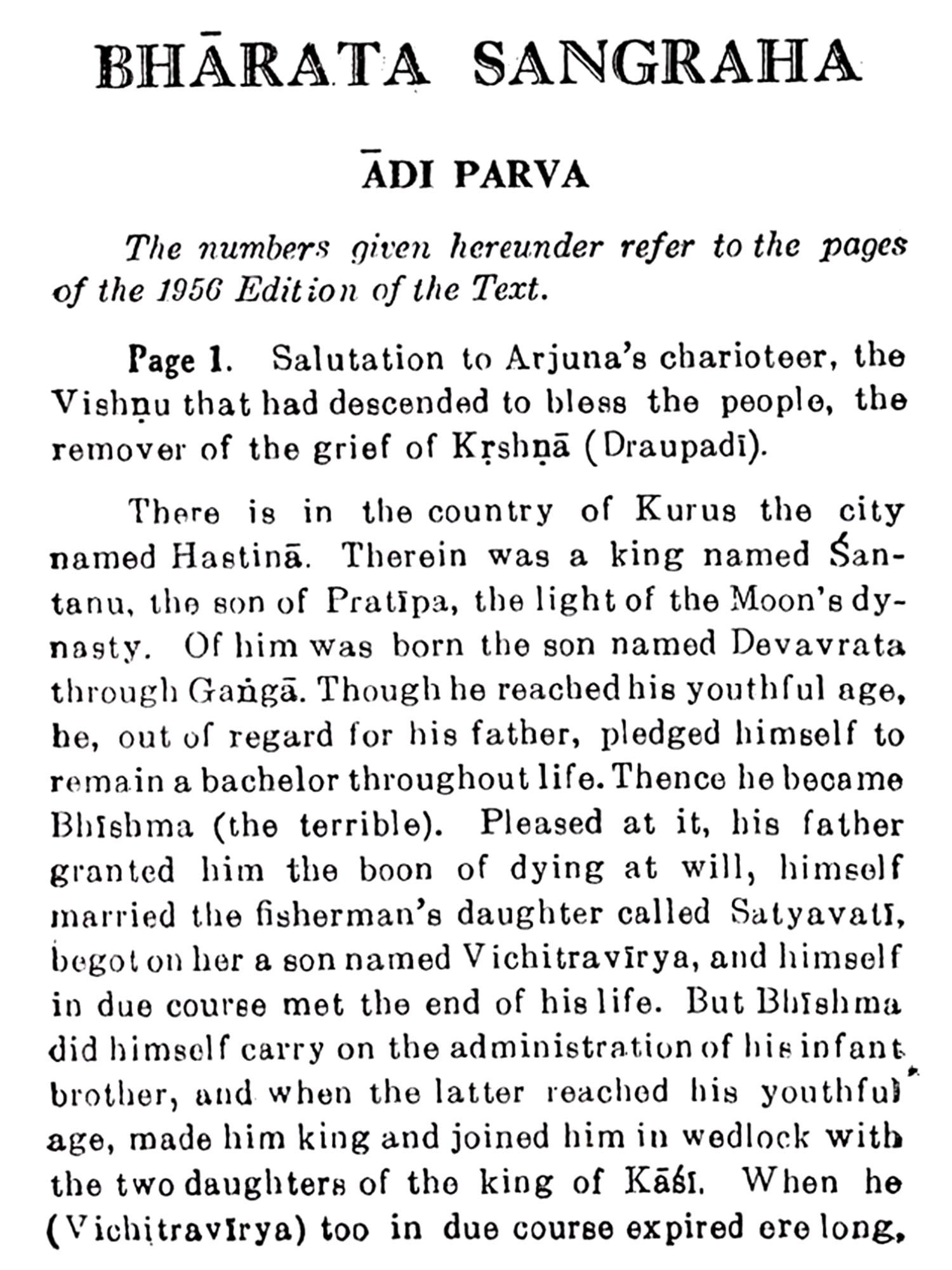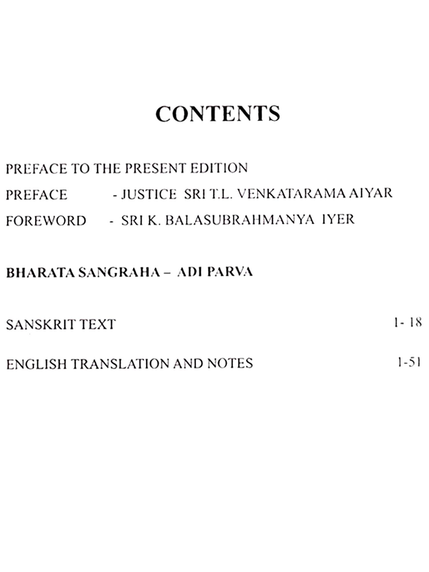 It is hardly necessary for me to write anything about the important place which my father's works occupy in modern Sanskrit literature, a place which has obtained international recognition. Sri K. Balasubramania Iyer, who has written a Foreword to this publication, was one of his beloved and devoted Sisyas, and he can speak about him with a knowledge and authority which few persons possess. To students of Sanskrit, the commentaries of my father on the Sanskrit dramas which earned for him the title of "a worthy successor to Mallinatha" and the prose works Bharata Sangraha, Ramayana Sangraha, Nalo-pakhyana Sangraha and Bhisma Vijaya-which are practically the first and the best of their kind-are bound to be invaluable. It is accordingly proposed to start with the publication of these prose works. Then, there are the Karikas on the ten Upanisads, which still await publication, and they have also a special claim on our attention. Last but not least will be the poems, dramas and other miscellaneous works. This Bharata Sangraha then will be the first of a series, which will comprise all the works of my father.