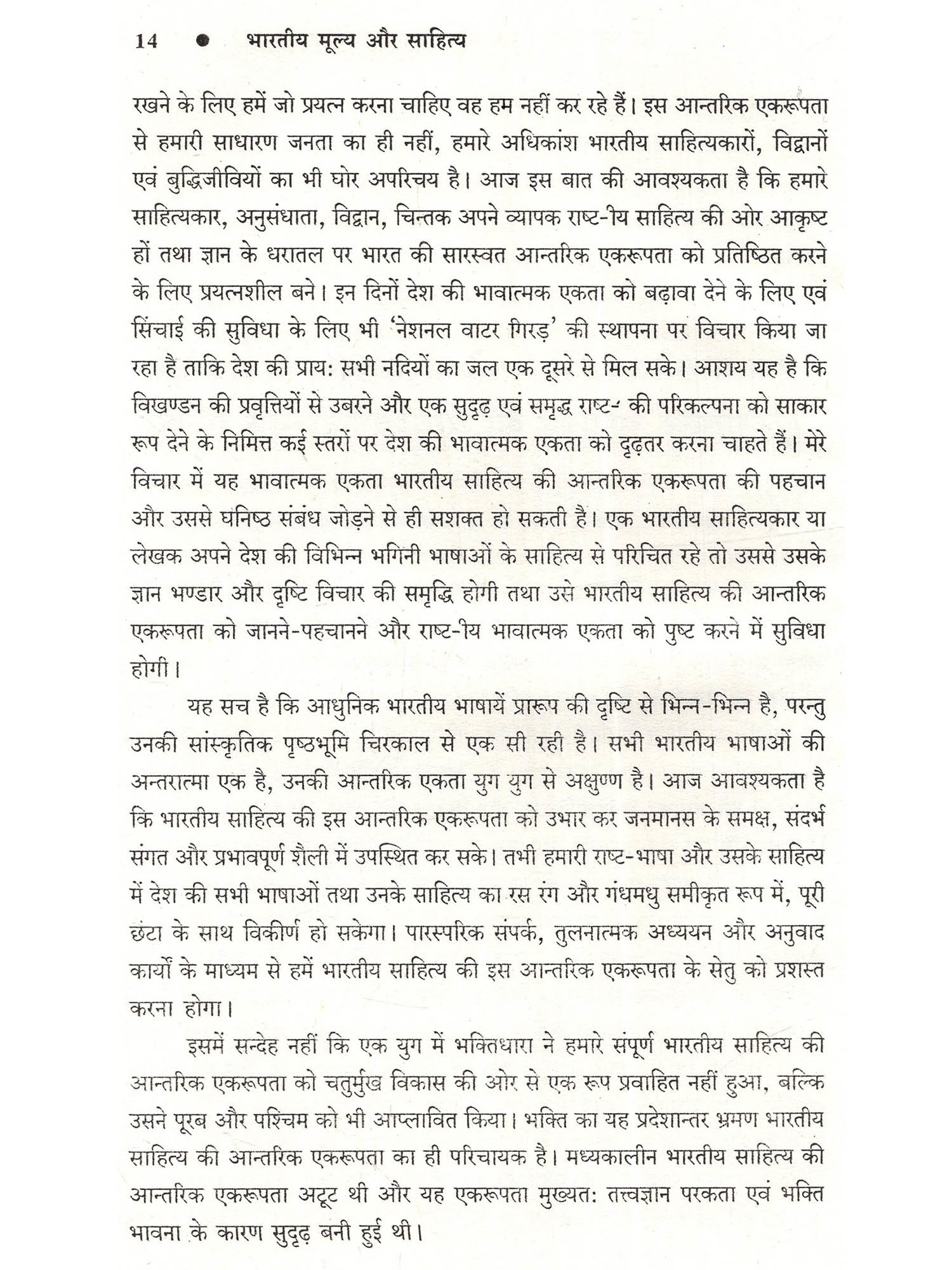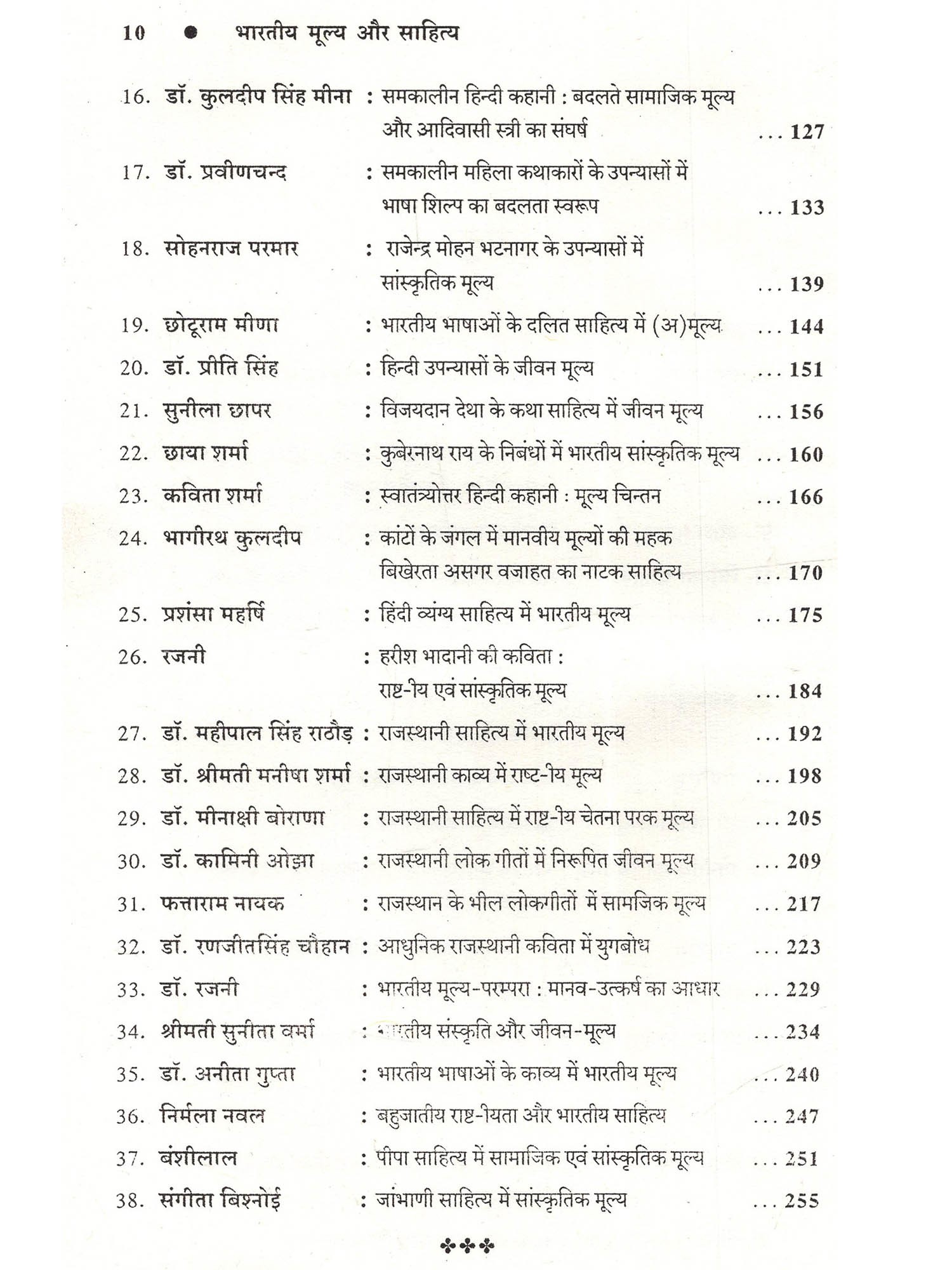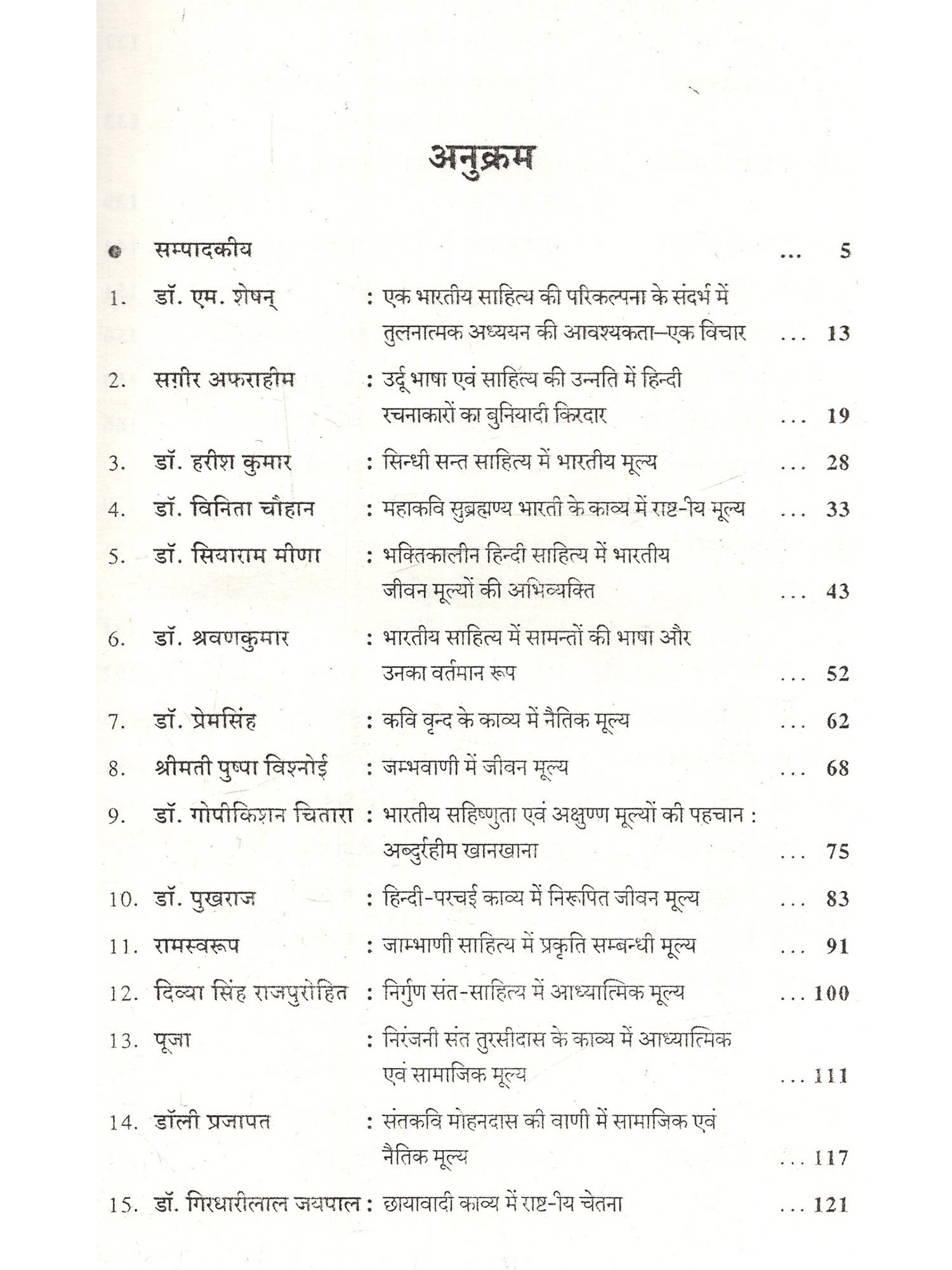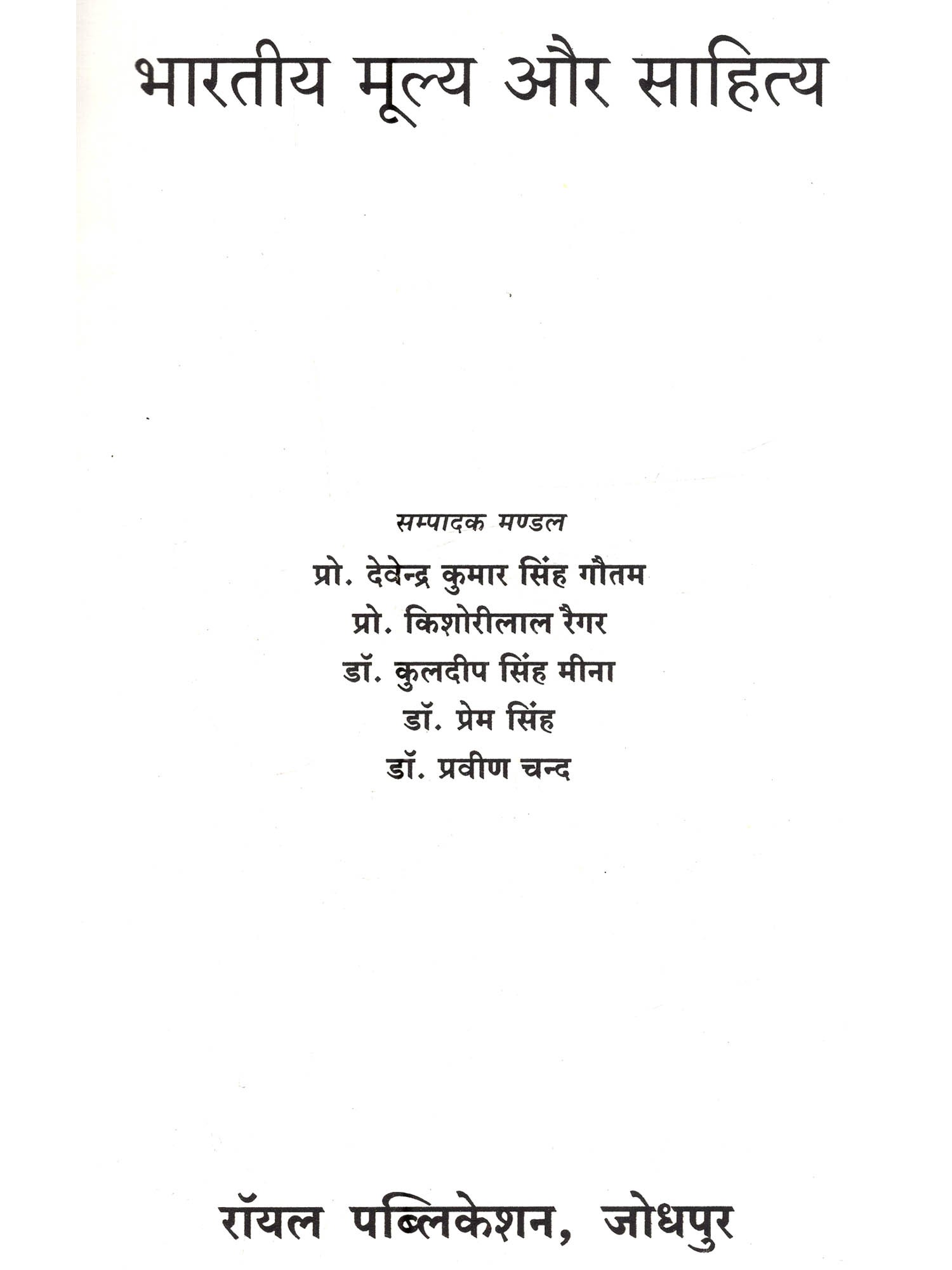 प्रस्तुत पुस्तक भारतीय साहित्य में भारतीय मूल्यों पर केन्द्रित है। जिसमें विभिन्न भारतीय भाषाओं के साहित्य में भारतीय फूल्यों जैसे राष्ट्रीय एकता, धार्मिकता, आध्यात्मिकता, सहिष्णुता, धर्म-निरपेक्षता, वसुधैव कुटुम्बकम् की भावना, समन्वयदाट, दया, करुणा, प्रेम, सत्व, अहिंसा, अपरिग्रह, न्याय, समता, मानवतावाद, तप, निष्ठा, ज्ञान, भक्ति, वैराग्य, वीरता, विश्वास, श्रद्धा, जन-कल्याण, रहस्यवाद, सौंदर्यबोध, जनतांत्रिक आस्था, श्रम, ममत्व, परस्पर सद्भावना आदि की सहज अभिव्यक्ति हुई है। भारतीय भाषाओं के आदिकालीन साहित्य से लेकर अधुनातन साहित्य में उपर्युक्त भारतीय मूल्य घनीभूत रूप से परिलक्षित होते हैं। इस पुस्तक में 38 आलेखों का प्रस्तुतीकरण किया गया है, जिसमें भारतीय साहित्य की परिकल्पना, विविध भाषाओं के साहित्य का तुलनात्मक अध्ययन तथा तमिल, उर्दू, सिन्धी, हिन्दी, राजस्थानी आदि भाषाओं के साहित्य की विविध विधाओं में निहित जीवन-मूल्यों को प्रकट किया गया है। भक्तिकालीन साहित्य में अभिव्यक्त मूल्यों में जाम्भाणी साहित्य में निरूपित जीवन-मूल्य, प्रकृति सम्बन्धी मूल्य, संत कवियों के काव्य में आध्यात्मिक एवं सामाजिक मूल्य एवं नैतिक मूल्य को चित्रित किया है। साथ ही आधुनिक काल में साहित्य के बदलते हुए परिदृश्य में दलित, आदिवासी और स्त्री लेखन में निहित सामाजिक मूल्यों को वर्तमान संदर्भ में विश्लेषित करने का प्रयास किया गया है। हिन्दी उपन्यास, नाटक, कहानी, निबन्धों के साथ ही व्यंग्य जैसी विधाओं में निहित मूल्यों का प्रतिपादन किया है। इन प्रमुख भाषाओं के साथ राजस्थानी भाषा की विविध विधाओं में निरूपित राष्ट्रीय मूल्य, सामाजिक मूल्य और जीवन-मूल्यों का चित्रण किया गया है। इस विषय की महत्ता एवं प्रासंगिकता इसलिए भी औचित्यपूर्ण सिद्ध हो रही है कि यह पुस्तक केवल साहित्यिक ही नहीं बल्कि व्यक्ति व समाज को एक नई दिशा देने का सार्थक प्रयास है। इतना ही नहीं पुस्तक में सम्मिलित शोध-आलेख भारतीय संस्कृति, राष्ट्रीय अस्मिता और उनसे जुड़ी तमाम सात्विक मानसिकताओं से उपजे भारतीय मूल्यों का उद्घाटन है, जो पूरे विश्व में भारतीयता और उसके अक्षुण्ण मूल्यों को प्रकाश में लाते हैं, जिसके कारण हमारी संस्कृति और साहित्य की पहचान विश्व पटल पर अलग ही दृष्टिगोचर होती है। इस पुस्तक में शोध-आलेखों के माध्यम से भारतीय साहित्य में निहित मूल्यों का उल्लेख कर उनके माध्यम से जीवन जीने तथा अन्तर्राष्ट्रीय स्तर पर लाने का प्रयास कर नवीन साहित्य का सृजन करने का आह्वान किया है, जो निश्चित रूप से इस दिशा में एक नया कदम साबित होगा।