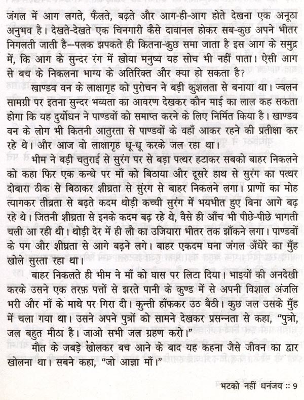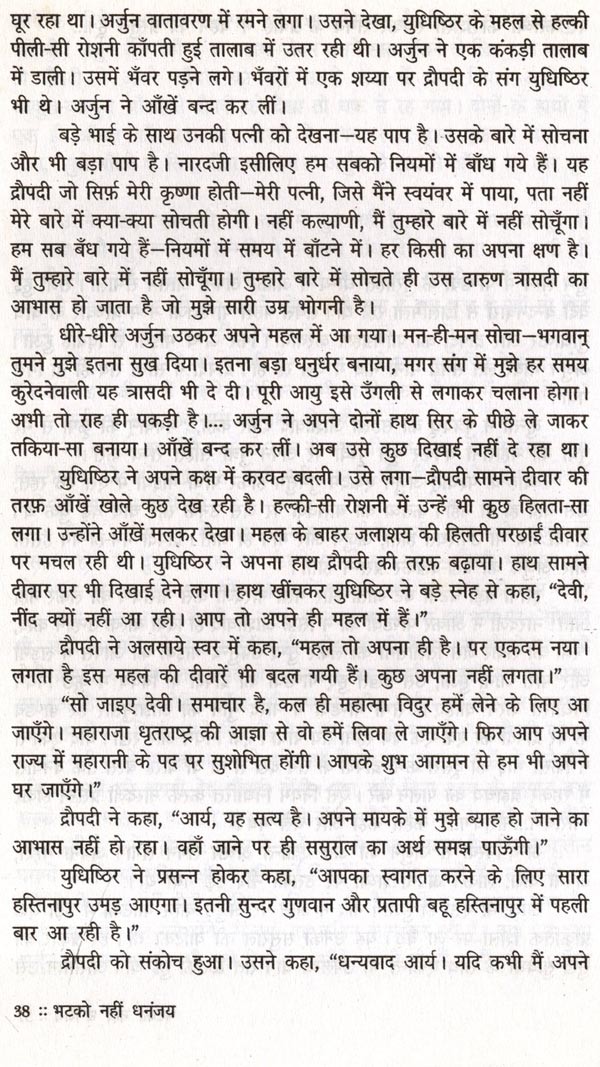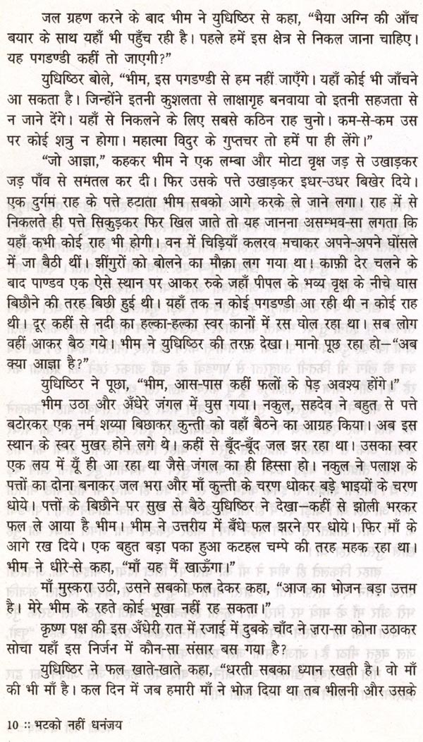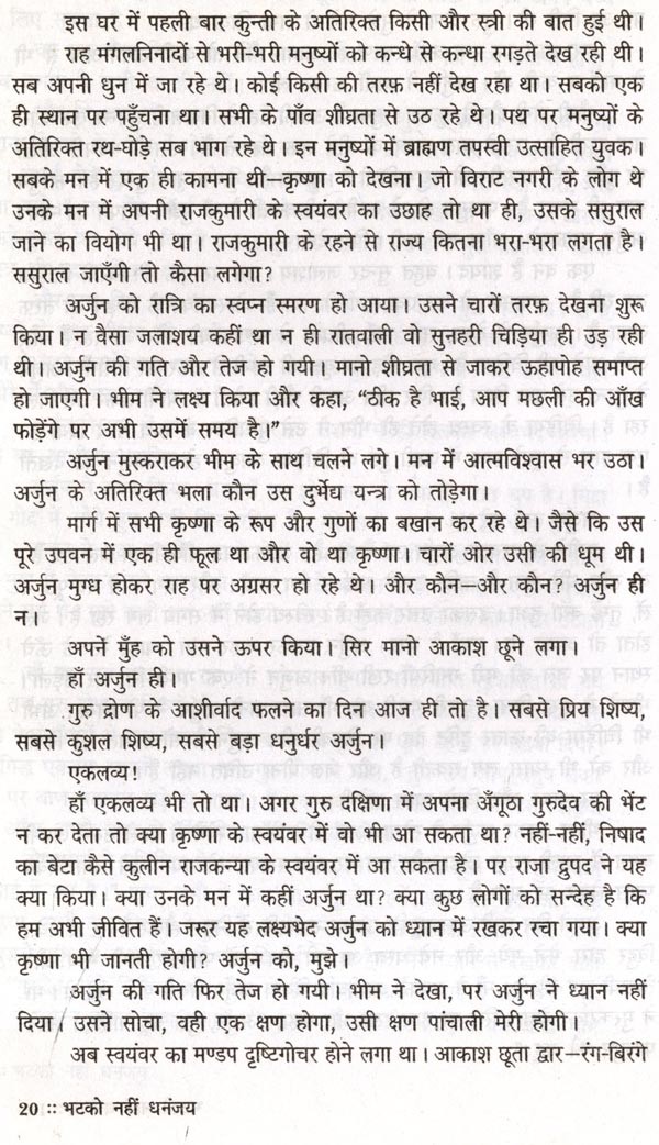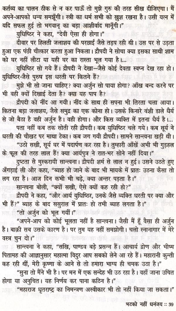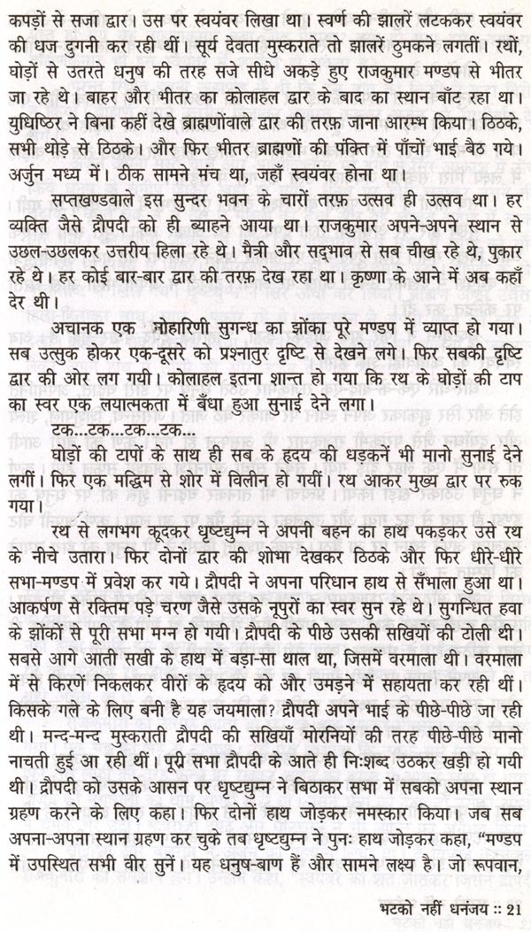 महाभारत सात समुद्रों से भी विशाल है। 'मटको नहीं धनंजय' में मैंने एक बूँद लेकर कुछ पृष्ठ भिगोने का यत्न किया है। कई दिन अर्जुन पीछे पड़े रहे। अर्जुन की त्रासदी को भोगते-भोगते में बहुत कुछ अर्जुन हो गयी अर्जुन, जो द्रौपदी भी है। स्त्री को त्रासदी भोगने का अभ्यास होता है, फिर भी त्रासदी तो है ही। यन्त्र बन जाने की त्रासदी बड़ी भयानक है, पर वीर पुरुष के लिए अपनी पत्नी बाँटने के अपमान से बड़ा कोई अपमान नहीं। दोनों को जिया है मैंने, और उसी तरह काग़ज पर उतारने का यत्न किया है मैंने।