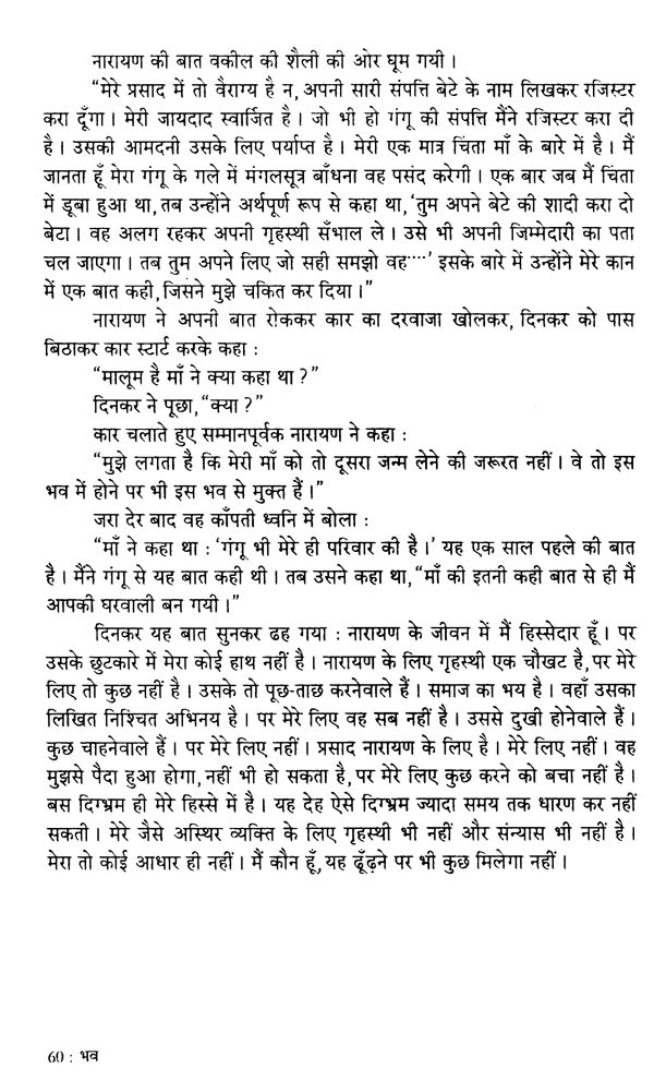 ज्ञानपीठ पुरस्कार से सम्मानित आधुनिक कन्नड़ भाषा के अप्रतिम साहित्यकार प्रो.यू.आर. अनन्तमूर्ति के उपन्यास 'भव' का यह नया संस्करण हिन्दी पाठकों के लिए प्रस्तुत है। अनन्तमूर्ति के समग्र कथा-लेखन में एक समाजविज्ञानी चिन्तक की मूल्यपरक सैद्धान्तिक दृढ़ता और कथाकार की सृजनात्मक संश्लिष्टता के बीच तमाम तरह के बहुआयामी संघर्ष विद्यमान हैं। दरअसल, उनकी प्रत्येक कथाकृति में अनेक दृष्टिकोण एक साथ उभरते हैं, जिनका सरलीकरण करके उस पर कोई एकपक्षीय धारणा बनाना असम्भव है। इस दृष्टि से उनका यह उपन्यास 'भव' भी इसका अपवाद नहीं है। जटिल रूपकों और चरित्रों के माध्यम से सिद्धान्त और कला के बीच चलता एक अन्तहीन संघर्ष 'भव' में भी पूरे वैचारिक साहस के साथ उपस्थित है। कहा जा सकता है कि विचार और शिल्प के स्तर पर 'भव' अनन्तमूर्ति की रचना-यात्रा का एक नया दिशा-संकेत भी है; साथ ही यह उपन्यास शायद उनकी गतिशील सृजनात्मकता के एक और नये पक्ष का उद्घाटन भी है।