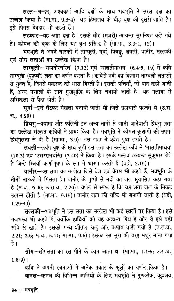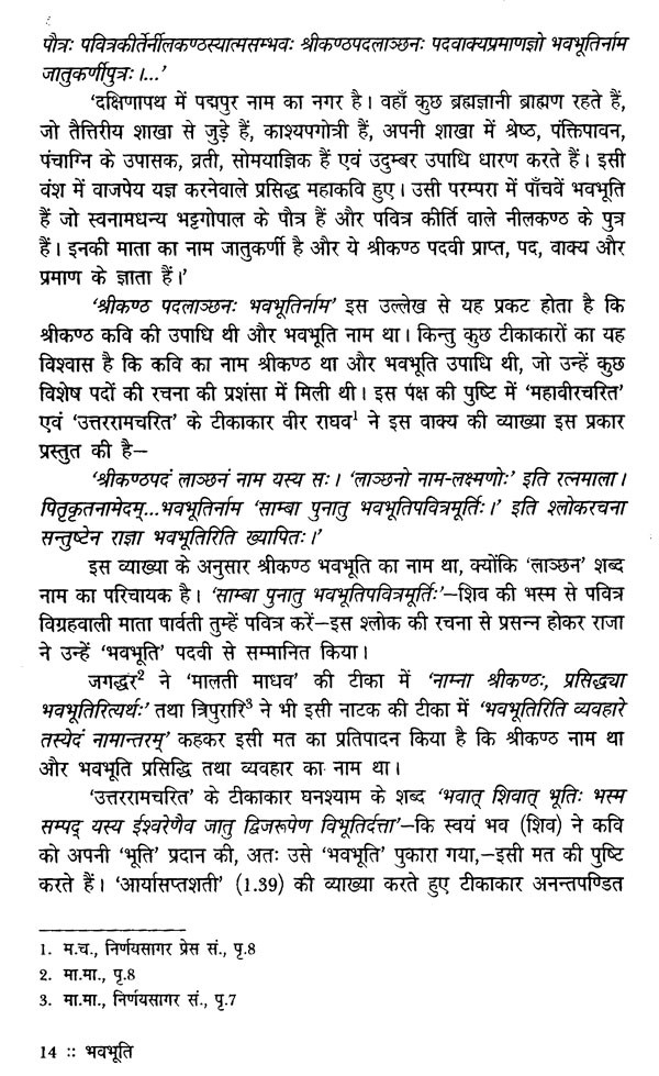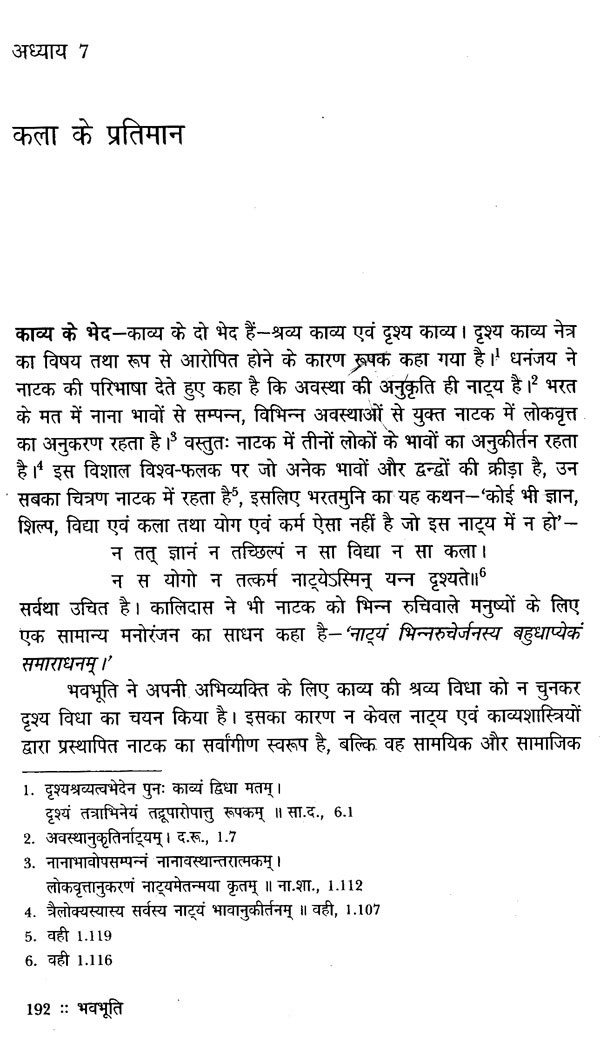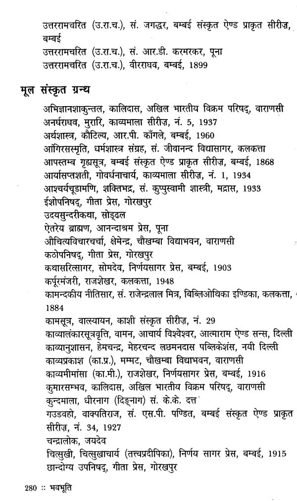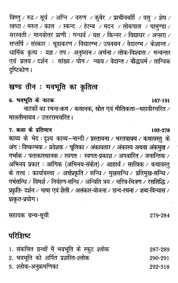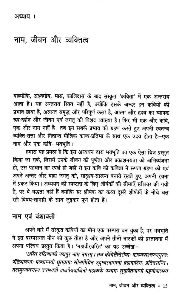 संस्कृत-साहित्य के कालजयी रचनाकार भवभूति पर केन्द्रित इस पुस्तक में भवभूति के जीवन और रचना-कर्म का, पूरी समग्रता के साथ, सार्थक एवं सर्जनात्मक विवेचन है। अपनी इस विवेचना में डॉ. अमृता भारती ने भवभूति का ऐसा प्रभावी चित्र प्रस्तुत किया है जिसमें उनके जीवन की पूर्णता और प्रकाशमयता अभिव्यंजित है; उस पहचान का संस्पर्श है, जहाँ से भवभूति की कविता ने रूपता ग्रहण की तथा अपने अन्तर और बाह्य-जगत् को सादृश्य-सारूप्य बनाये रखते हुए, अपनी रचनाओं में प्रकट किया। पुस्तक में भवभूति के जीवन, व्यक्तित्व तथा उनके परिवेश और पाण्डित्य को सघनता और तार्किकता के साथ उजागर करने के साथ ही भवभूति-कालीन भारत के भूगोल, समाज, संस्कृति, धर्म, दर्शन, राज्य एवं राजनीति का शोधपूर्ण प्रामाणिक विवेचन है। इसमें नाटककार भवभूति के सर्जनात्मक अवदान का भी विश्लेषण है। अमृता भारती ने कला-प्रतिमानों के परिप्रेक्ष्य में, भवभूति के तीनों यशस्वी नाटकों-'महावीर-चरित', 'मालती-माधव' एवं 'उत्तररामचरित' -में कथावस्तु के विकास, चरित्र-चित्रण, रस-सिद्धि, छन्द-विधान, अलंकार-योजना, भाषा एवं शैली-शिल्प आदि की गम्भीर विवेचना की है। अपने विषय-क्षेत्र की इस महत्त्वपूर्ण पुस्तक में सुधी अध्येताओं के लिए बहुआयामी भवभूति-अध्ययन एक बड़े फलक पर प्रस्तुत है।