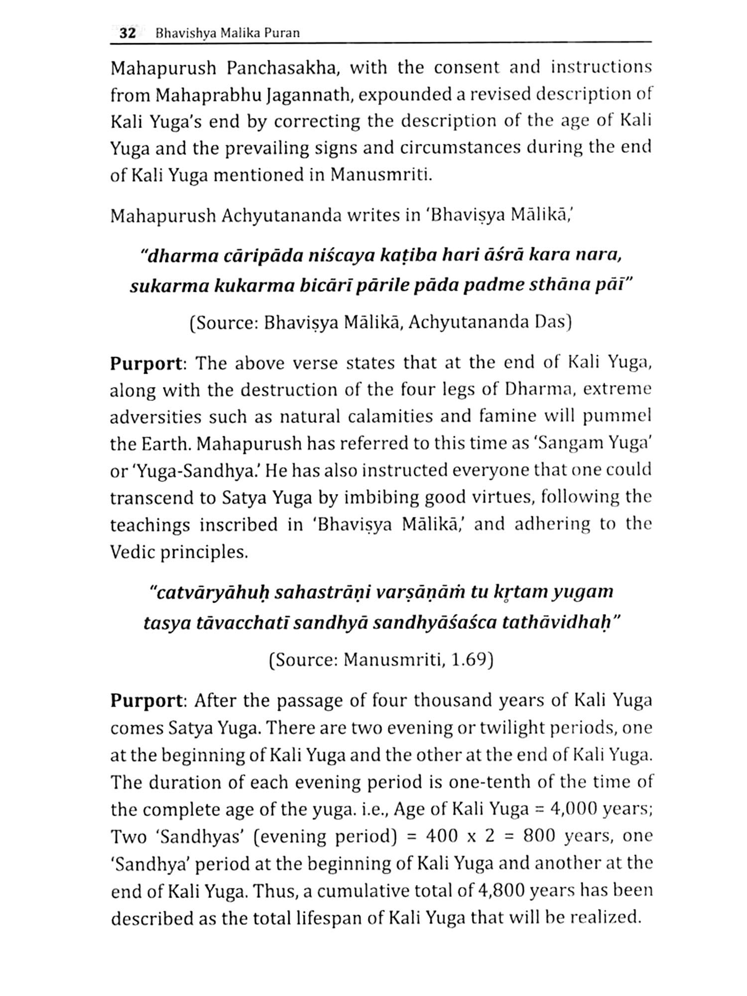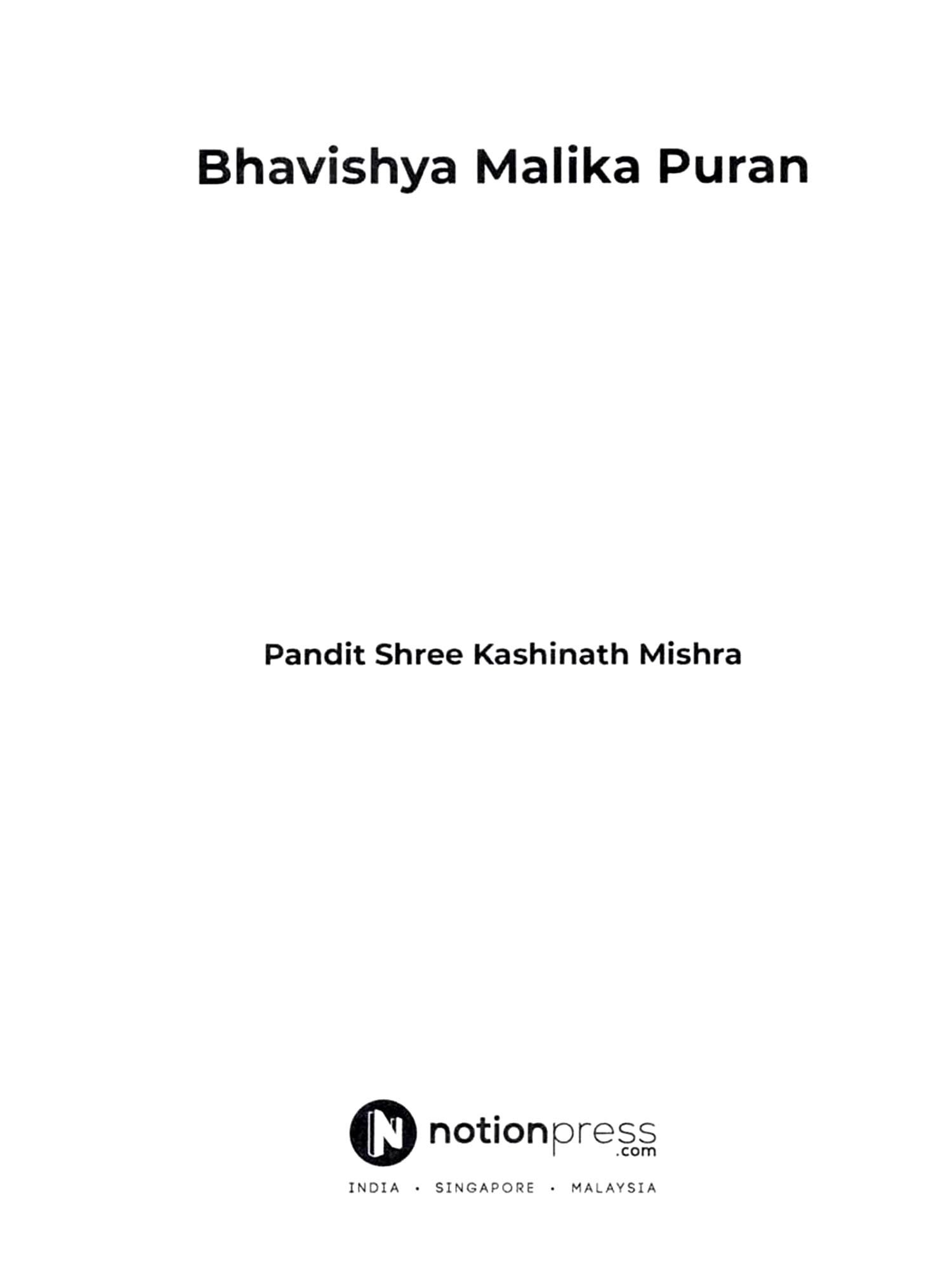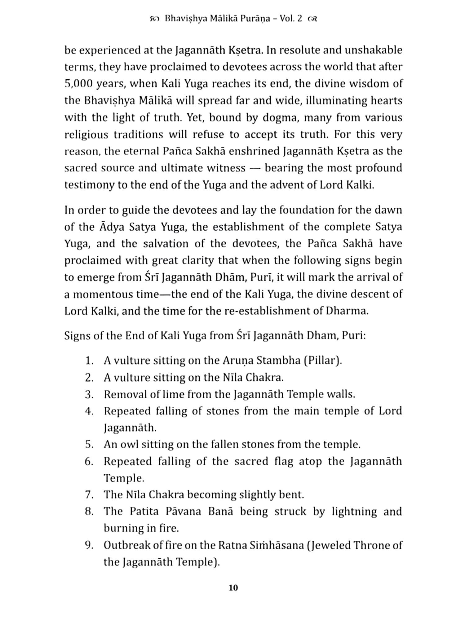 With the boundless blessings of Supreme Lord Shree Jagannath, Goddess Maa (Mother) Shree Biraja, Goddess Maa Shree Saraswati, and Lord Shree Ganesha, I am honored to present to you my translation of the 'Bhavisya Malika." This divine collection of books was written six-hundred years ago by the 'Panchasakha' (Five divine companions of Supreme Lord Shree Jagannath) in the ancient Odia language, and I have endeavoured to translate its quintessence into Hindi, English, and other languages. My objective behind this translation is to contribute towards humanity's welfare by rekindling the values of Sanatan Dharma worldwide. I believe that this book will be of great help to true. Devotees in resurrecting their lost traditions and virtues from their past lives and progressing toward the Satya Yuga.