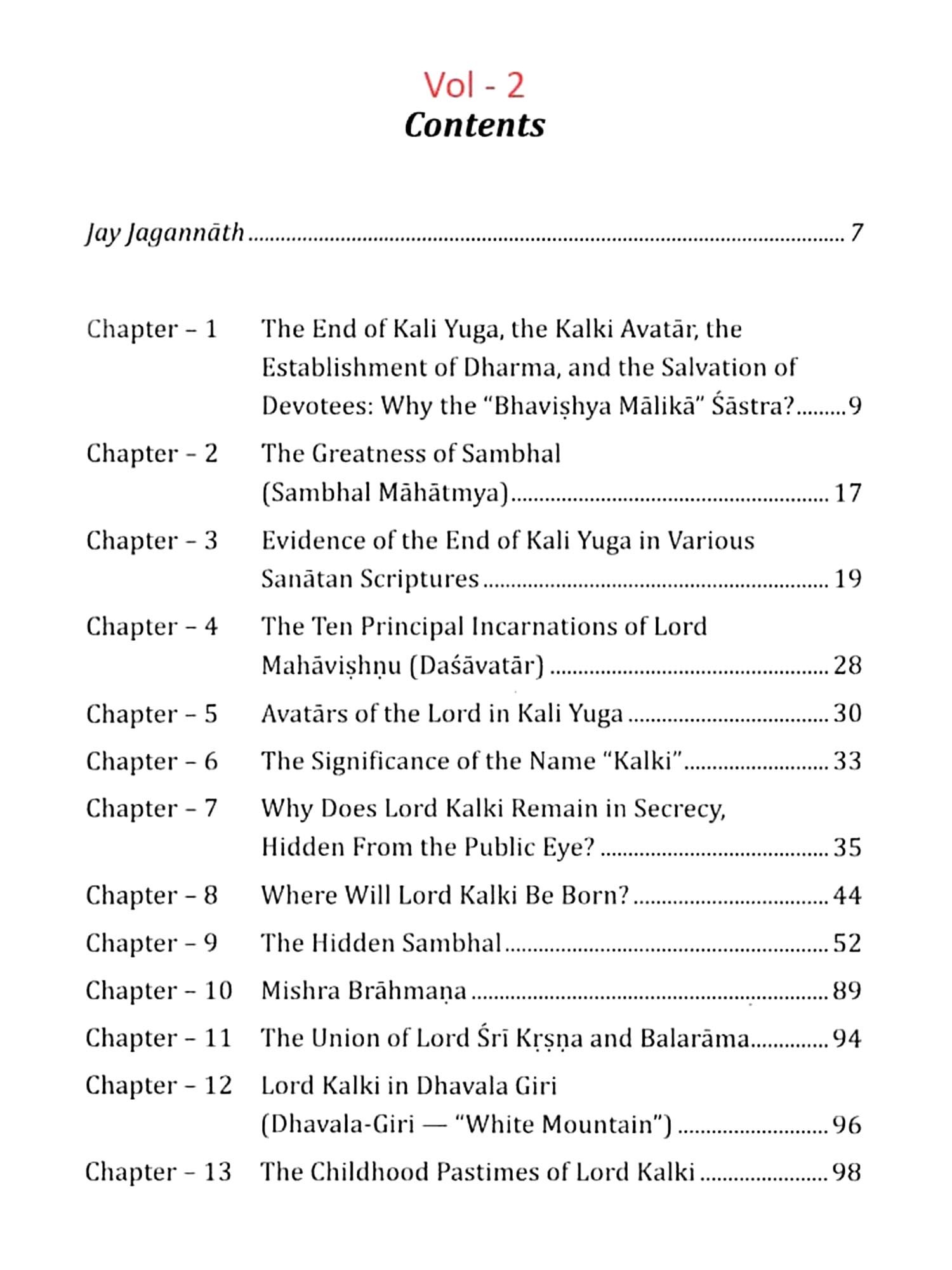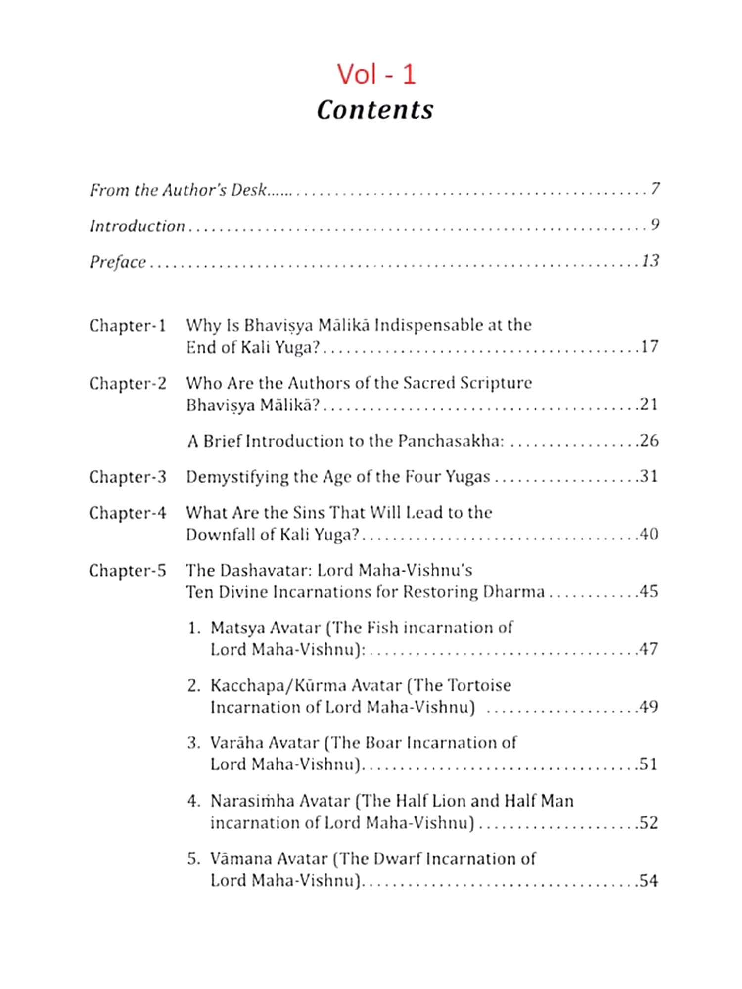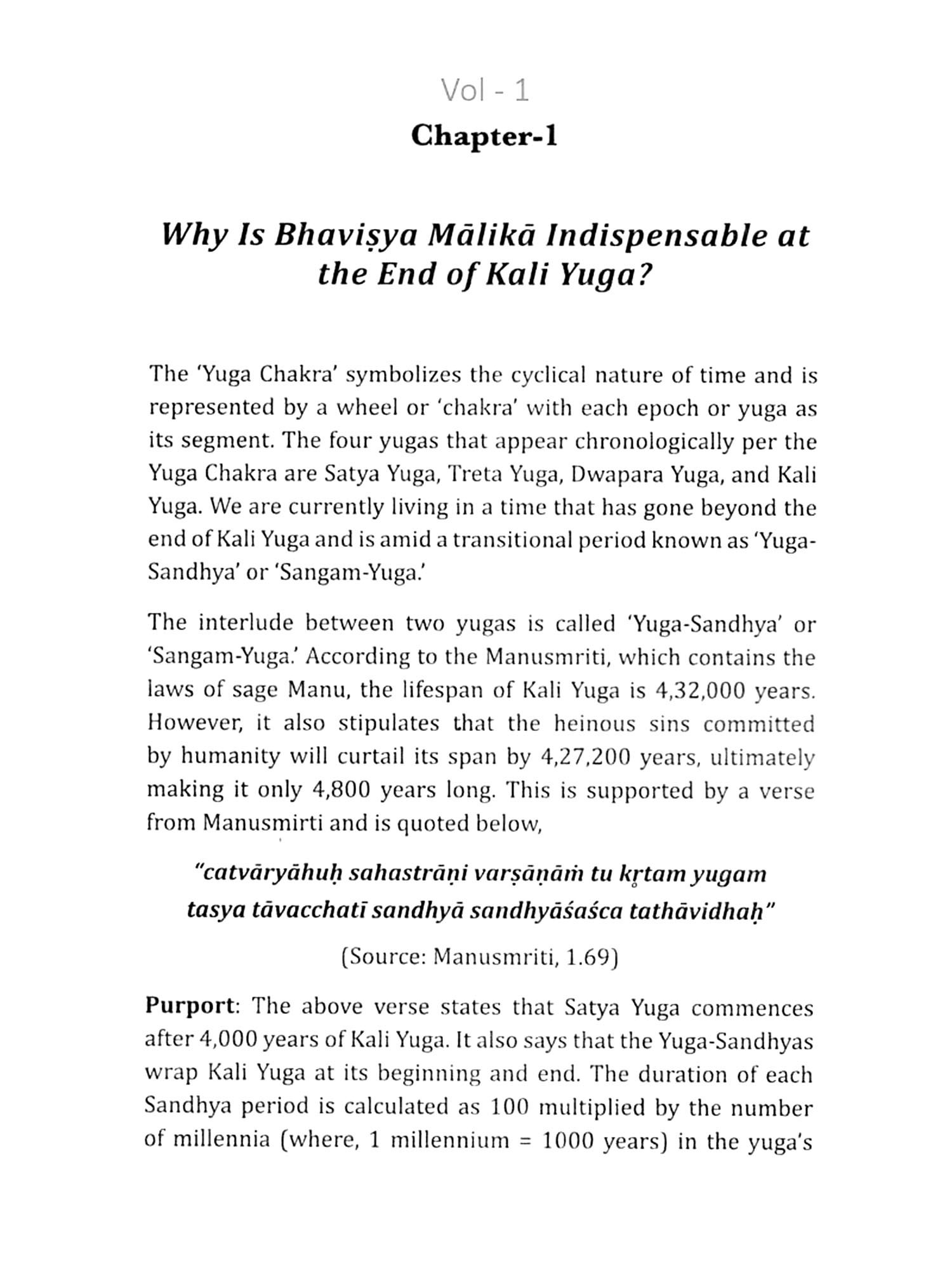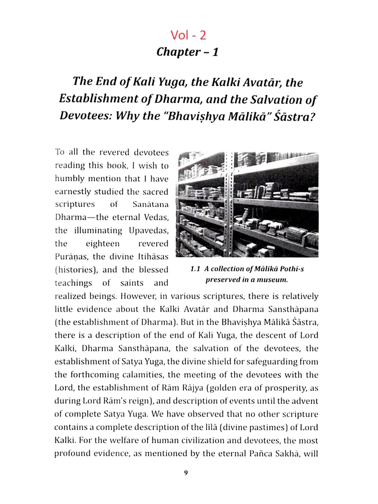 "Bhavisya Mâlika" is an ancient series of texts that contains information about the actions of the Supreme Lord, Maha- Vishnu, especially at the end of Kali Yuga when He descends on Earth for the upliftment and re-establishment of Dharma. Heralding His descent, the text offers insight into details such as His birth, the divine actions that He will perform, His meetings with His devotees, the condition of the world at the time of his arrival, and once He incarnates how He will perform the act of re- establishment of Dharma in the world and guide the world from one Yuga (era) to another.