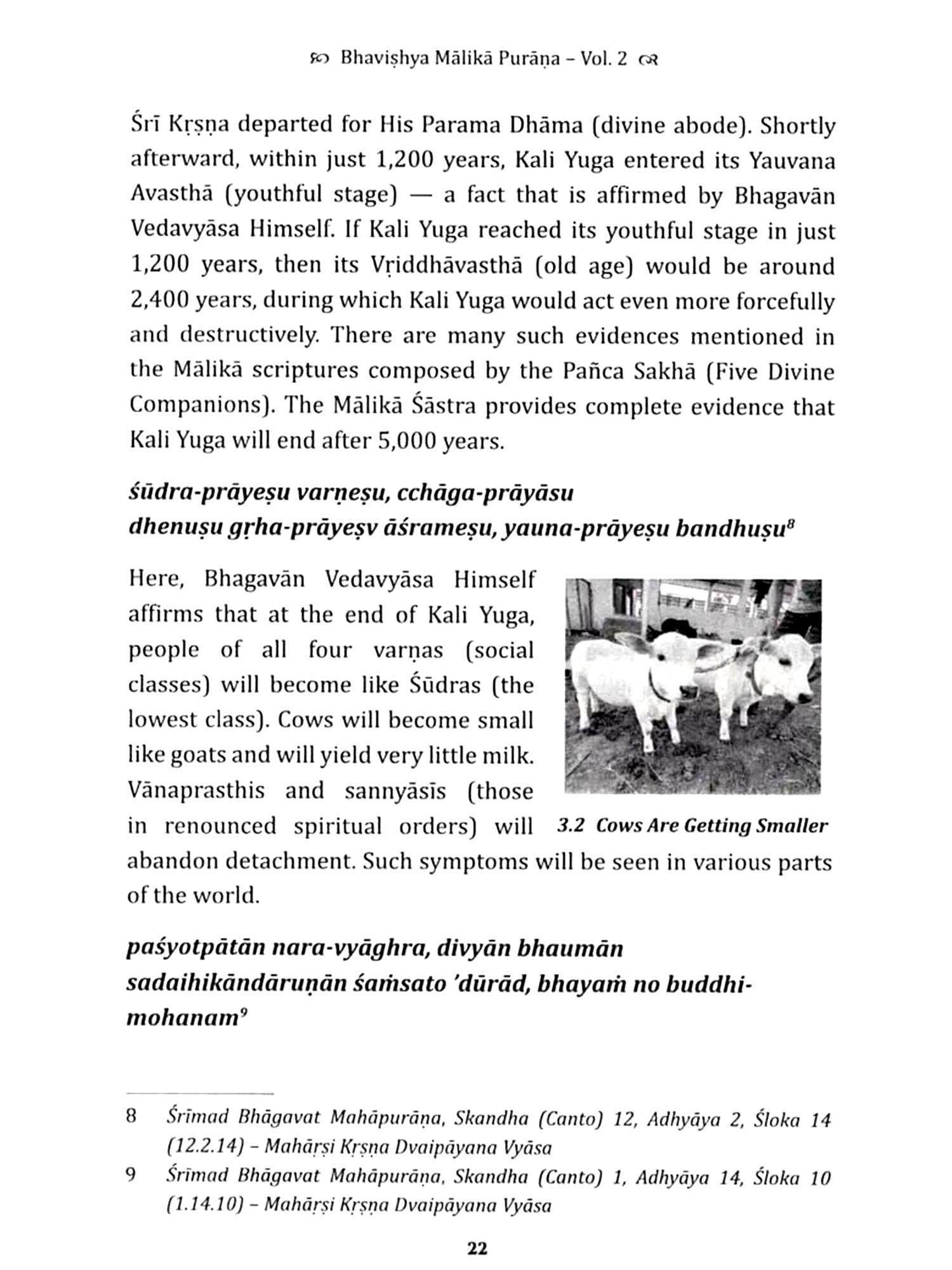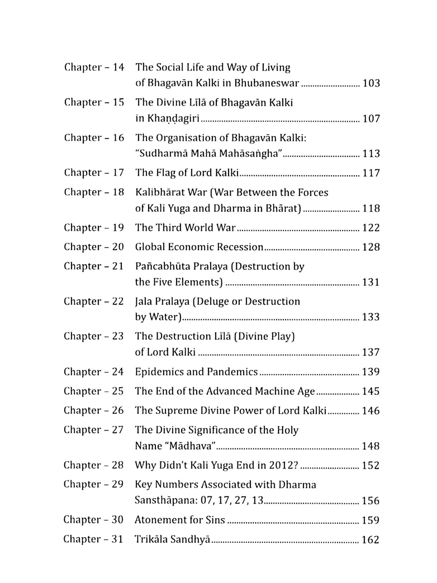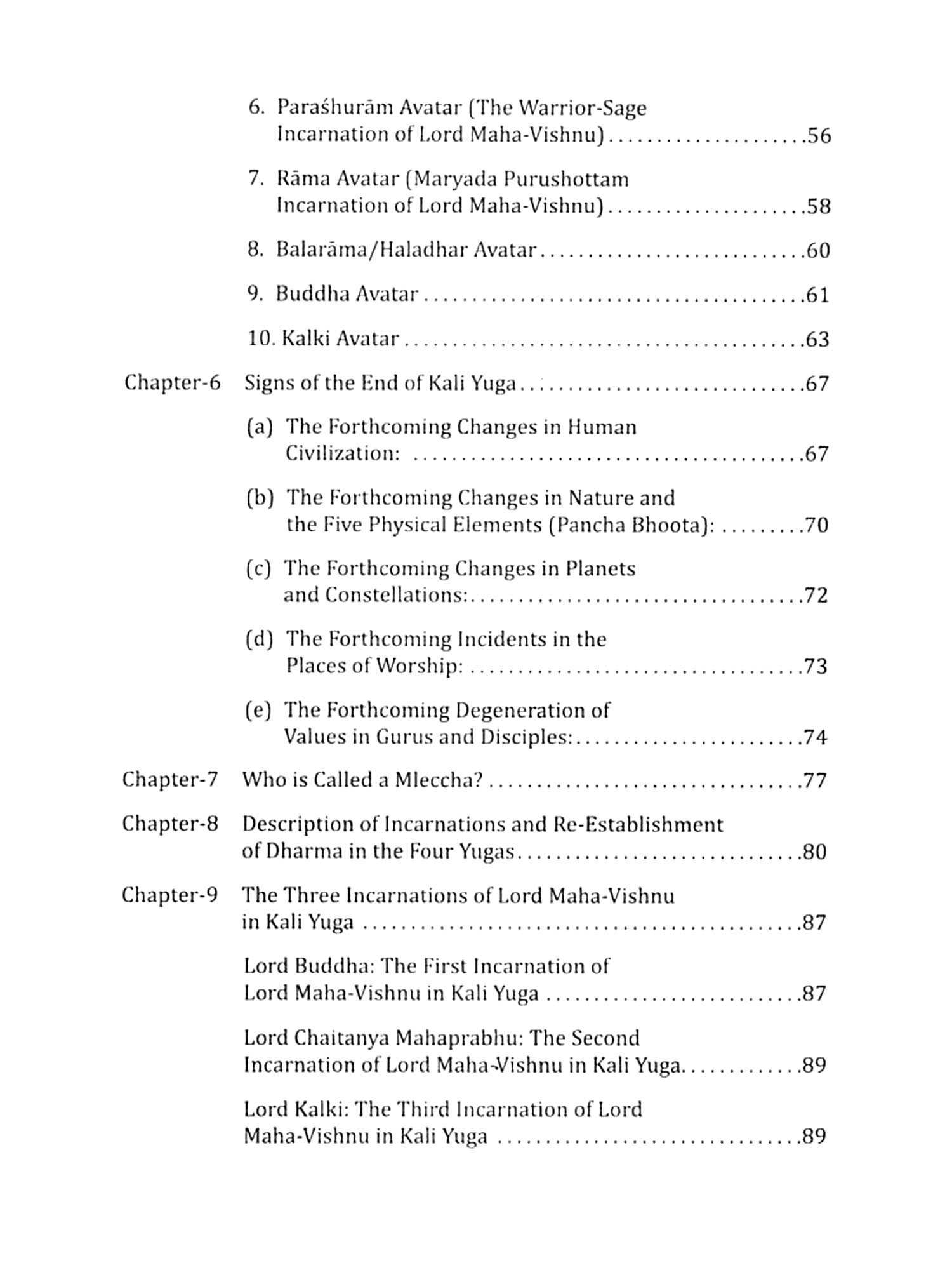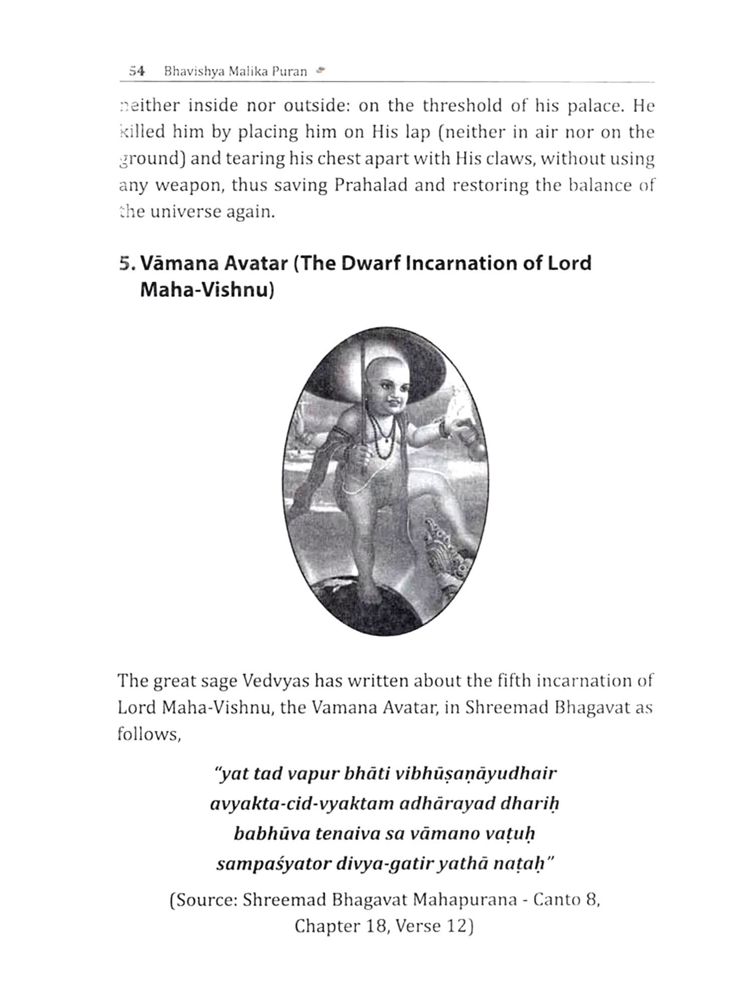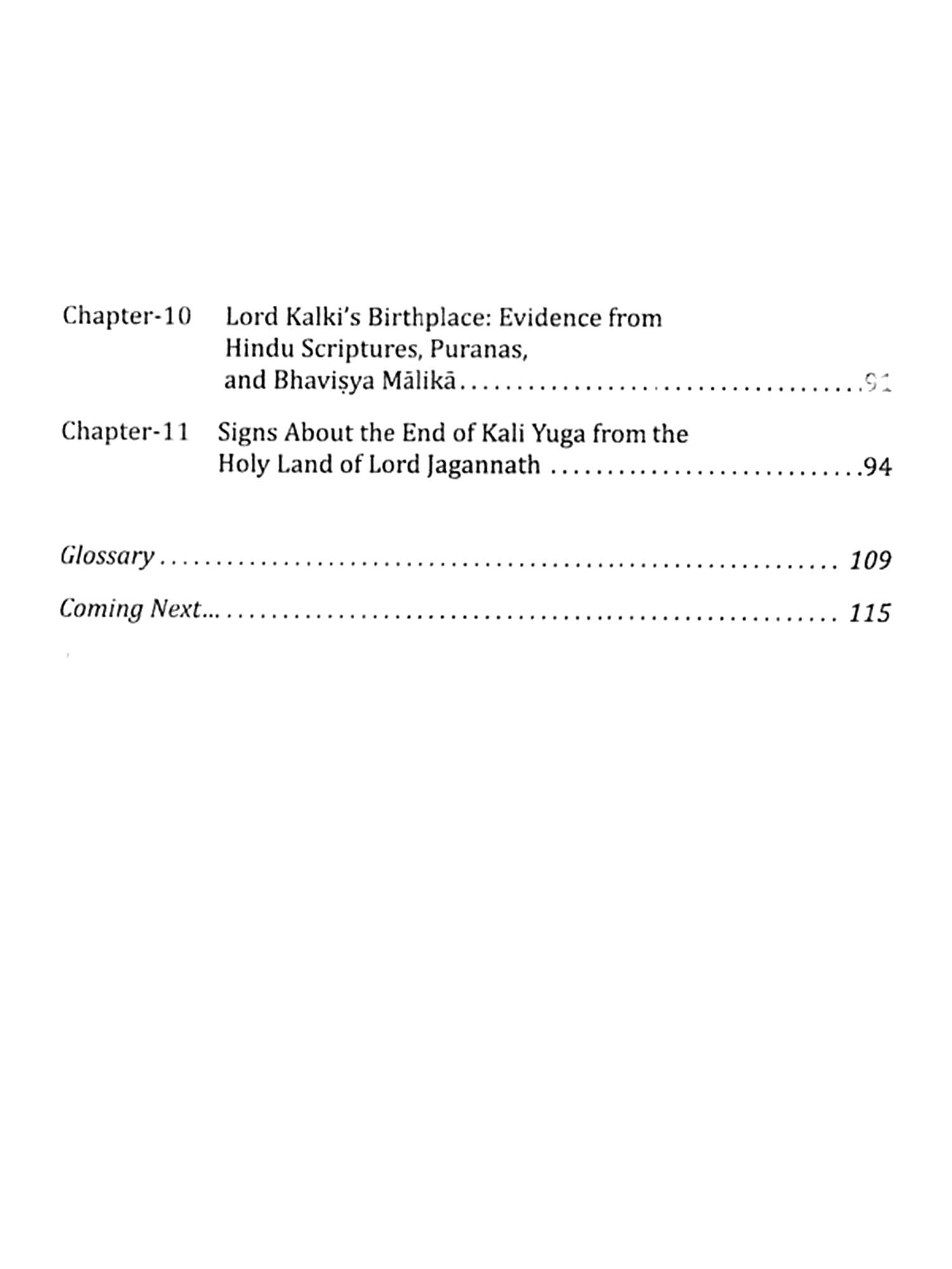 "Bhavisya Mâlika" is an ancient series of texts that contains information about the actions of the Supreme Lord, Maha- Vishnu, especially at the end of Kali Yuga when He descends on Earth for the upliftment and re-establishment of Dharma. Heralding His descent, the text offers insight into details such as His birth, the divine actions that He will perform, His meetings with His devotees, the condition of the world at the time of his arrival, and once He incarnates how He will perform the act of re- establishment of Dharma in the world and guide the world from one Yuga (era) to another.