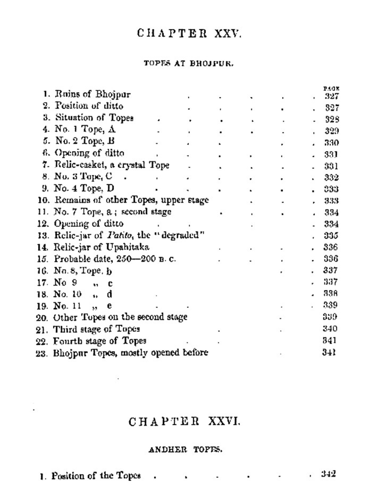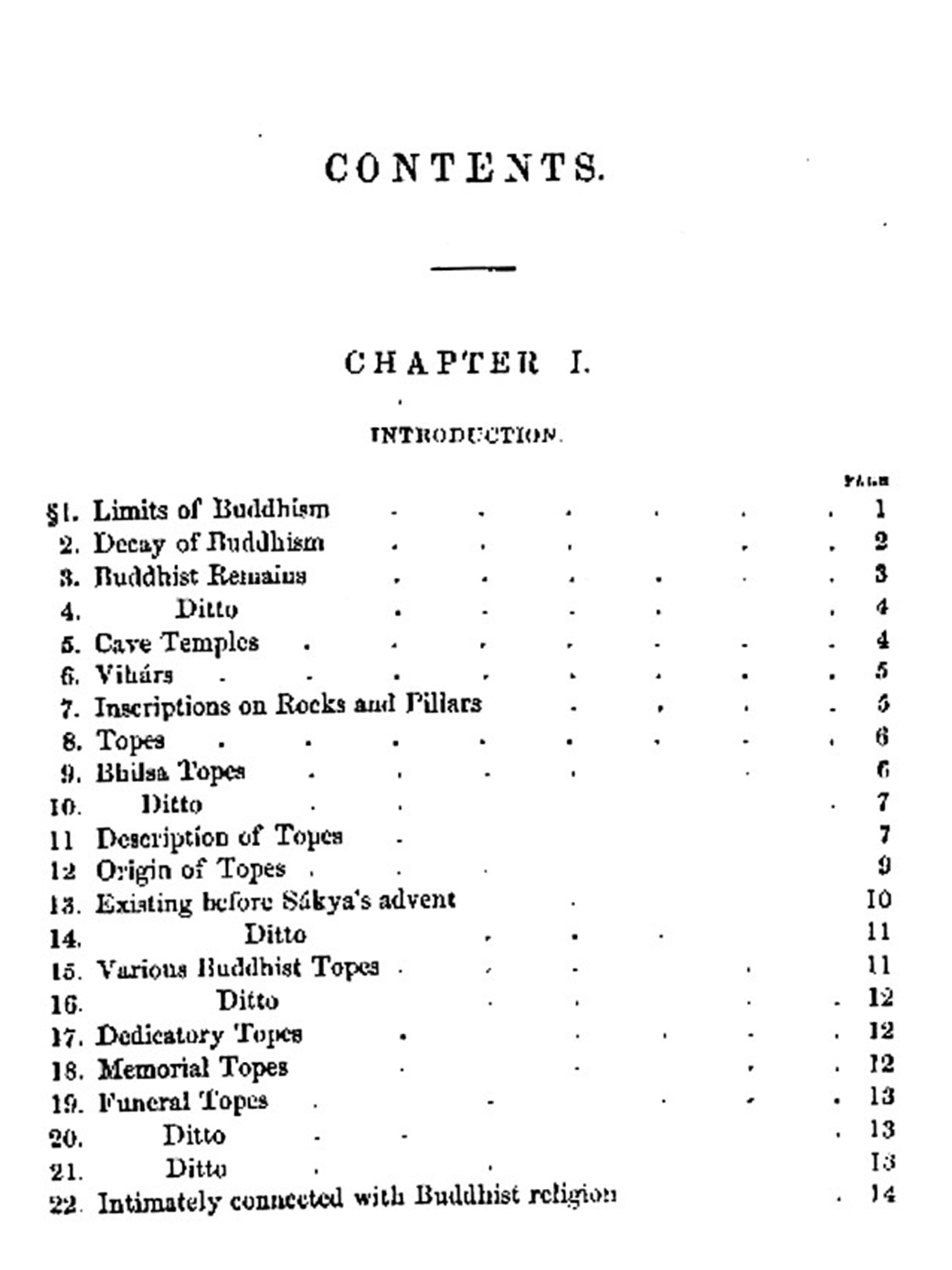 THE discoveries made by Lieutenant Maisey and myself, amongst the numerous Buddhist monuments that still exist around Bhilsa, in Central India, are described - imperfectly, I fear by myself in the present work. To the Indian antiquary and historian, these discoveries will be, I am willing to think, of very high importance; while to the mere English reader they may not be uninteresting, as the massive mounds are surrounded by mysterious circles of stone pillars, recalling attention at every turn to the early earthworks, or barrows, and the Druidical colonnades of Britain.