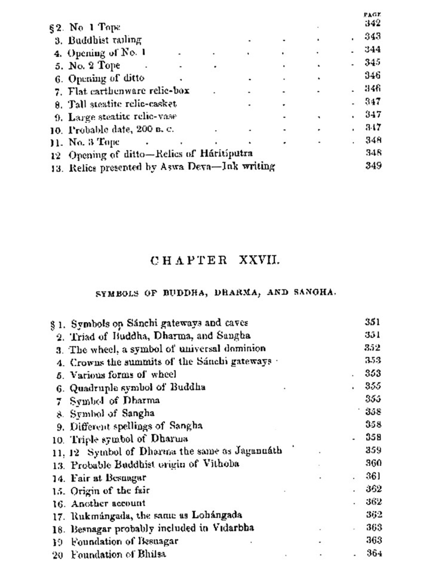 Alexander Cunningham's seminal work, The Bhilsa Topes, first published in 1854, offers a comprehensive description of these monuments. It represents the earliest serious effort to trace Buddhist history through architectural remains. Cunningham's work provides an extensive historical account covering the rise, development, and decline of Buddhism; the life and teachings of the Buddha; the Buddhist councils; various schisms; the reign of Ashoka; and the symbols of Buddha, Dharma, and Sangha, among other key aspects of Buddhism.