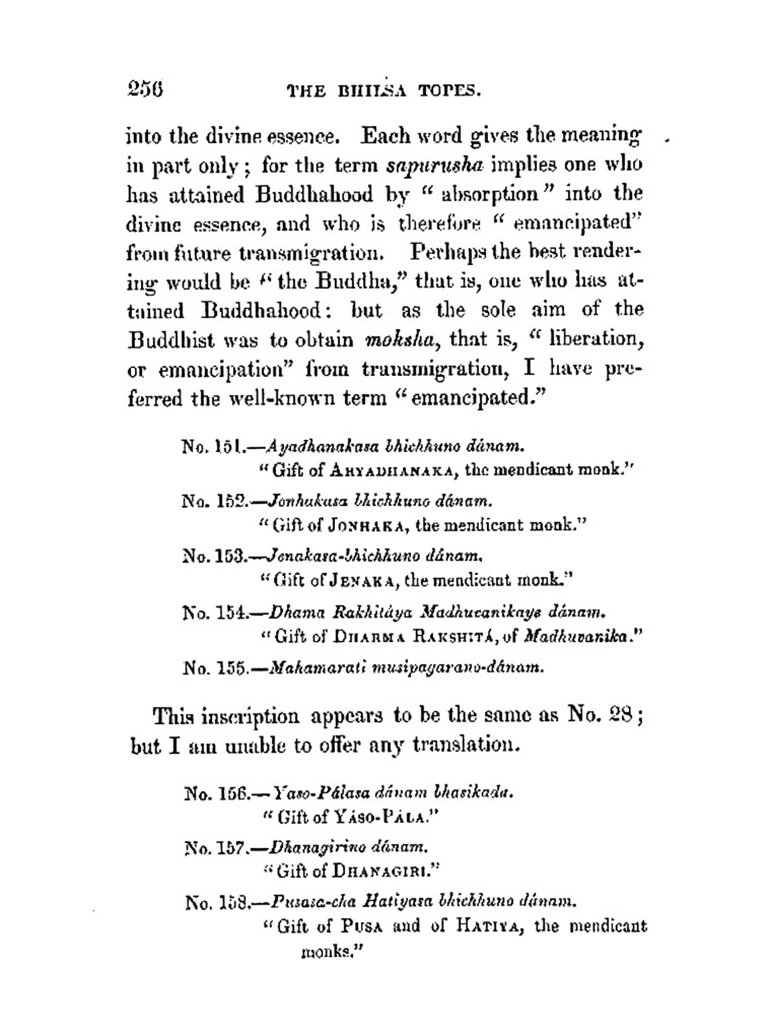 In the Buddhistical worship of trees displayed in the Sanchi bas-reliefs, others, I hope, will see (as well as myself) the counterpart of the Druidical and adopted English reverence for the Oak. In the horse-shoe temples of Ajanta and Sanchi many will recognise the form of the inner colonnade at Stone-henge. More, I suspect, will learn that there are Cromlechs in India as well as in Britain;† that the Brahmans, Buddhists, and Druids all believed in the transmigration of the soul; that the Celtic language was undoubtedly derived from the Sanskrit; and that Buddha (or Wisdom), the Supreme Being worshipped by the Buddhists, is probably (most probably) the same as the great god Buddwás, considered by the Welsh as the dispenser of good. These coincidences are too numerous and too striking to be accidental. Indeed, the Eastern origin of the Druids was suspected by the younger Pliny, who says, "Even to this day Britain celebrates the magic rites with so many similar ceremonies, that one might suppose they had been taken from the Persians."