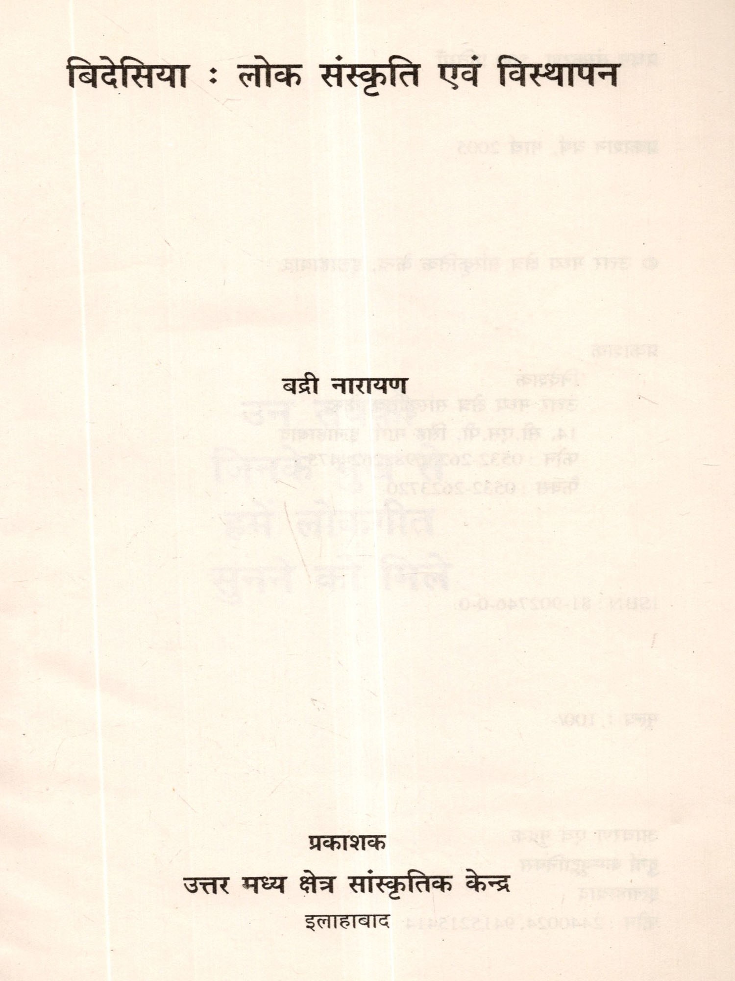 विहार की लोक जीवन एवं विशेष रूप से श्रमिकों के विस्थापन की त्रासदी का चित्रण बिदेसिया लोक नाट्य से करने वाले नाटककार श्री भिखारी ठाकुर के योगदान को संरक्षित, संवर्द्धित तथा जन-जन तक पहुँचाने के उद्देश्य से 'विदेसिया' पुस्तक का प्रकाशन केन्द्र द्वारा किया जा रहा है। इसके लेखक श्री बद्री नारायण ने बिहार के विभिन्न क्षेत्रों में भ्रमण कर अथक परिश्रम के पश्चात् सामग्री का संकलन किया है। उत्तर मध्य क्षेत्र सांस्कृतिक केन्द्र उनके सार्थक प्रयास के लिए साधुवाद देता है। यह प्रकाशन सुधी पाठकों को बिदेसिया के विविध पक्षों की किंचित जानकारी देने में सफल हुआ तो केन्द्र अपने प्रयास को सार्थक मानेगा।