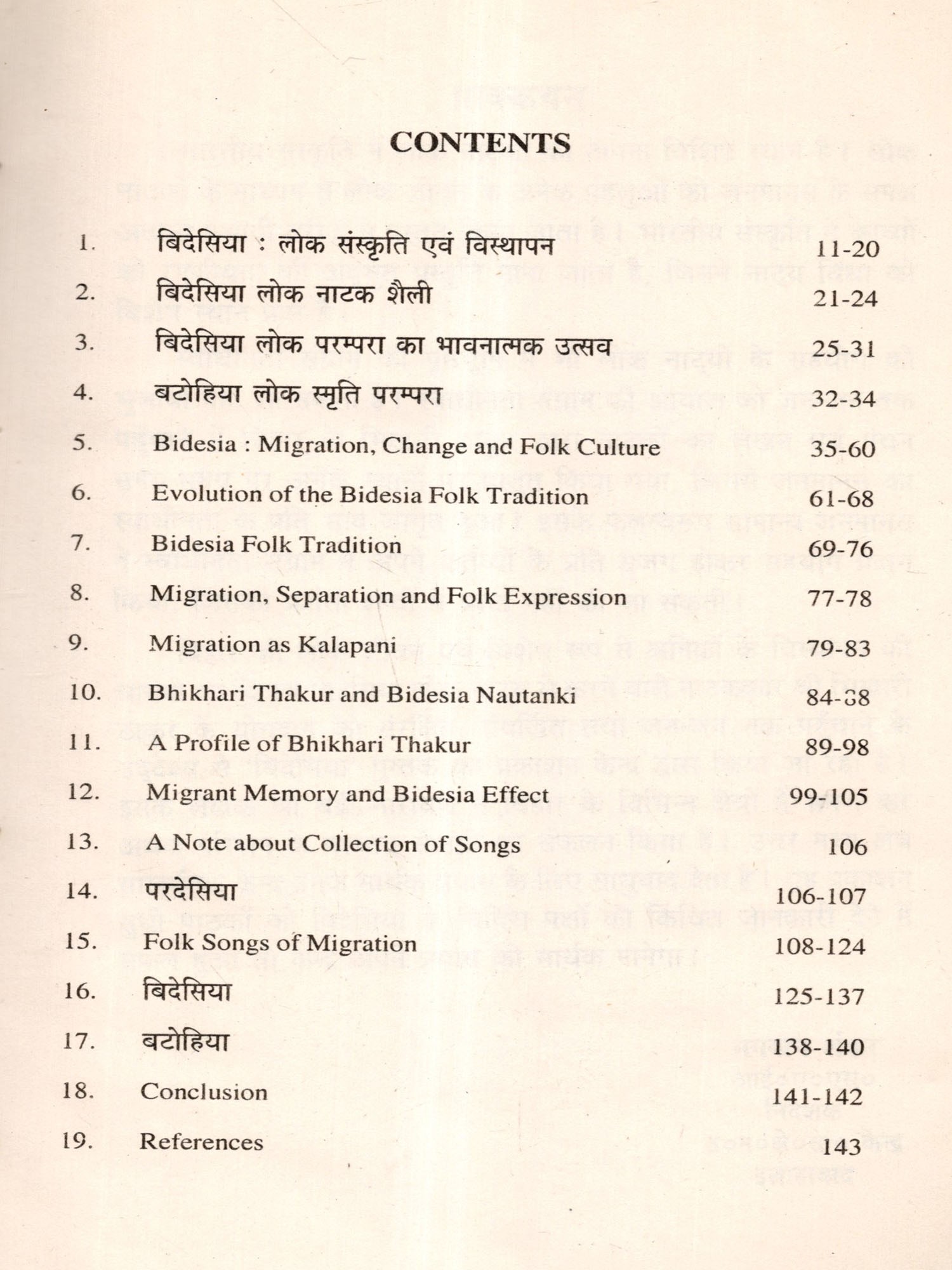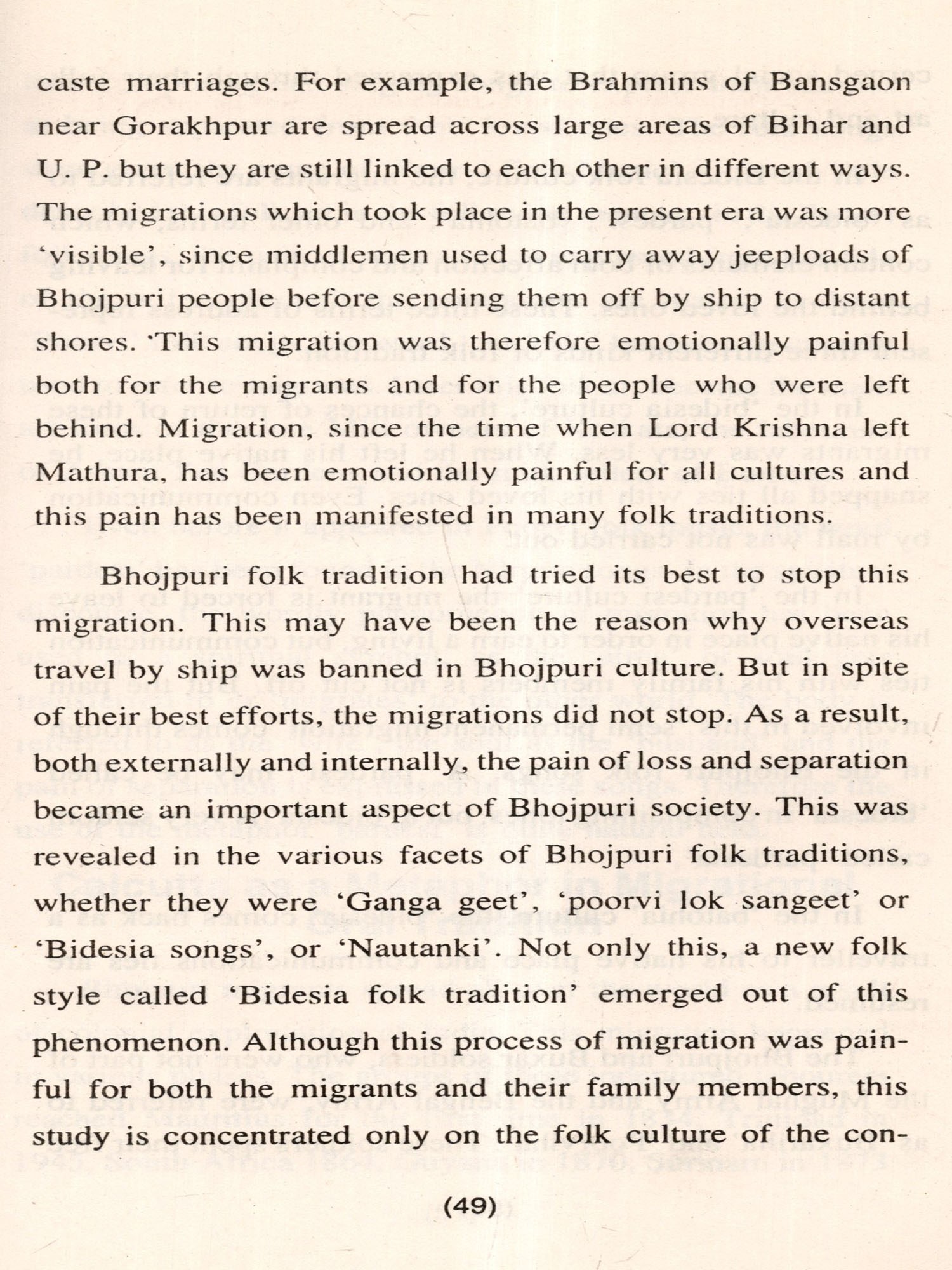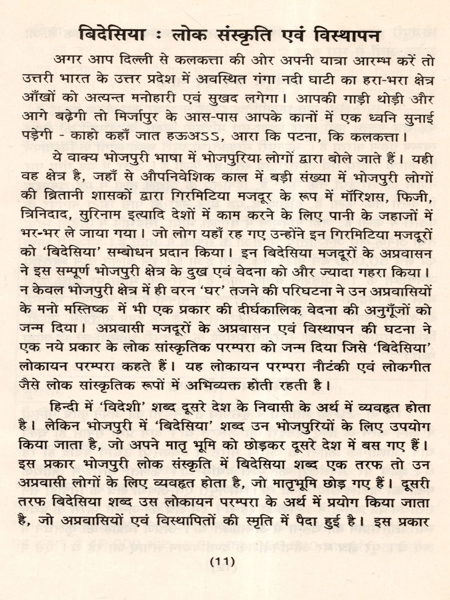The migration of the Bhojpuari indentured labourers caused a heavy emotional loss and suffering, both for the migrants and for their loved ones who were left behind. This pain gave birth to a distinct folklore and cultural tradition in the Bhojpuri region as well as among the migrant communities at the destination points. This folk culture was given the name Bidesia Folk Culture. The present study aims to explore the emergence of this folk culture and collect and document the various expressions of this cultural tradition.