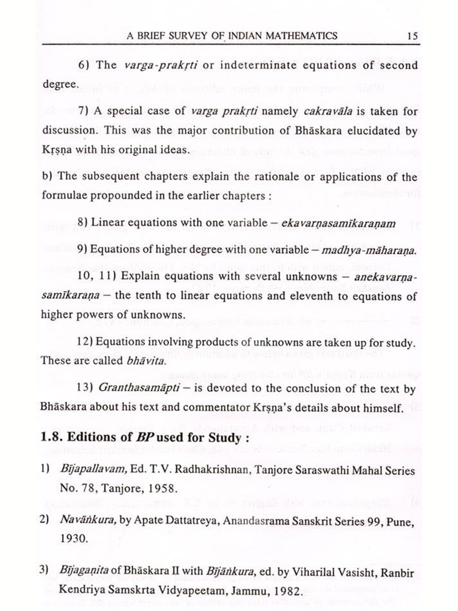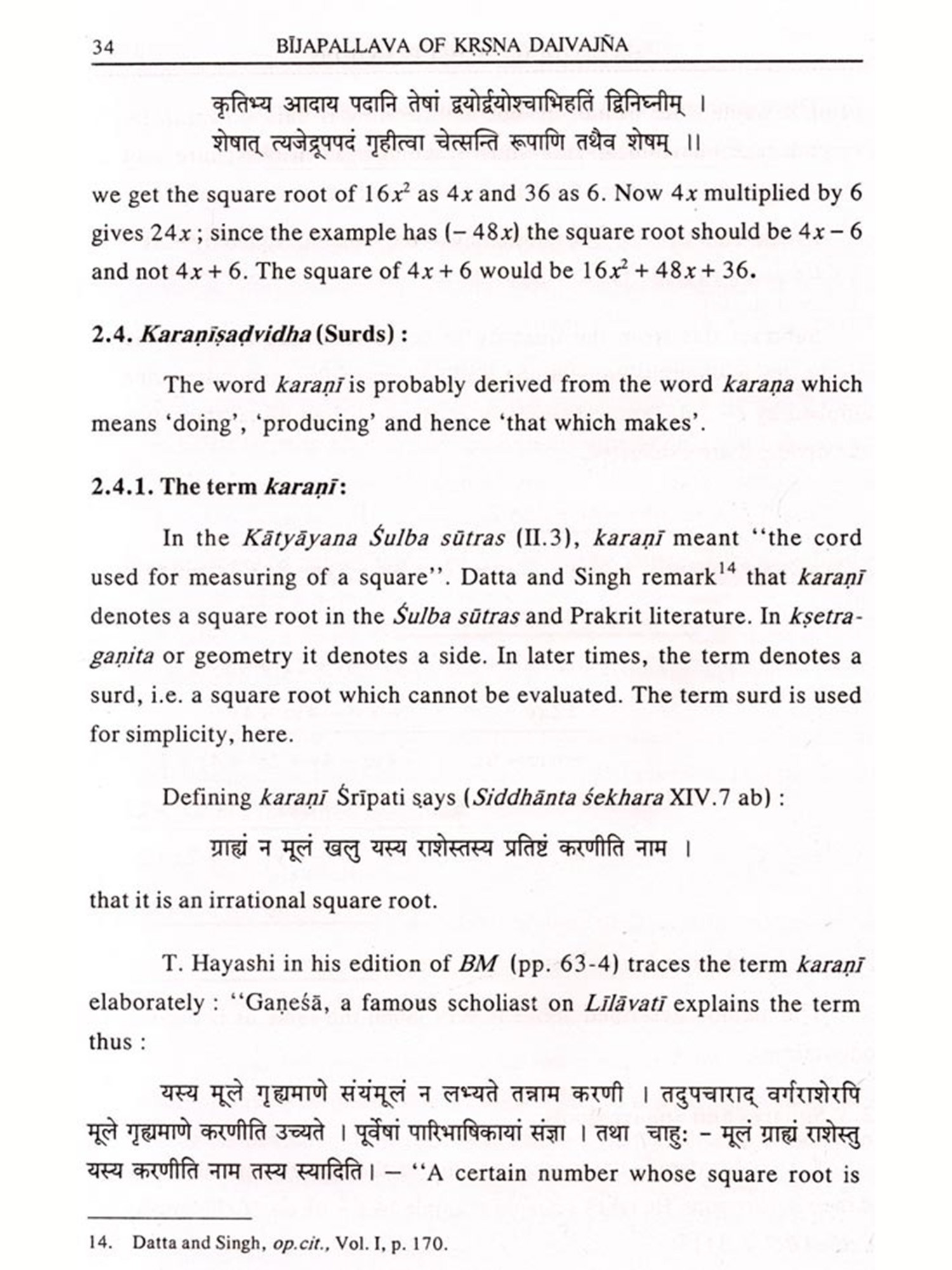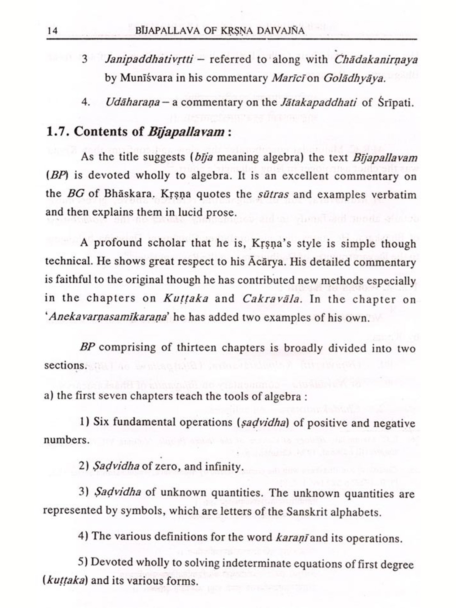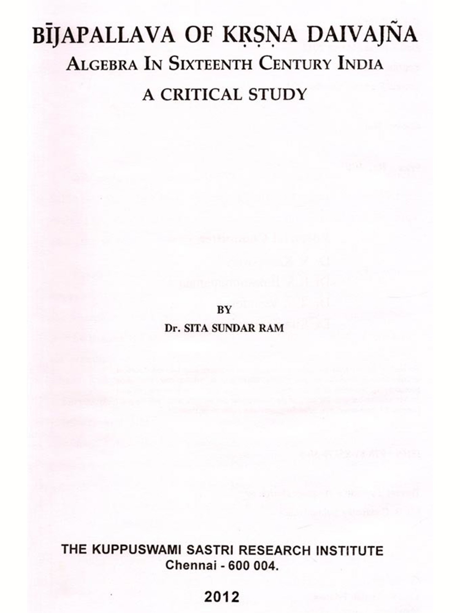 It is indeed gratifying that the Kuppuswami Sastri Research Institute is publishing Dr. Sita's Ph.D. thesis, which is a pioneering study of Krsoa Daivajña's famous commentary Bijapallava on the Bijaganita of the celebrated mathematician-astronomer Bhaskaräcärya.