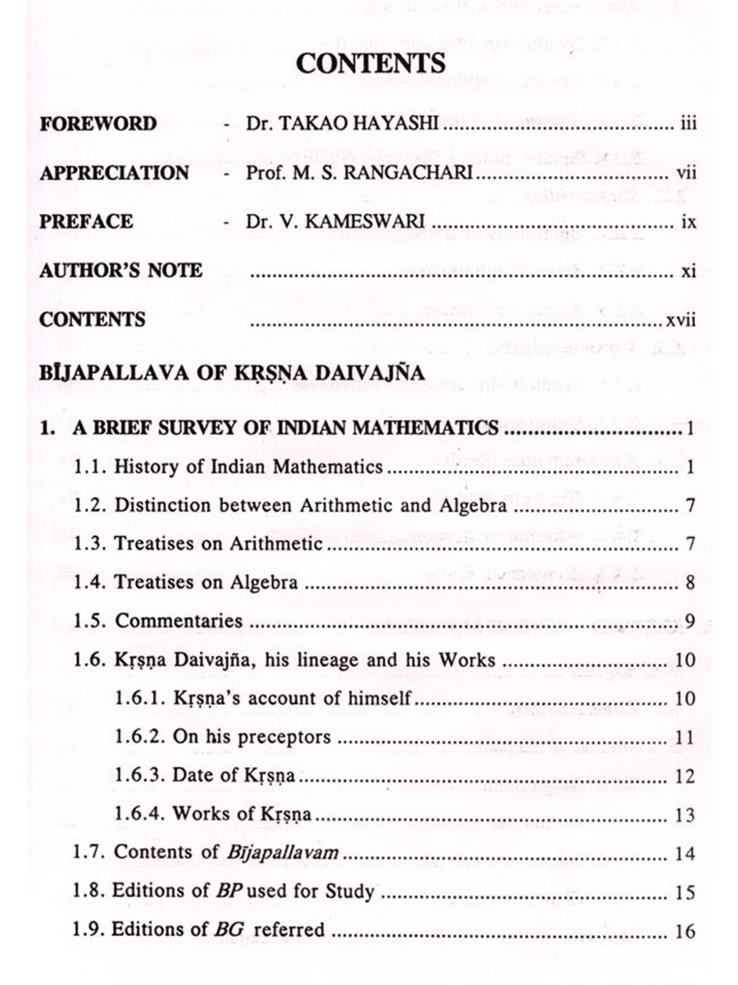 I take great pride in writing the preface to this publication of the Institute, Bijapallava of Krsna Daivajña, critically studied by Dr. Sita Sundar Ram. She was awarded the Ph.D. degree by the University of Madras for the same, prepared and submitted under my supervision, in the year 2008. The thesis was much appreciated by the examiners and Dr. T. Hayashi, one of the examiners (also has written the Foreword here) strongly recommended the publication of the thesis at the earliest. Accordingly, it was taken up for publication by the Institute. The Institute has been publishing, from its inception, critical editions of texts related to Indian mathematics and astronomy. The Journal of Oriental Research, Madras, published by the Institute also contains articles pertaining to these subjects. Savants like Prof. T.S. Kuppanna Sastri, Prof. D.D. Kosambi, Dr. David Pingree, Dr. Arka Somayaji, Dr. K.V. Sarma and Dr. George Abraham, were involved in such academic endeavours of the Institute. Presently, Dr. M.S. Rangachari, Dr. S. Kannan, Dr. S. Madhavan, Dr. Takao Hayashi, Dr. M.D. Srinivas and others are also associated with the Institute. The text Sadratnamālā of Sankaravarman, on Indian astronomy and mathematics, with English translation and notes by Dr. S. Madhavan (Former Prof. of Mathematics, University College, Thiruvananthapuram), was published by the Institute, recently in 2011. Bijapallava of Krsna Daivajña is a landmark in this continued research activity on the part of the Institute in the field of Indian mathematics and astronomy. Ir was possible for Dr. Sita to produce such a work, since she is a graduate in Mathematics and post graduate in Sanskrit. The knowledge of both the subjects helped her a lot in understanding the mathematical texts in Sanskrit. Registered for the Ph.D. in 2001 at the Institute under my supervision. Dr. Sita studied the text more than once with me In some places we met with the difficulty of presenting our understanding of the text in mathematical language Consultations with Dr. M.S. Rangachari (Former Director and Head, the Ramanujan Institute for Advanced Study in Mathematics, University of Madras), helped us a lot in synchronising the ancient mathematical methods with the modern ones. He always had the idea that Dr. Sita's thesis should definitely be published and accordingly suggested changes and modifications in the thesis to suit the publication. I am indeed grateful to him, both as Supervisor of Dr. Sita's thesis and as the Director of the Institute. I am deeply beholden to Dr. Takao Hayashi (Professor of History of Science, Doshisha University, Kyoto, Japan), who had very willingly accepted to write the Foreword to the book on our request and also for his valuable suggestions.