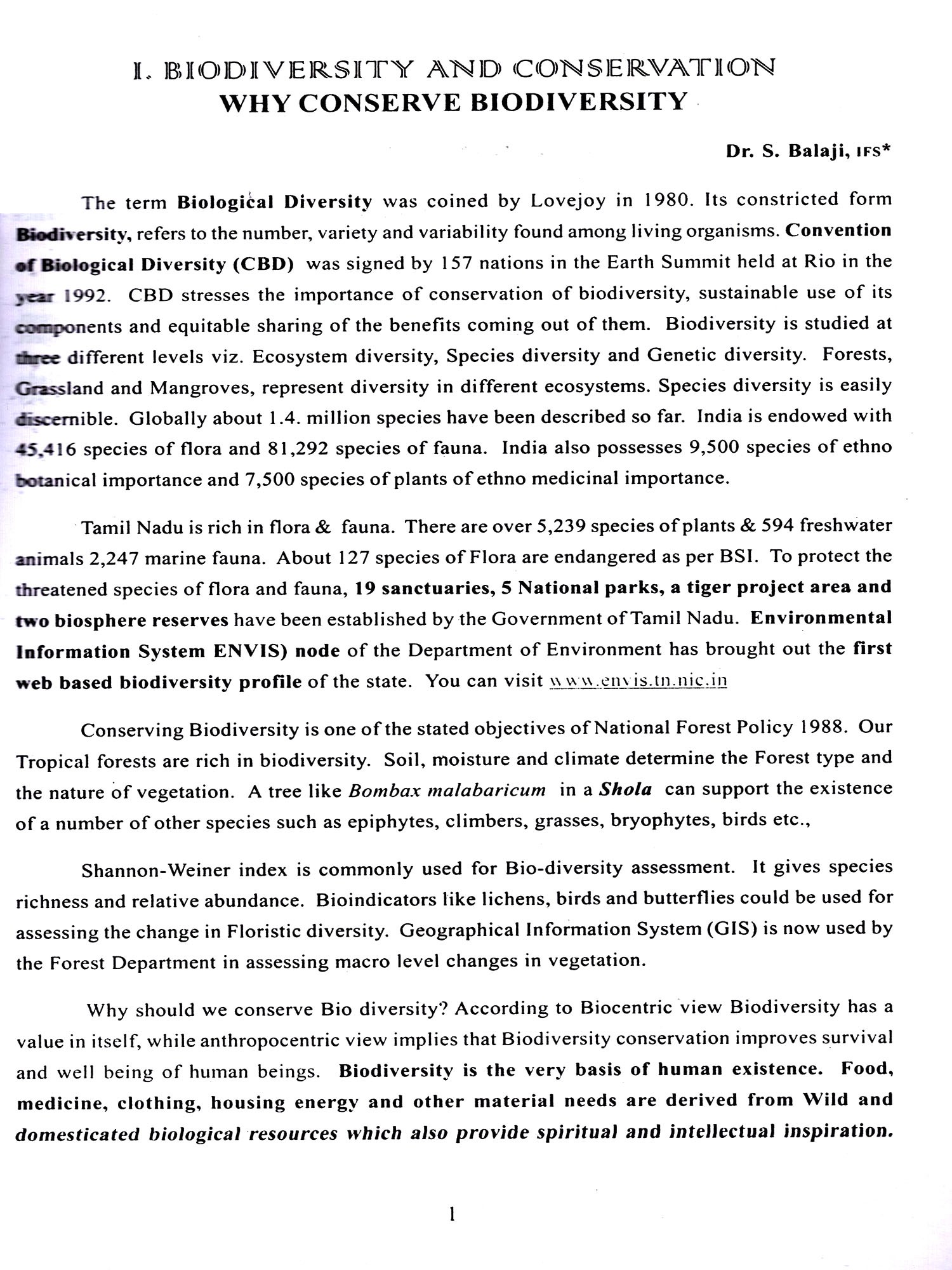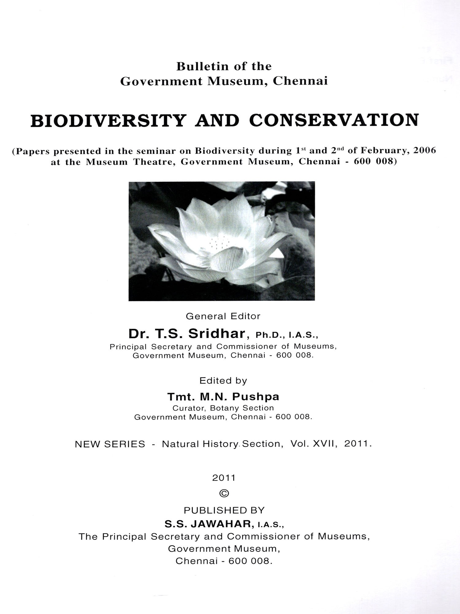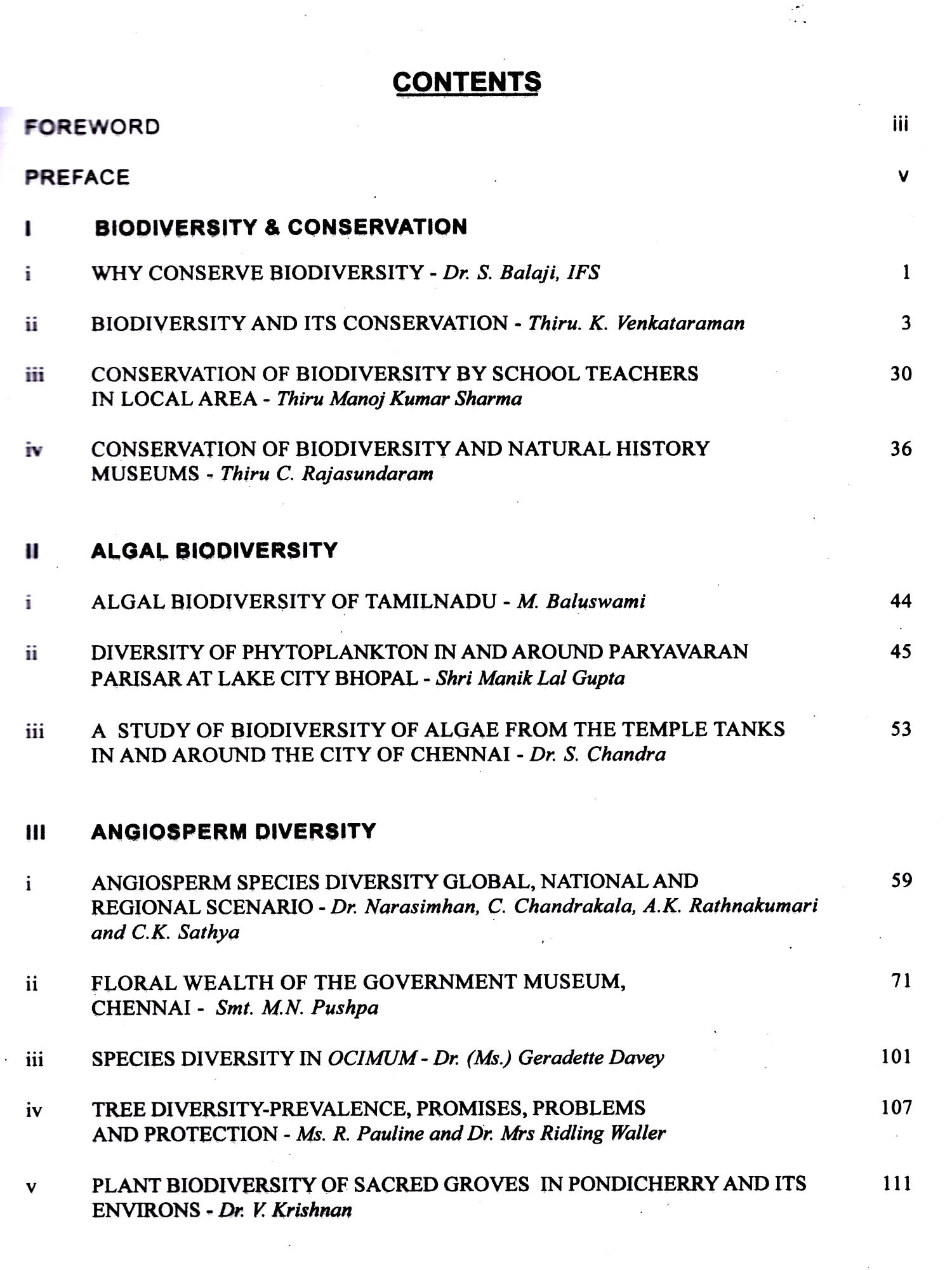 Government Museum, Chennai has different sections of which the Botany section is one. As a part of the educational activity of this section, they have conducted a Bio-diversity Seminar on 01-02-2006 and 02-02-2006. Eminent person's have participated in the seminar and presented papers on different themes. The papers highlight the importance of maintaining our ecological balance to prevent pollution, tsunami and other factors affecting the environment. To maintain pollution free atmosphere it is essential that the ecological niche should be a balanced one. In this regard, these papers presented during the seminar on biodiversity would definitely serve the needs of the scholars, researchers, students and public. I also appreciate the efforts taken by Tmt. M.N. Pushpa, Curator, Botany, in coordinating with the various scholars to participate and present papers in the seminar and in bringing out this publication effectively.