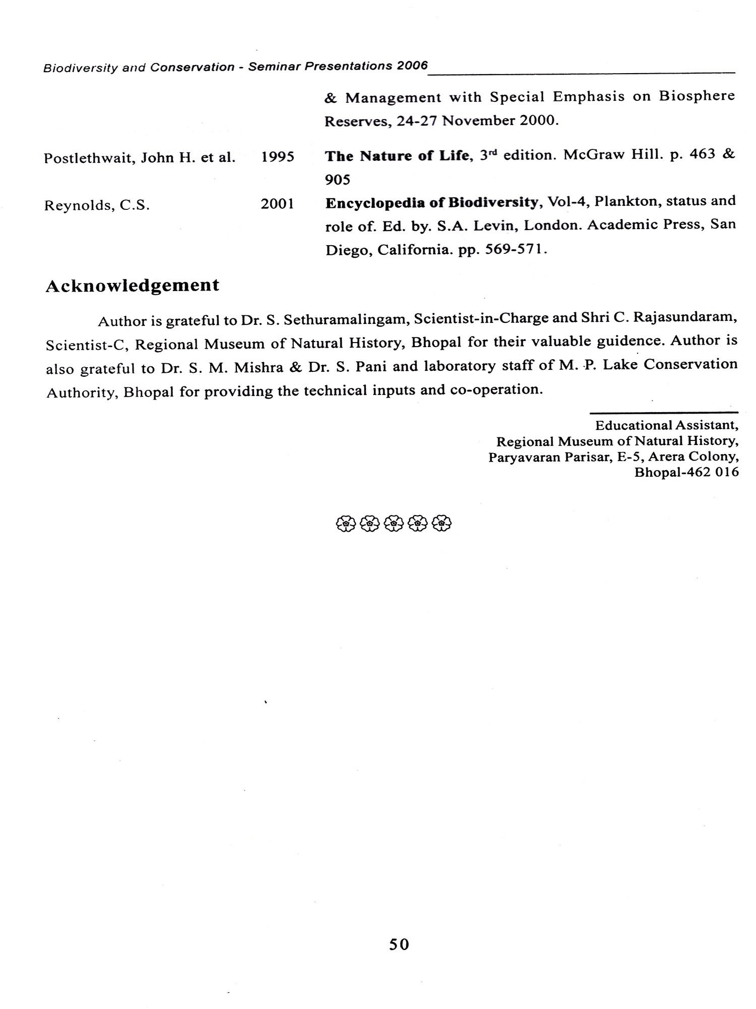 The seminar was conducted in four technical sessions covering the various aspects of flora and fauna. Thiru C.K. Sreedharan, I.F.S., the Principal Chief Conservator of Forest and Wild Life Warden, Department of Forest, Government of Tamil Nadu delivered the keynote address. I am much thankful to Dr. T.S. Sridhar, Ph.D., I.A.S., Principal Secretary and Commissioner of Museums for bringing out the seminar papers as museum publication.
