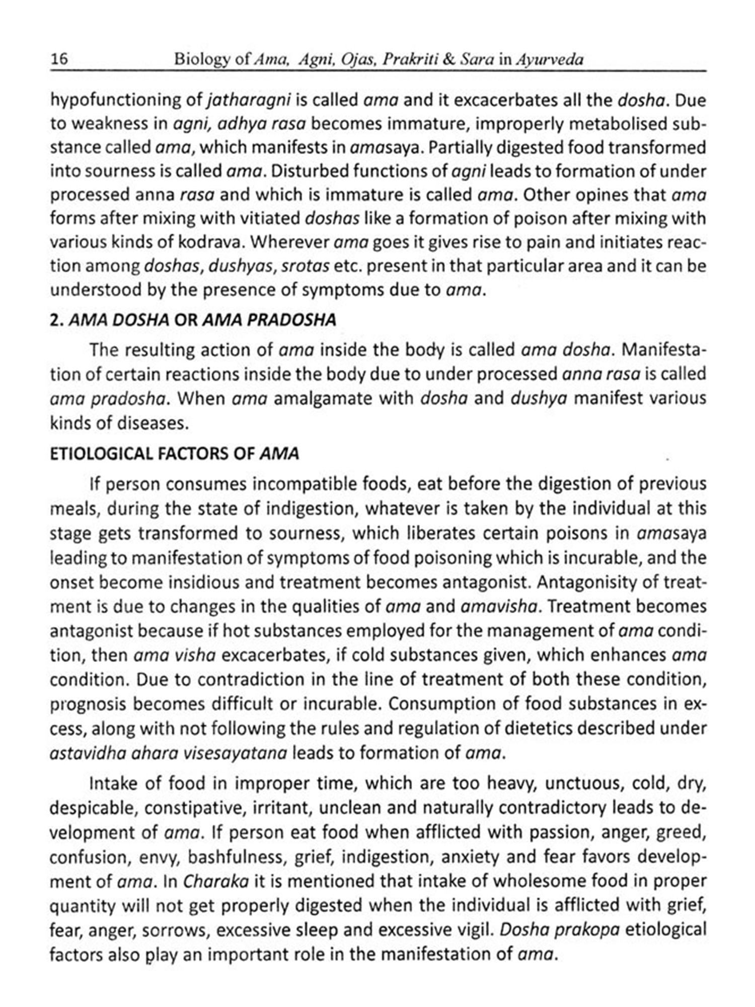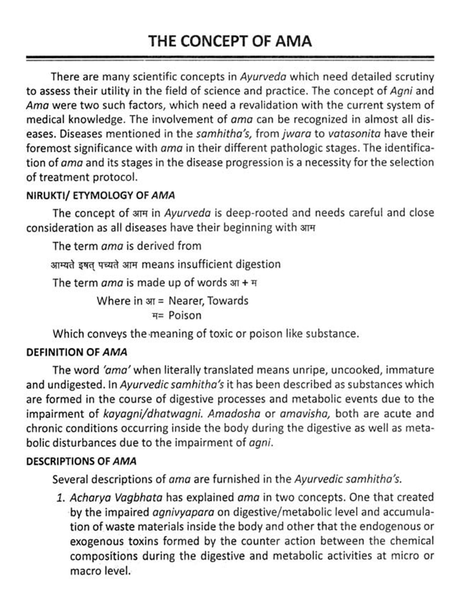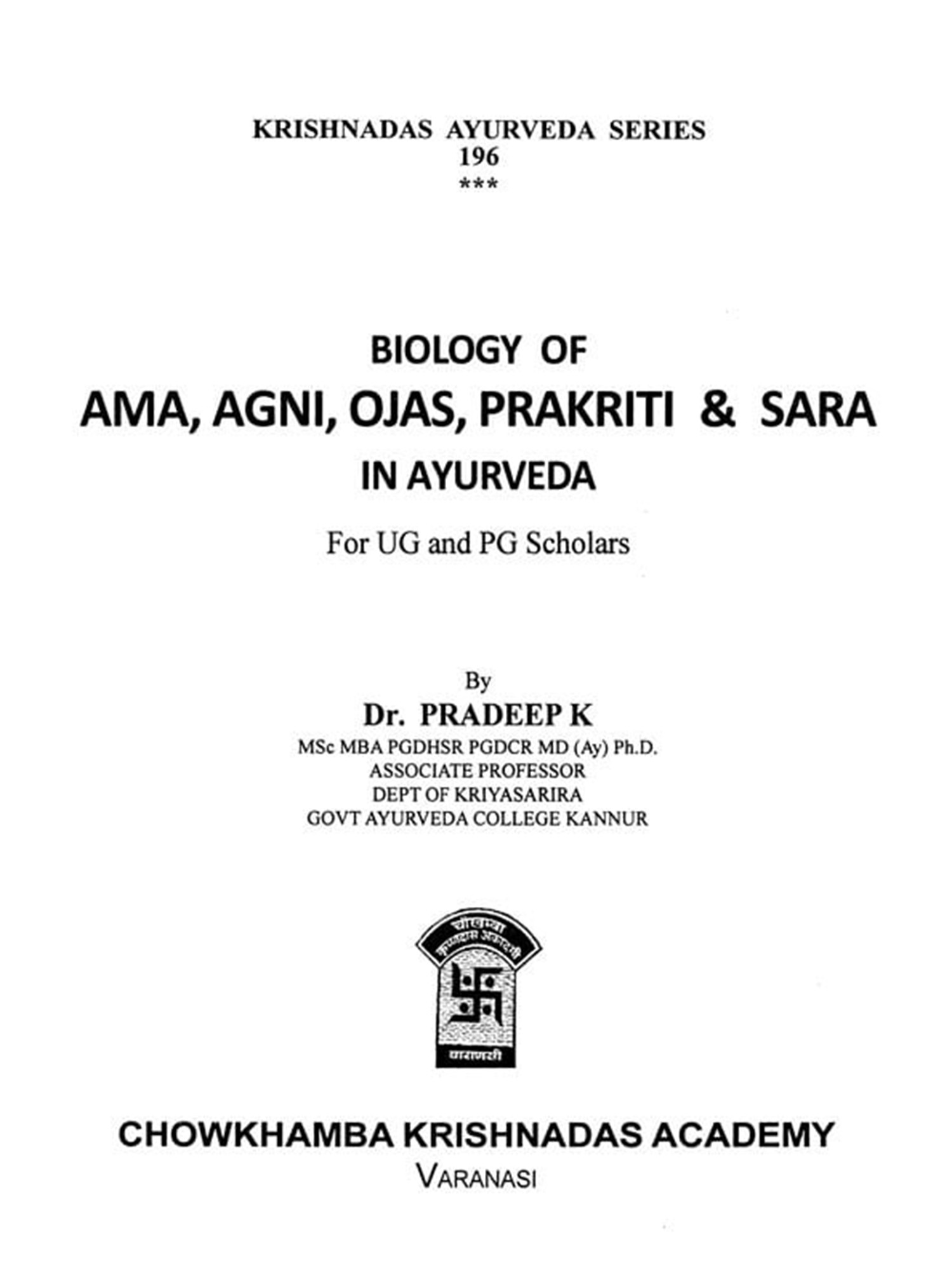 This book Biology of the Concepts Ama, Agni, Ojas, Prakriti & Sara in Ayurveda is primed for the UG & PG students of Ayurveda. These concepts are important from UG level education to PG level and also in the clinical side as well as in the research side. This handbook is a compiled work from all samhitas with links to modern concepts, which will enlighten the students in their clinical practice as well as in research. Available validated tools to assess these concepts were included in the book so that it will help the PG scholars in their research work. I sincerely invite the readers to feel free and write, expressing their frank opinions, critical comments and constructive suggestions.